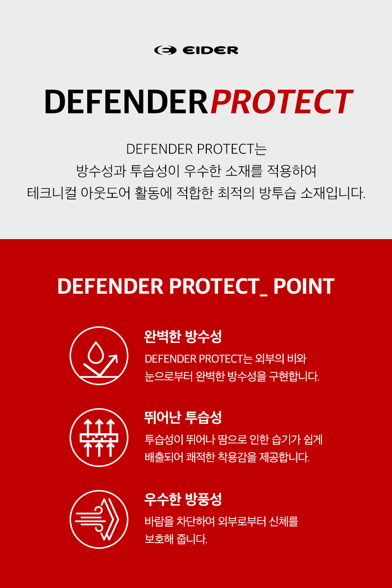 - 완벽한 방수성과 투습성의 DEFENDER PROTECT 방수 원단을 적용한 고기능성 WATER PROOF(방수) 자켓입니다.