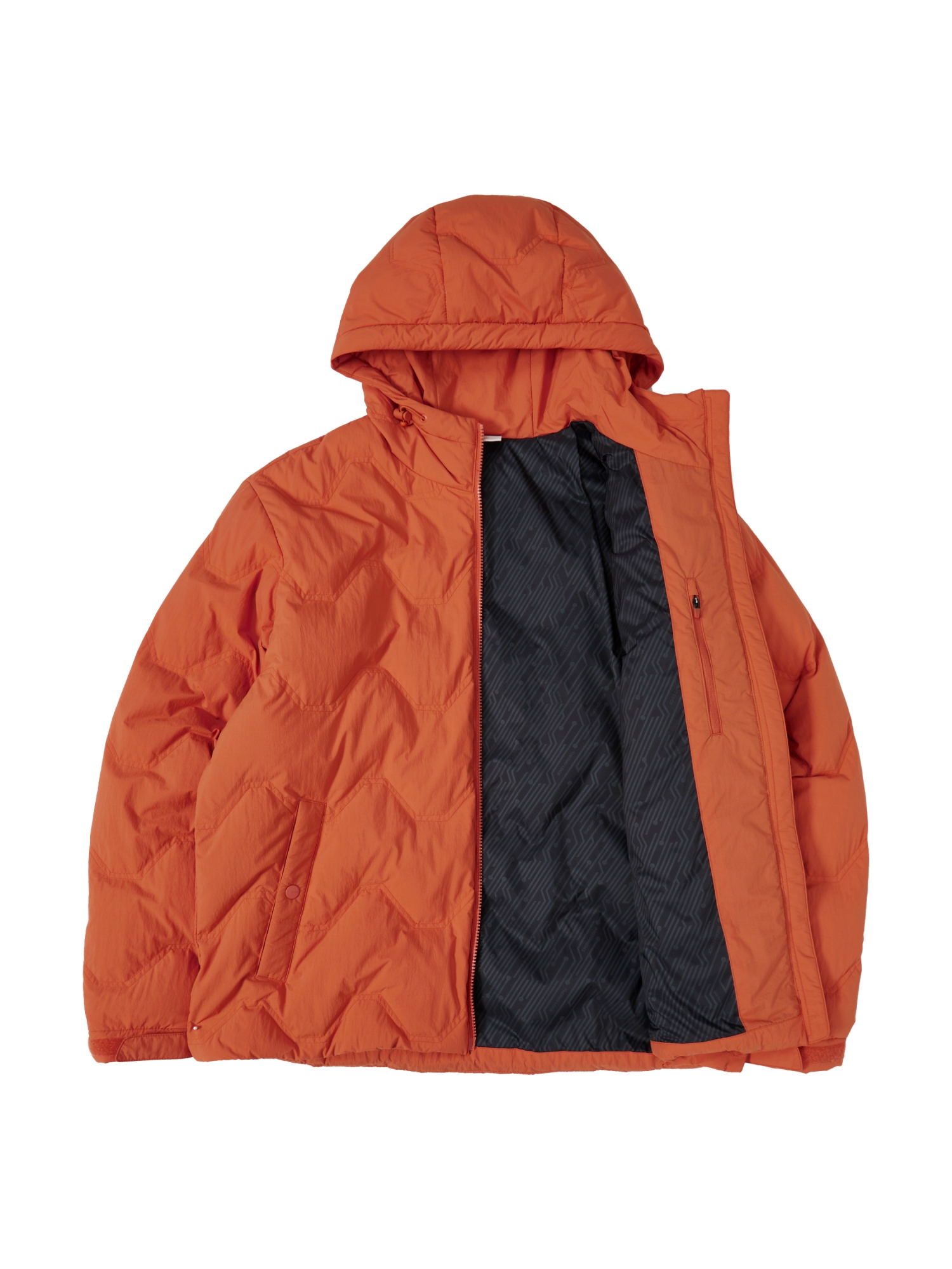 3. 후드 부착형 디자인과 가슴 절개 포켓, 이너 포켓, 사이드 포켓 등 수납성을 강화함