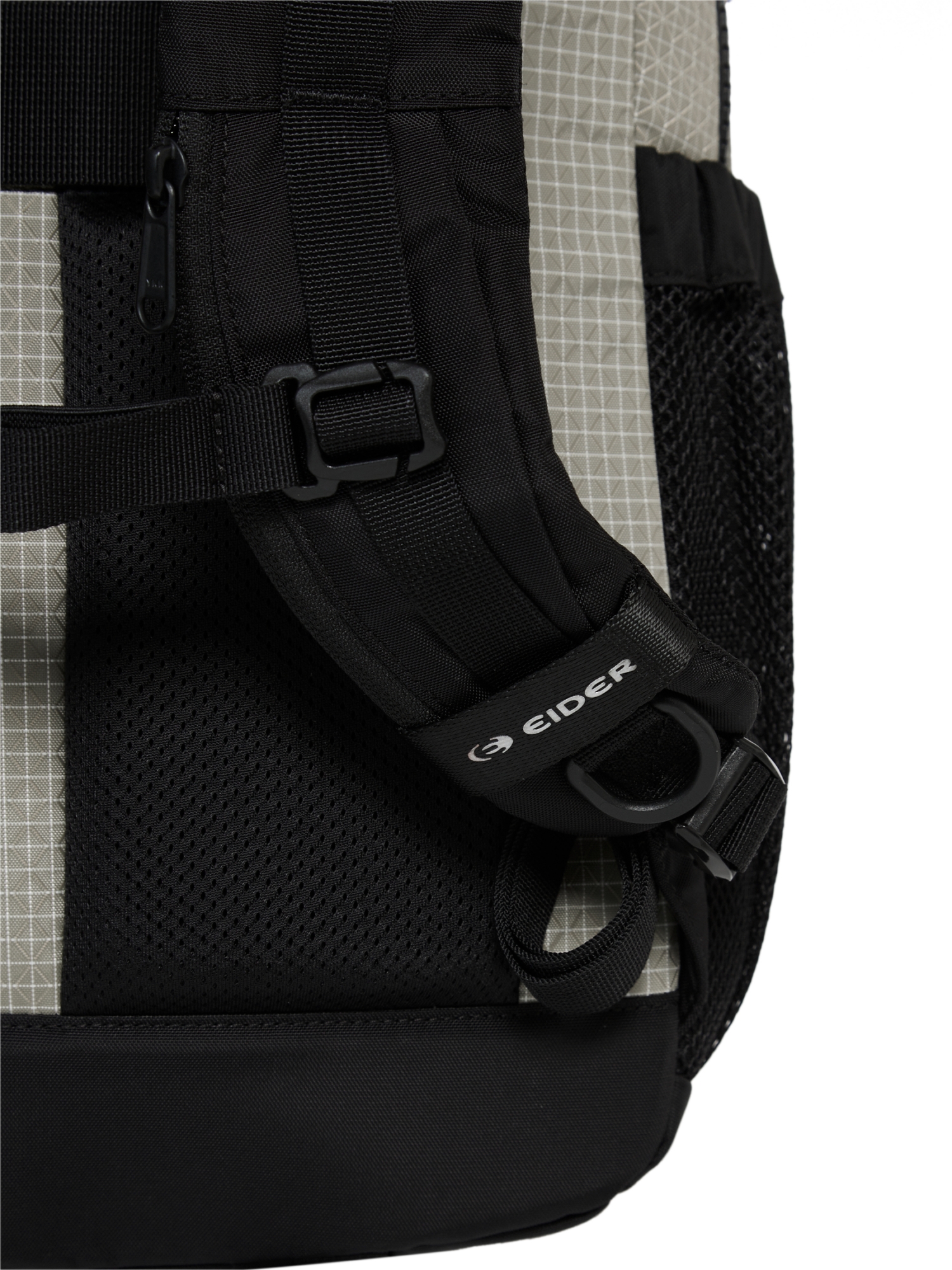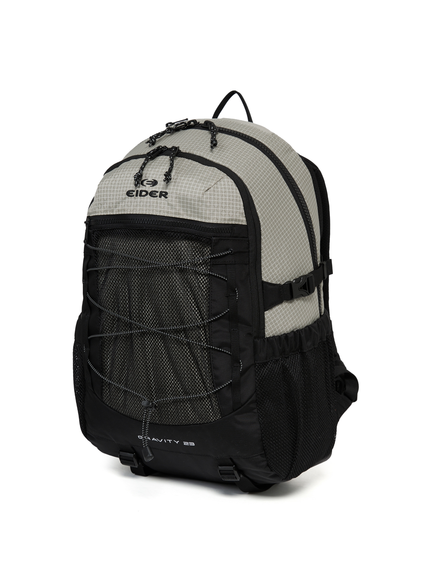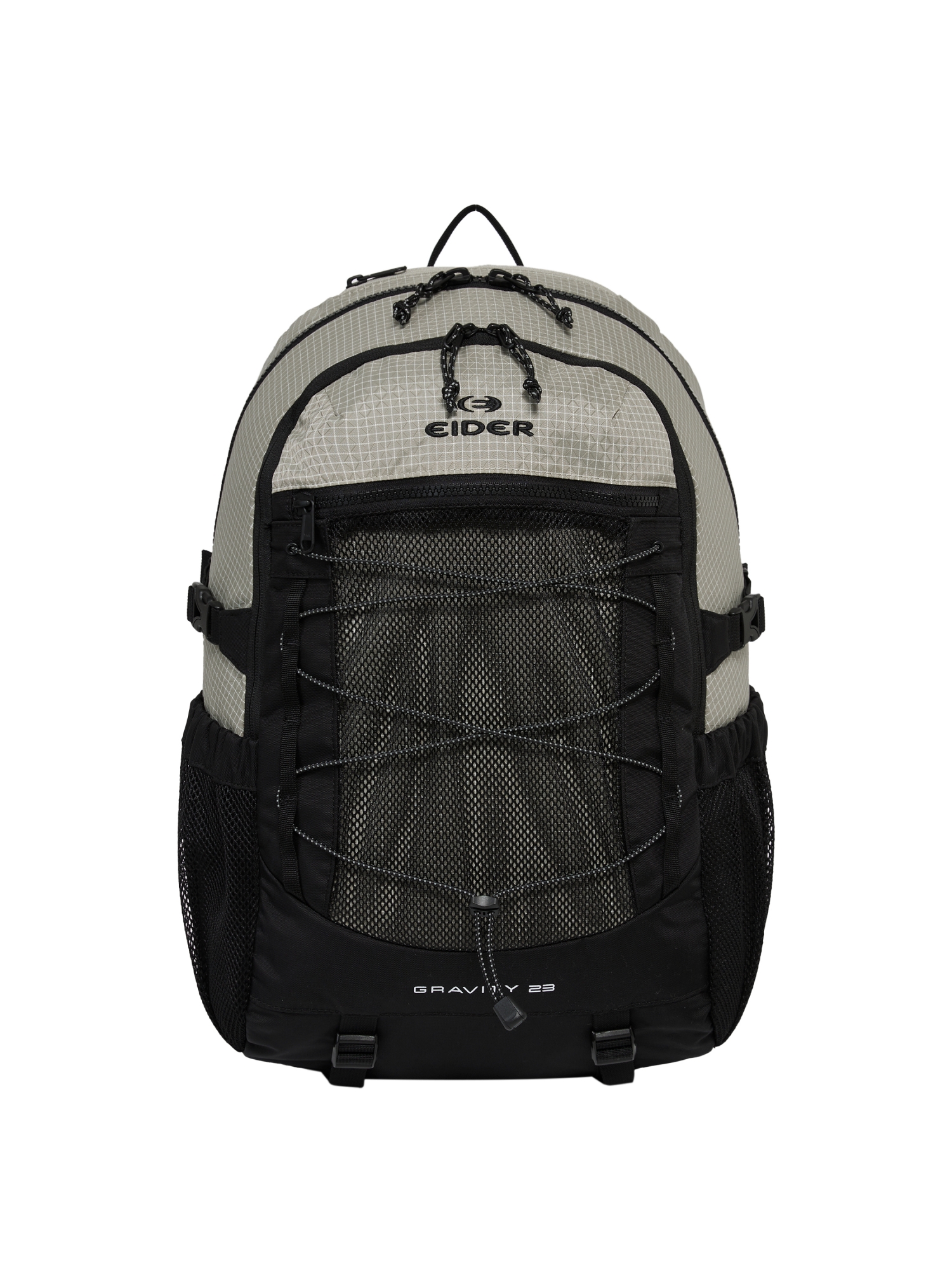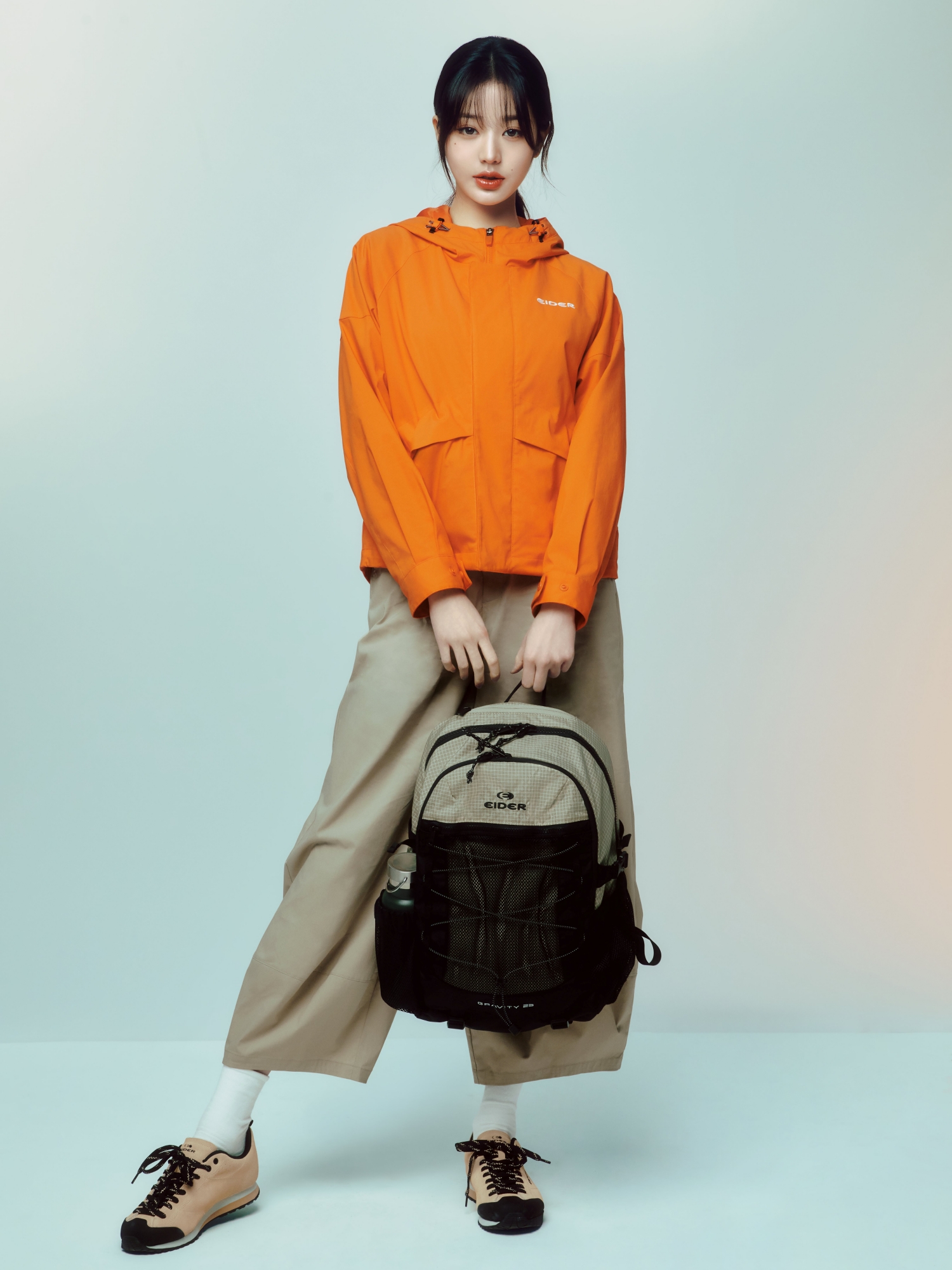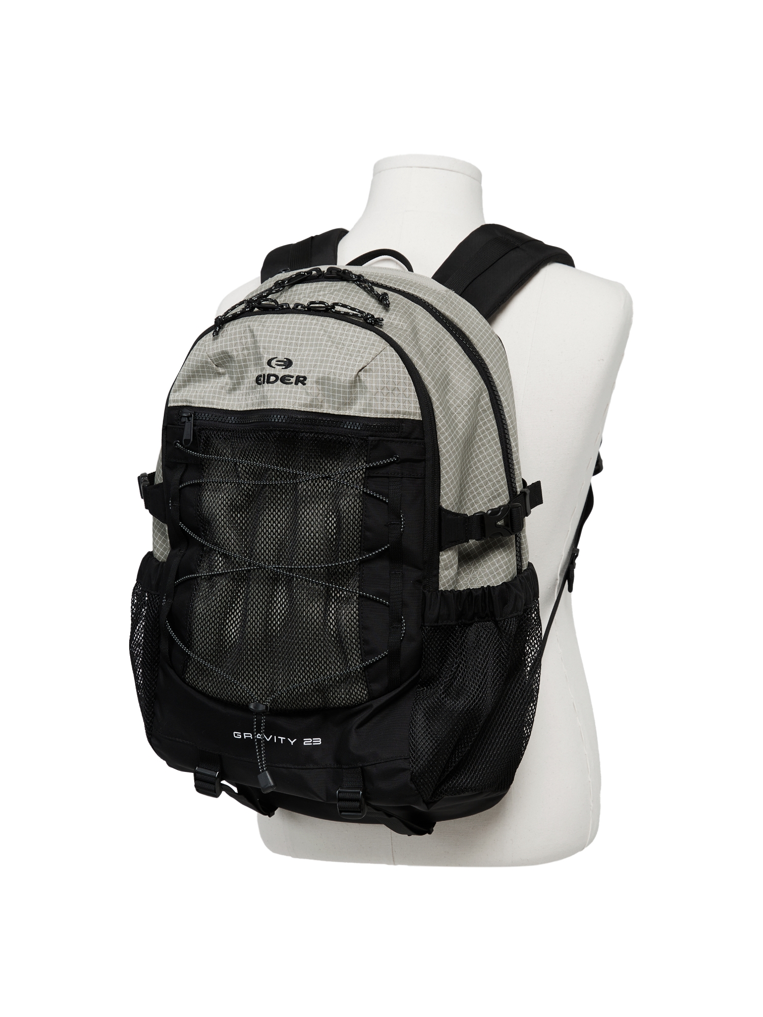 - 전면 스트링: 간단한 소지품 거치, 가방 형태 조절, 고프코어 무드 강조