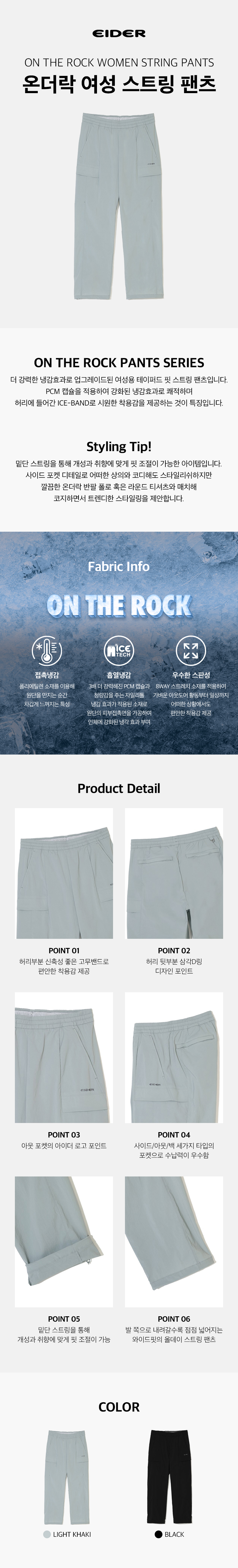 [더 강력해진 냉감효과의 아이더 온더락 아이스 팬츠] - 착용 계절 : 여름 - 핏 : 테이퍼드핏 - 온더락 여성 스트링 팬츠 - 더 강력해진 PCM 캡슐을 적용하여 냉감효과를 극대화 - 허리 사이드와 뒷판 냉감 밴드를 적용하여 냉감 효과를 강화 - 신축성이 우수한 소재를 적용하여 어떠한 아웃도어에도 적합한 활동성 제공 - 밑단 스트링을 통해 개성과 취향에 맞게 핏 조절을 통해 스타일링이 가능한 팬츠 - 사이드 포켓 디테일의 카고 스타일 - 뒤 허리 삼각D링 디자인 포인트 * 온더락 MAX 설명 - 기존 냉감 PCM 대비 더 커진 MEGA PCM 캡슐과 자일리톨을 적용하여 더 시원하고 청량한 착용감 제공 - 온더락 별도 택 제공