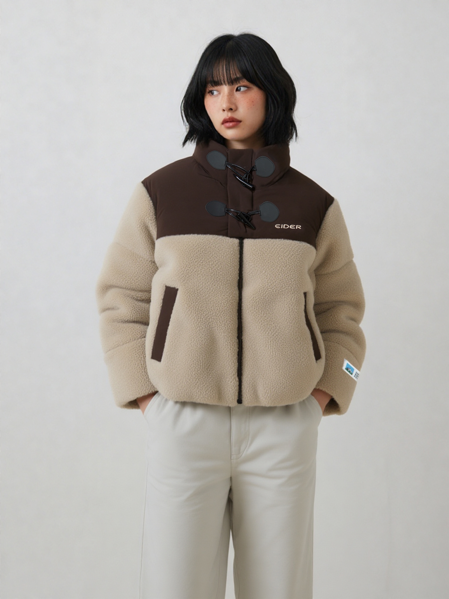 [플리스 소재에 토글 단추로 겨울 무드가 가득한 여성용 플리스 다운 자켓]