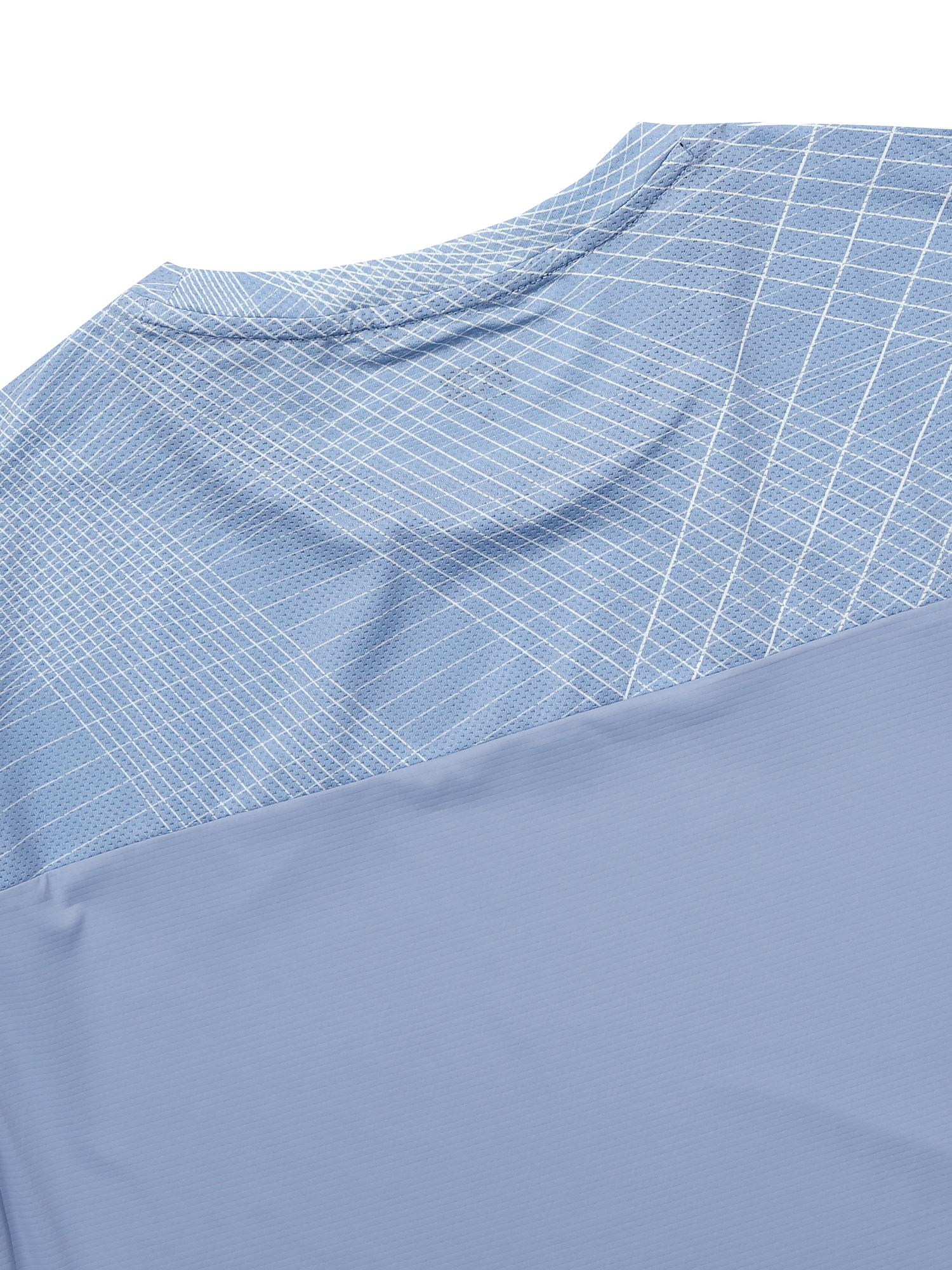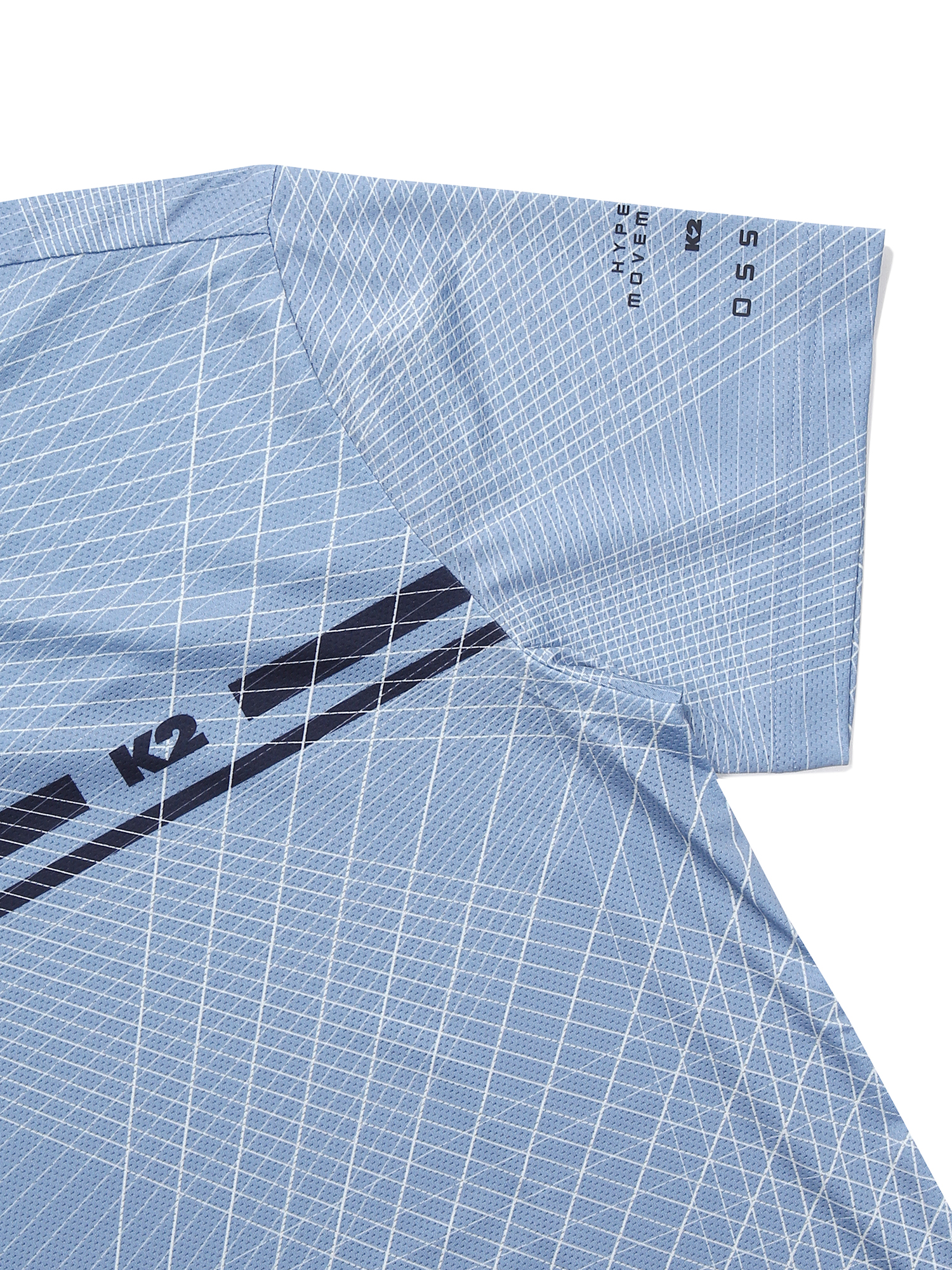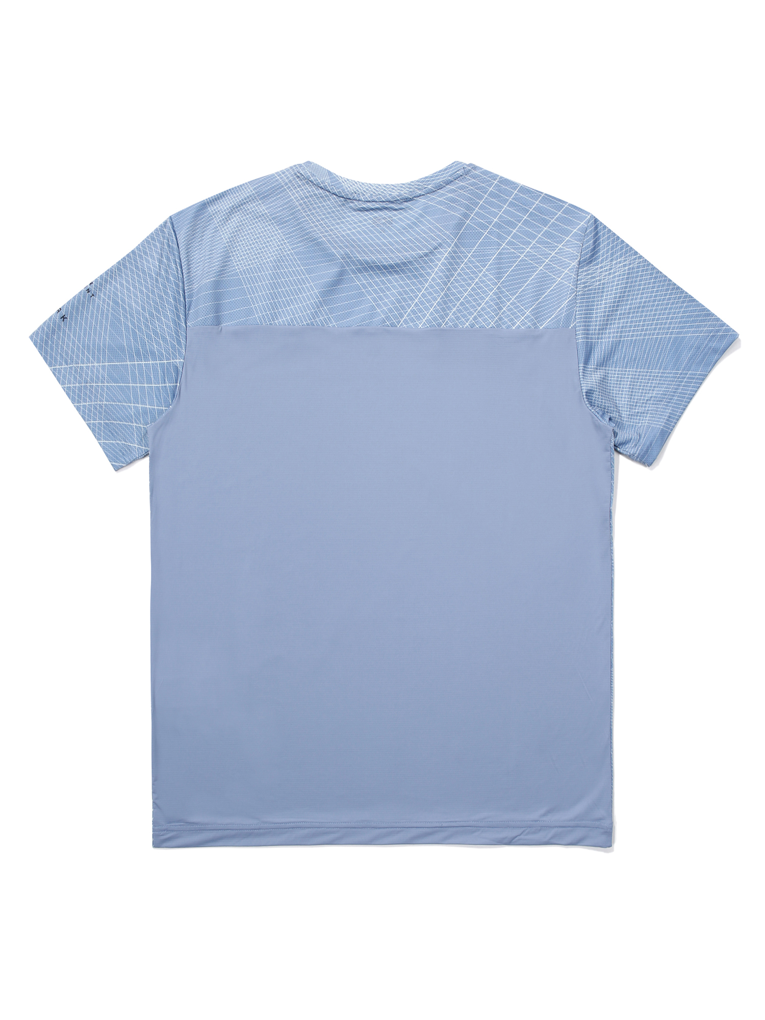 몸판, 소매 :Mesh 소재 + 기하학 Print = 통풍성 & 시선분산으로 체형 노출 보완