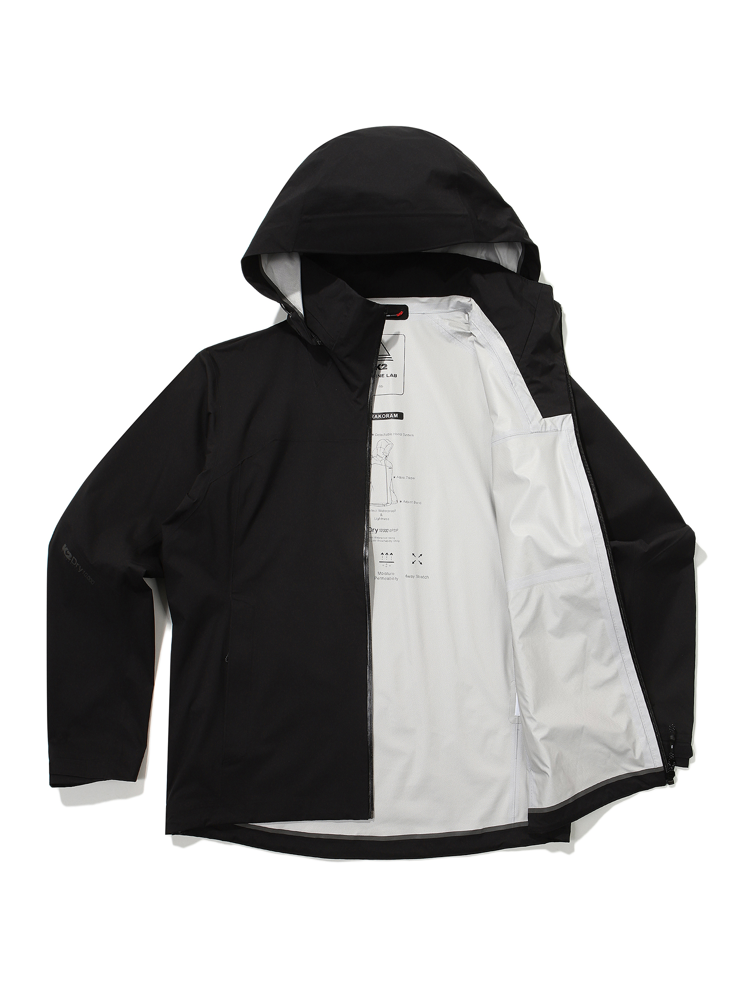 도레이 엔트란트 2.5L를 사용한 카라코람 시리즈의 범용적인 방수 자켓. 가볍고 스트레치가 가능하며 후드일체형 처럼 보이지만 탈부착이 가능한 알파인 후드 시스템 적용