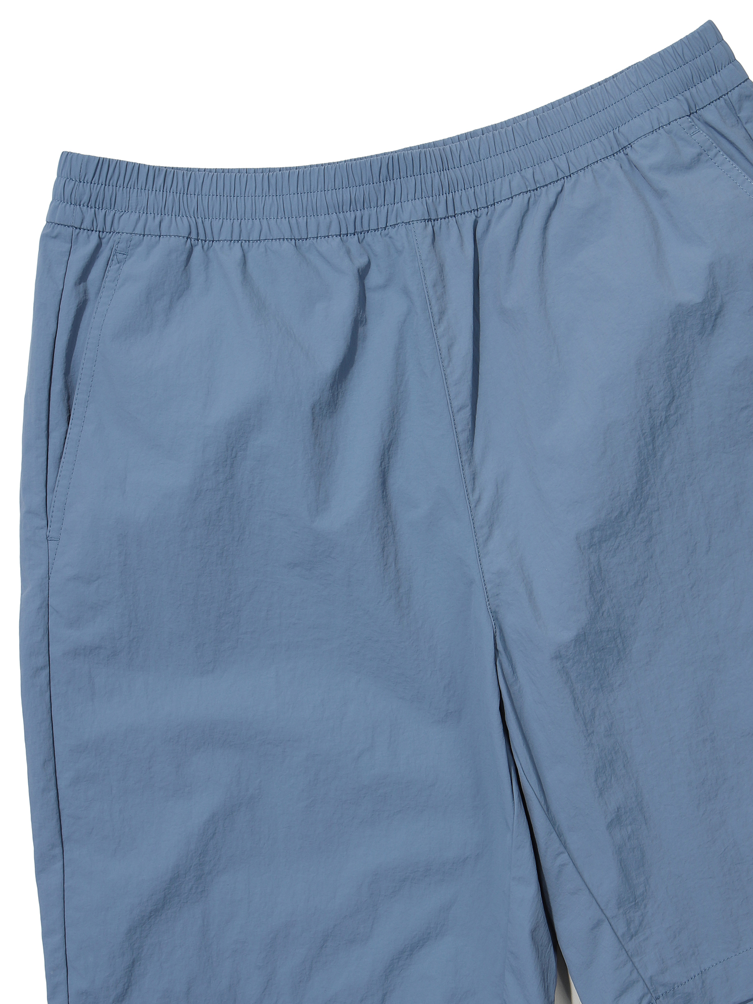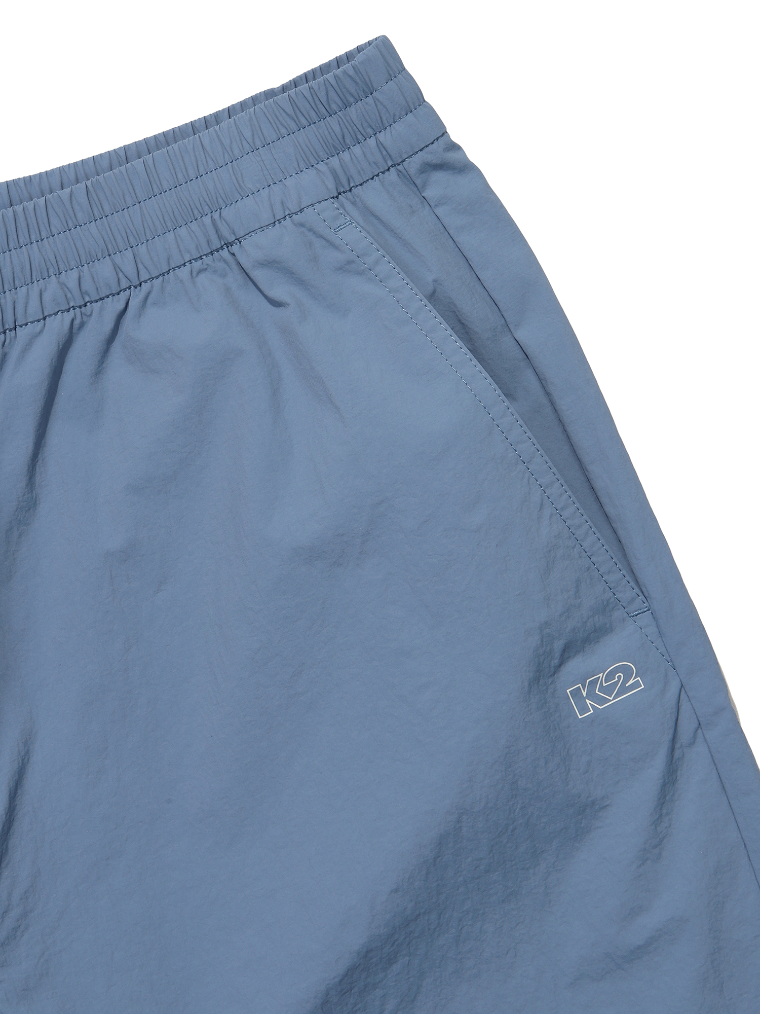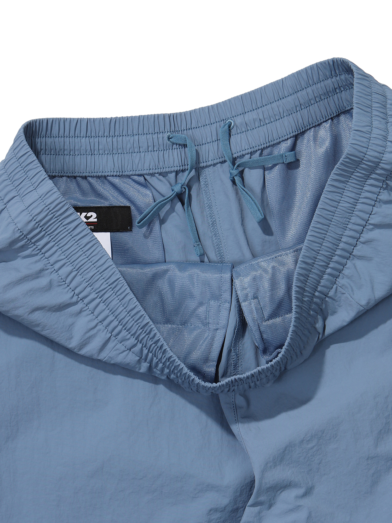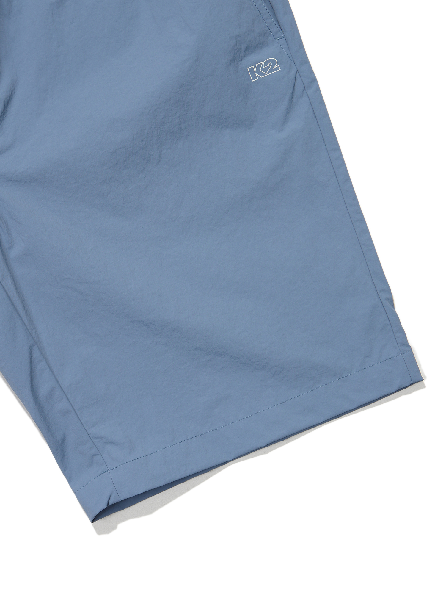 나일론 타슬란 계열의 소재를 사용해 내추럴한 반바지 팬츠 / 뒷포켓 그래픽 프린트 요소 포인트