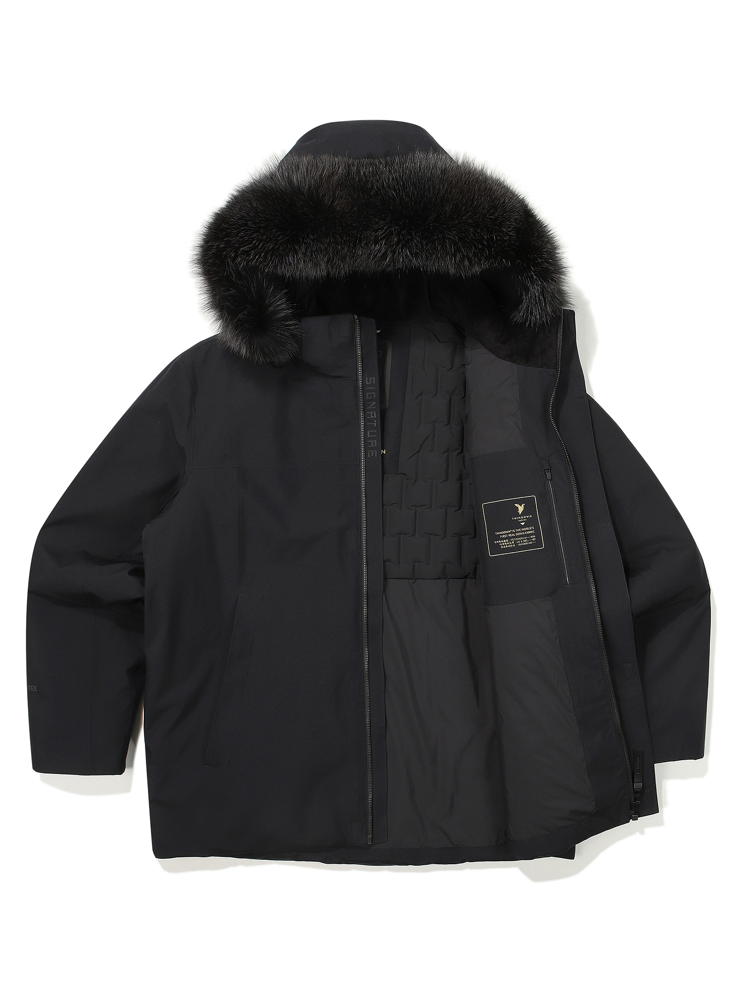 조직감 있는 NEW 고어텍스 소재와 전체 심실링으로 완벽한 방수, 방풍 기능을 갖추고 전체 씬다운을 사용한 프리미엄 앱솔루트 다운