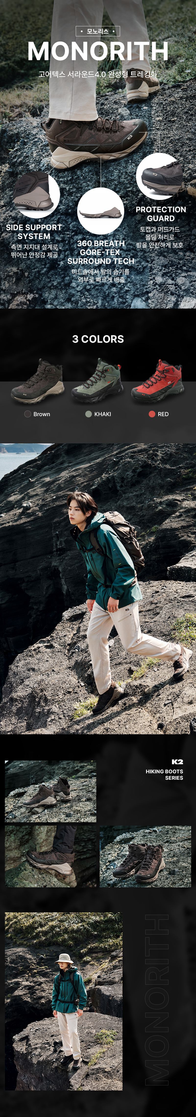 고어텍스 서라운드 4.0 버전으로 개발되어 뛰어난 통기성과, 측면 지지 구조물이 갑피까지 이어지는 설계로 안정감까지 뛰어난 트레킹화