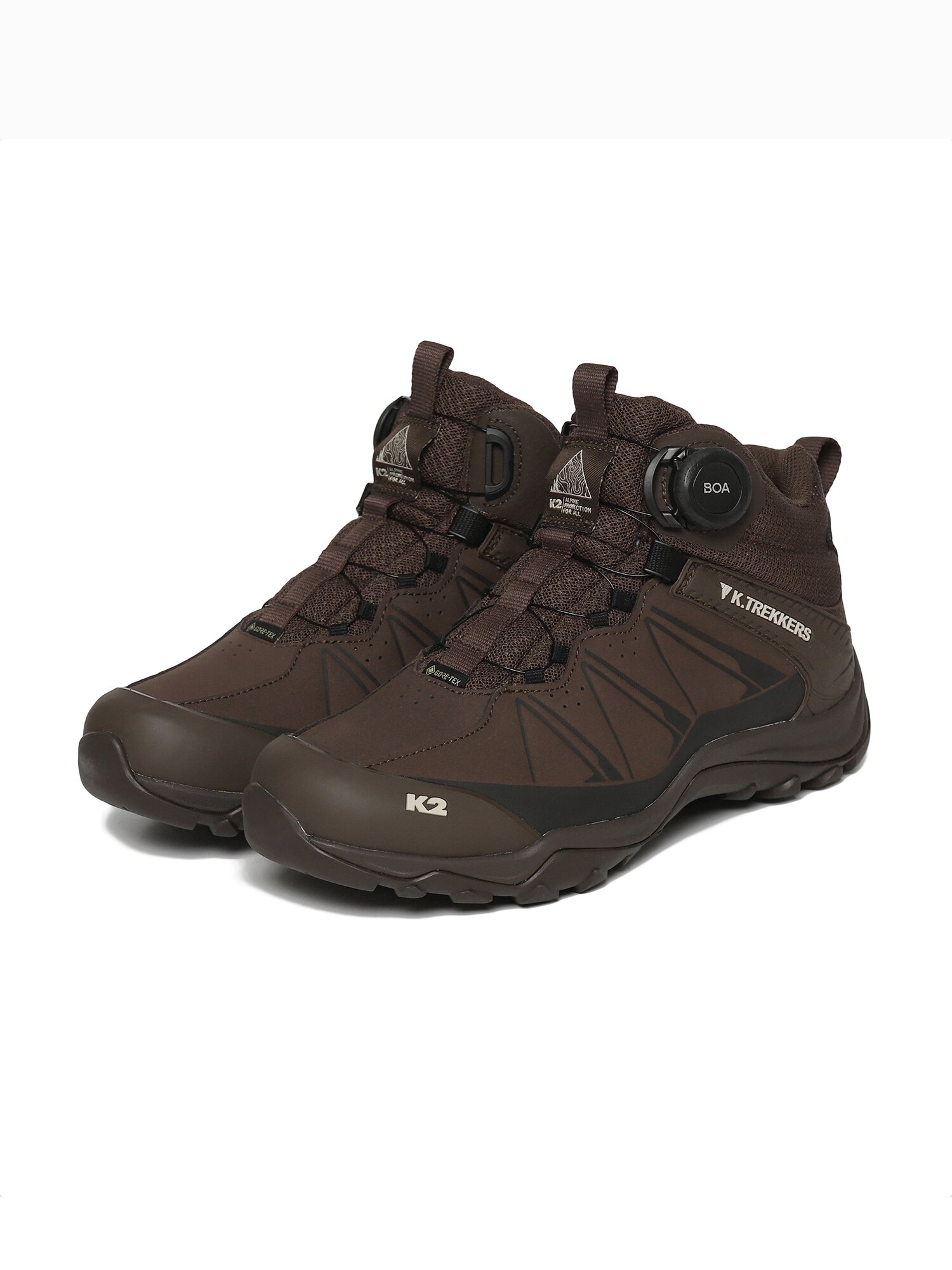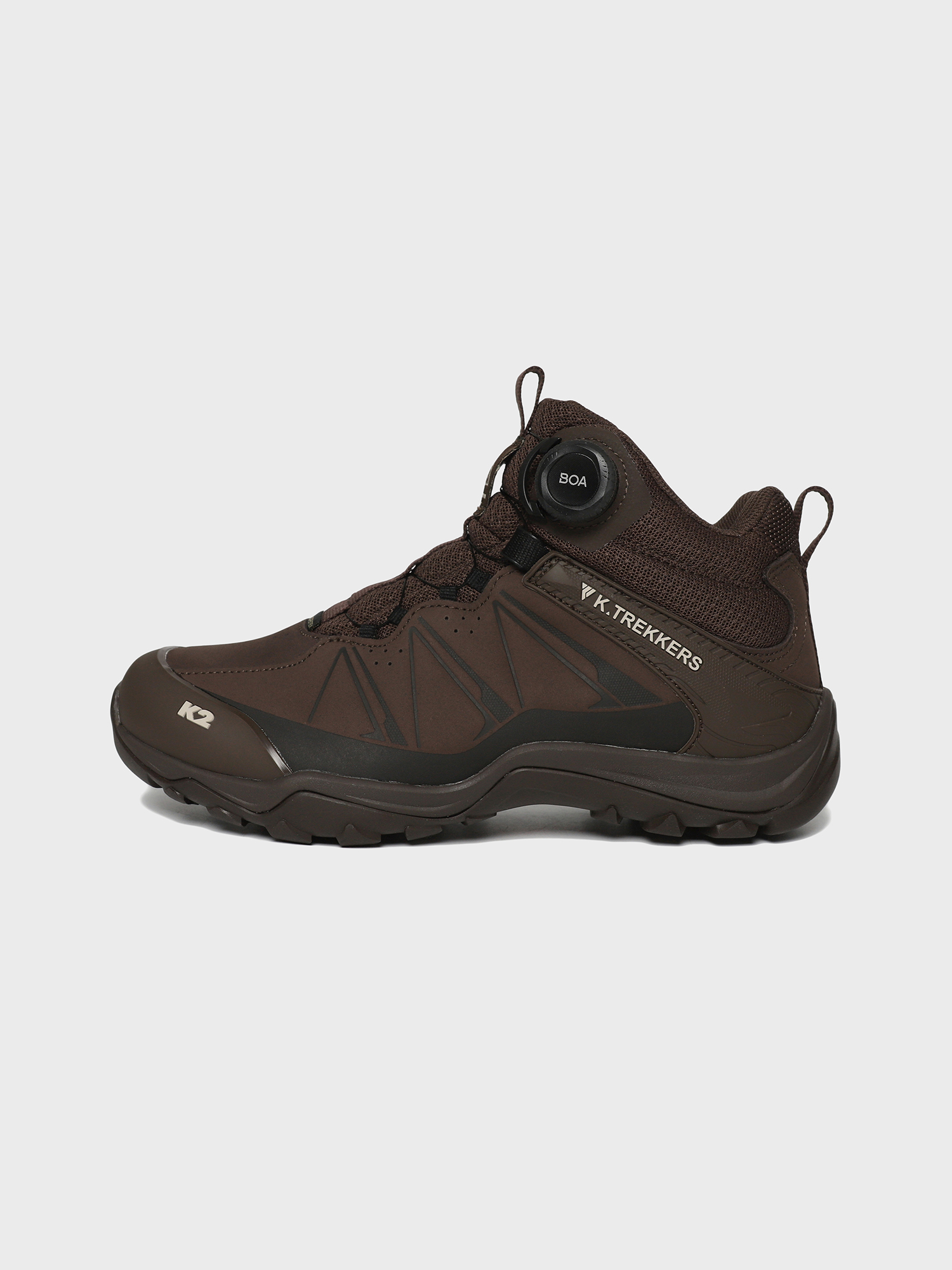 프리미엄 소재와 기능을 우선시한 설계로 자유롭고 민첩하게 조절 및 반응하는 X-GRIP WITH BUMPY LUG가 적용된 현대적이고 실용적인 K.TREKKERS 미드컷 트레킹화