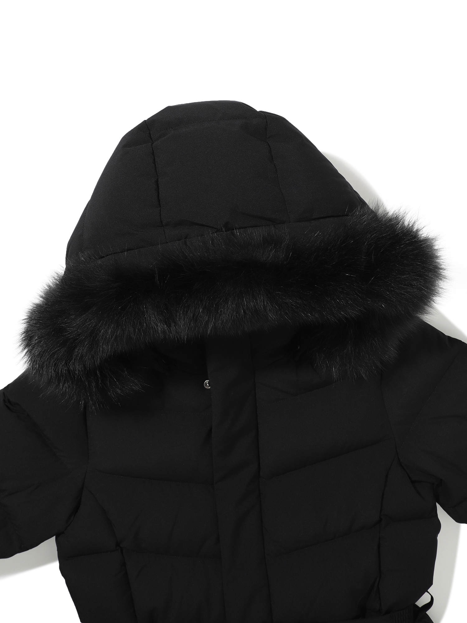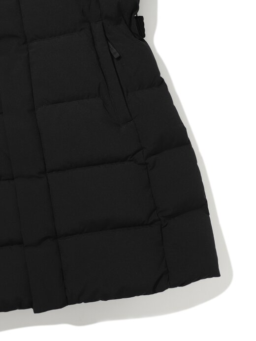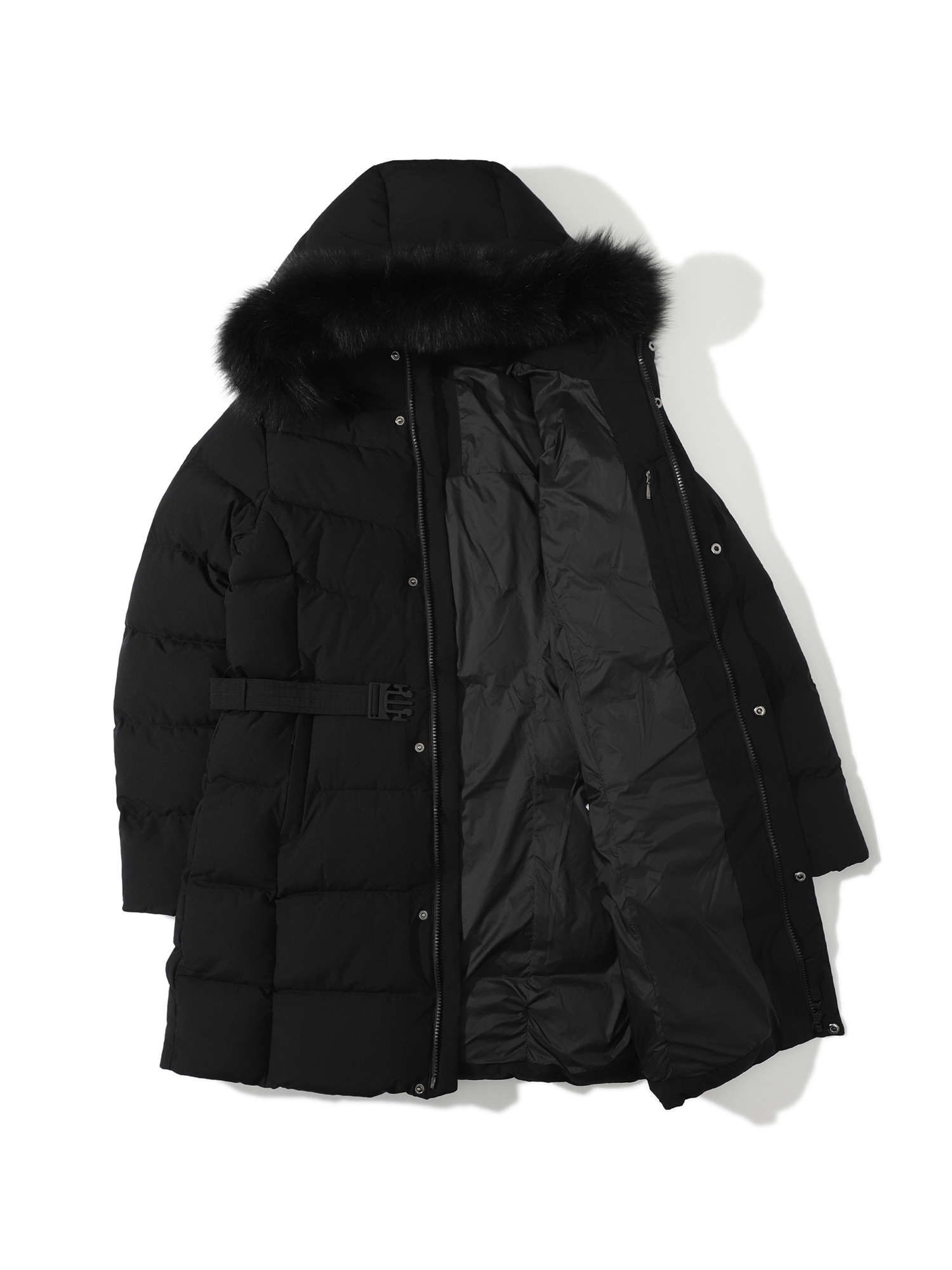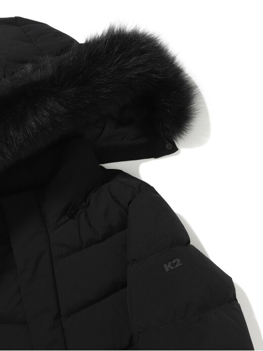 - 가볍고 소프트한 폴리 2L 소재와 유럽 사가퍼 블루폭스 30MM가 적용된 앨리스 기장감의 여성 퍼 다운
