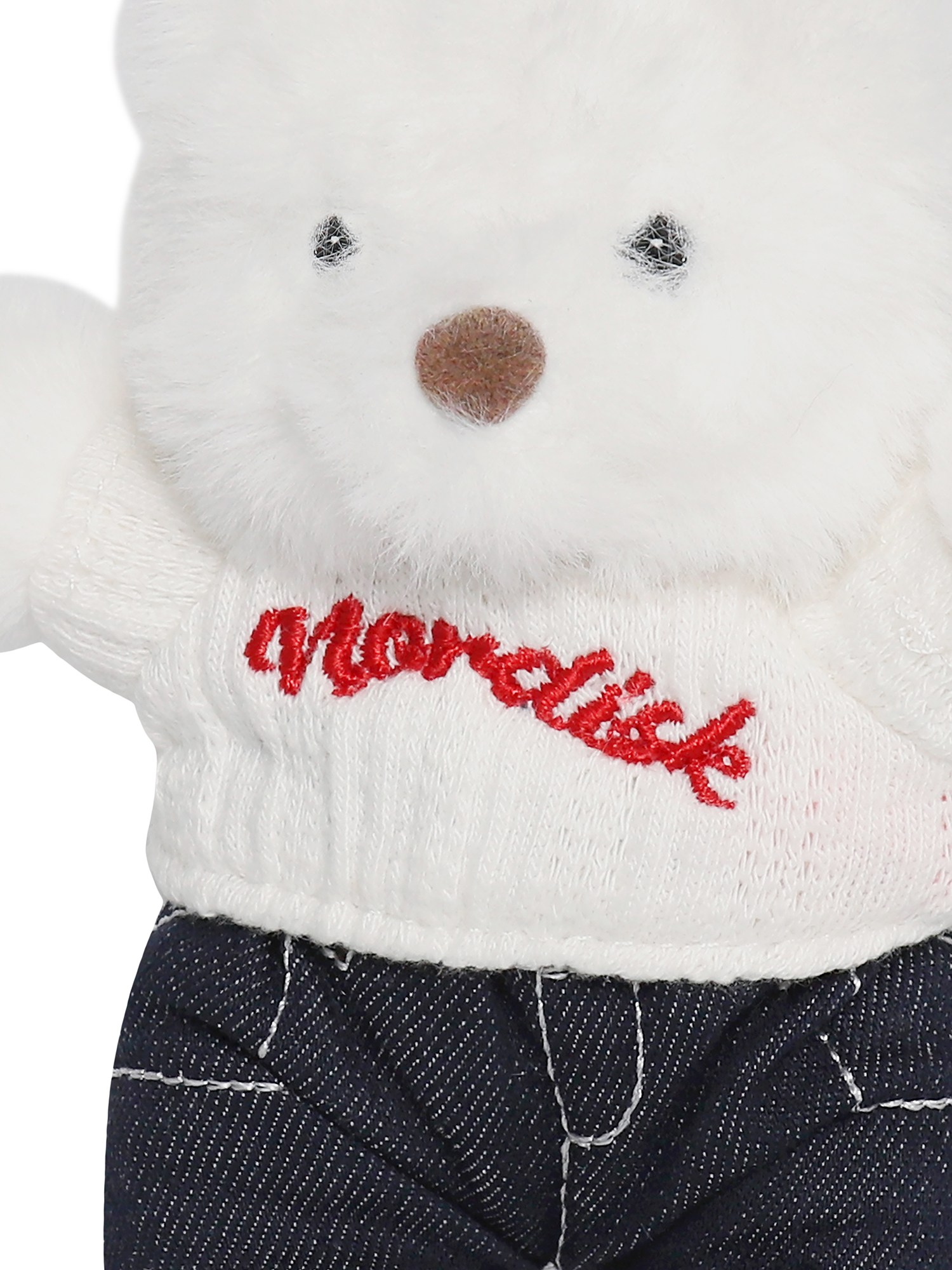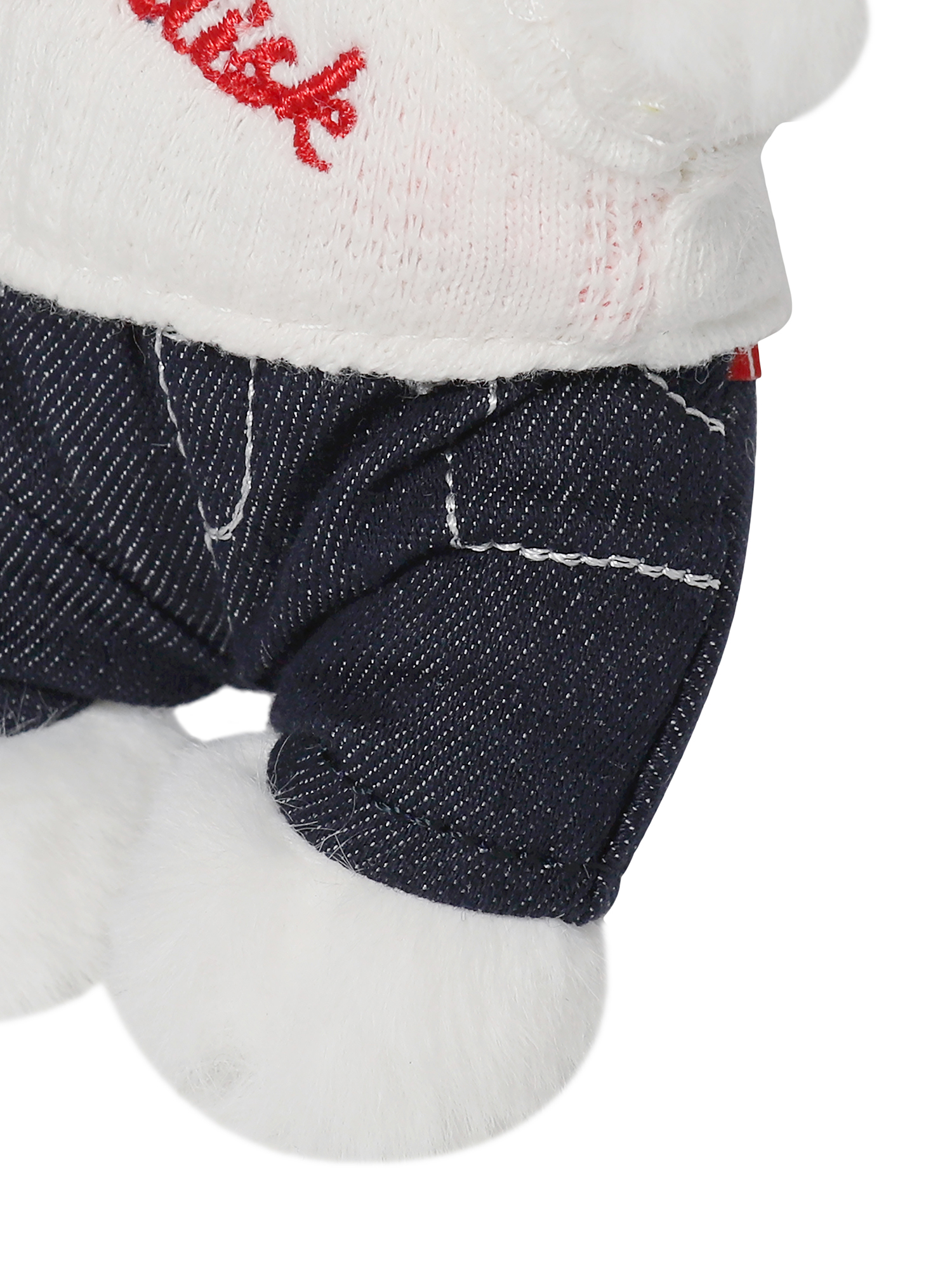 - 노르디스크 아치로고 자수가 더해진 니트 스웨터와 데님 팬츠를 착용한 미니 폴라베어