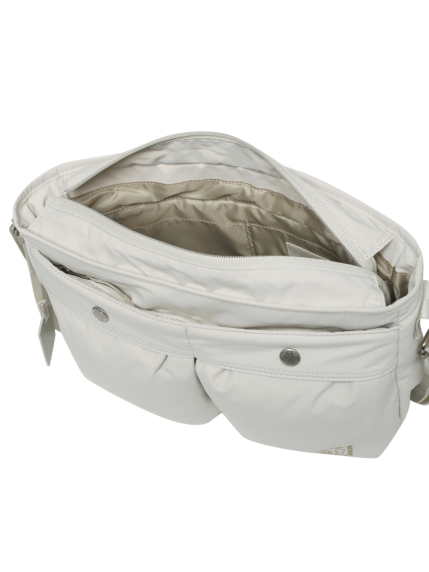 - 전면 좌우 분리 포켓, 후면 지퍼 포켓, 내부 지퍼 포켓 등 다양한 포켓 구성으로 분리 수납 강화