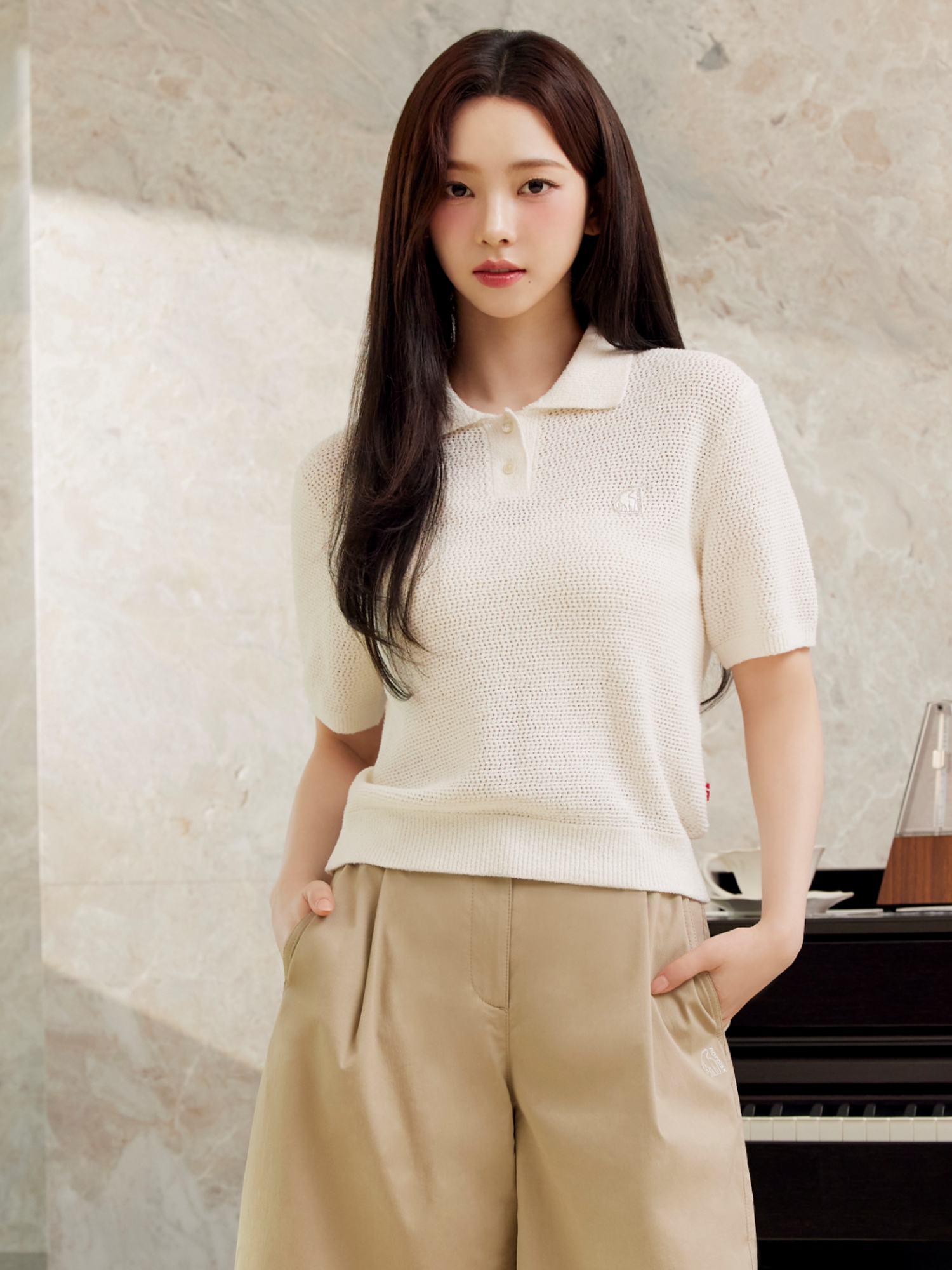 [심플한 스몰 폴라베어 와펜이 포인트인 여성 반팔 폴로 스웨터]