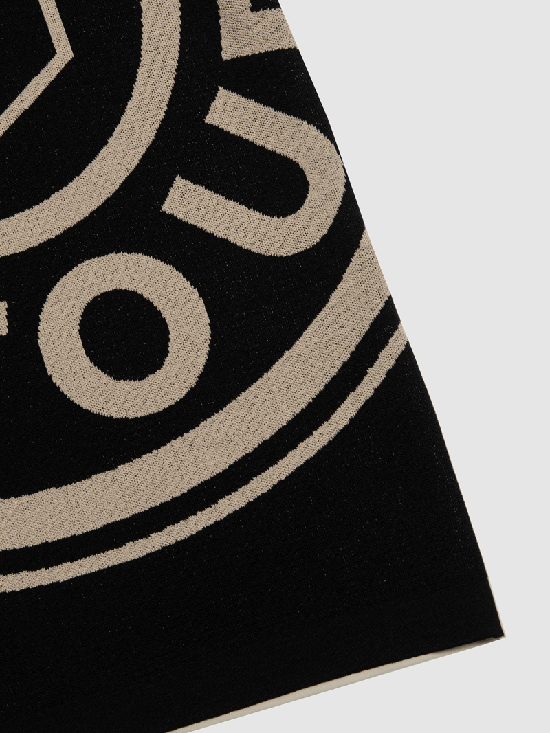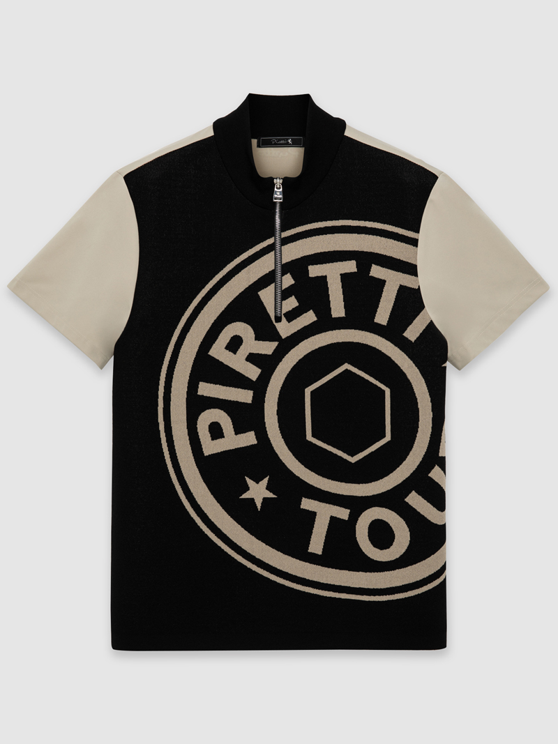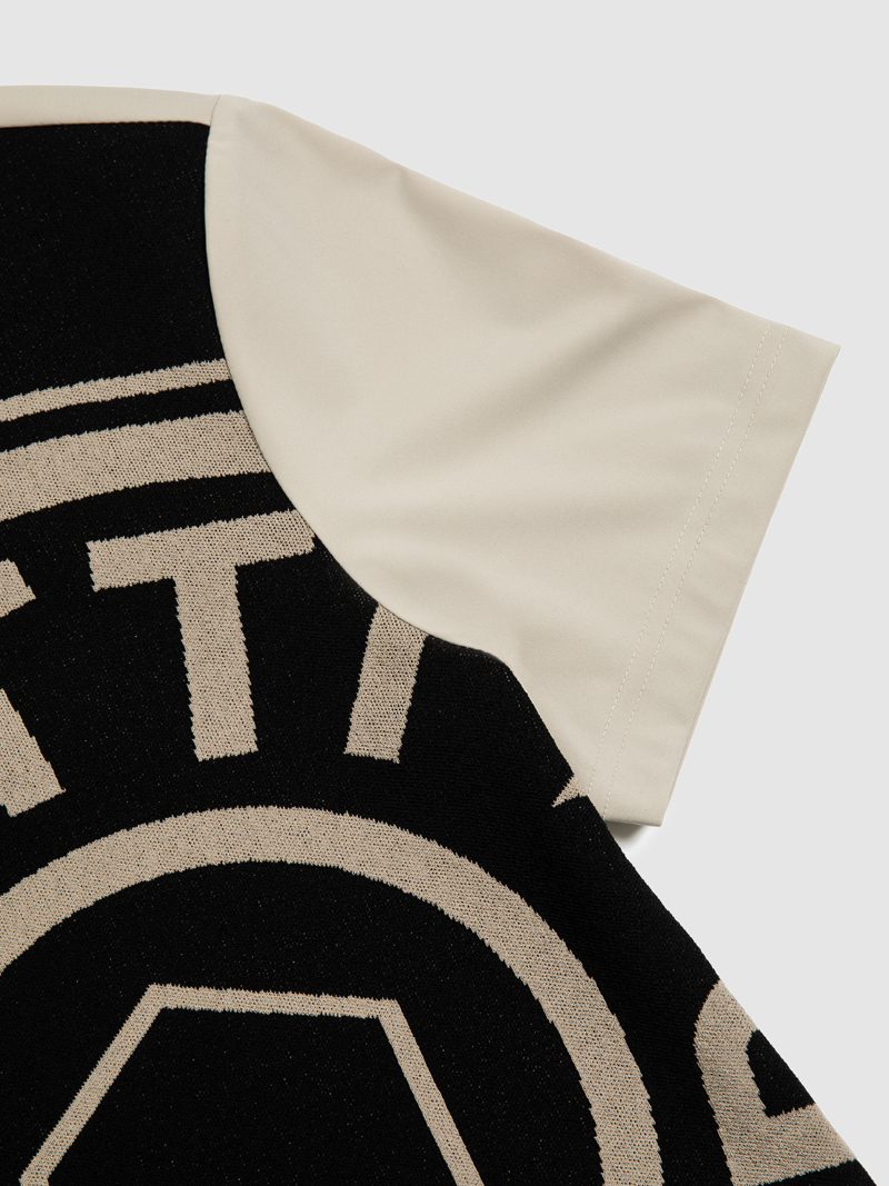 - 무게추 로고 포인트가 빅하게 표현된 니트 배색 하이넥 반팔 티셔츠