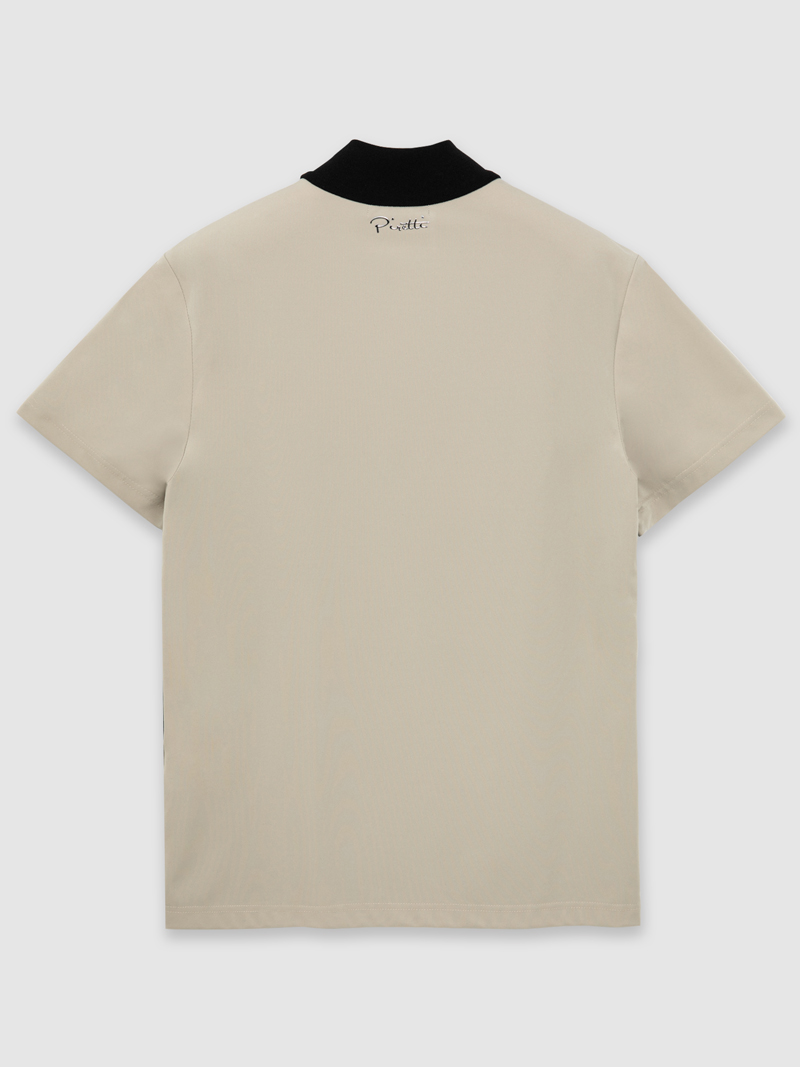 <무게추 로고 포인트로 스포티하면서 세련된 하이넥 반팔 티셔츠>