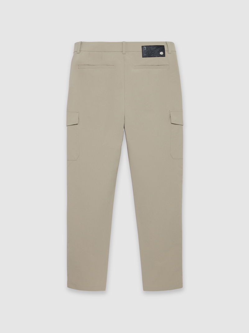 <레더라이크 텍션지로 고급스러움을 더한 베이직한 디자인의 카고 팬츠>