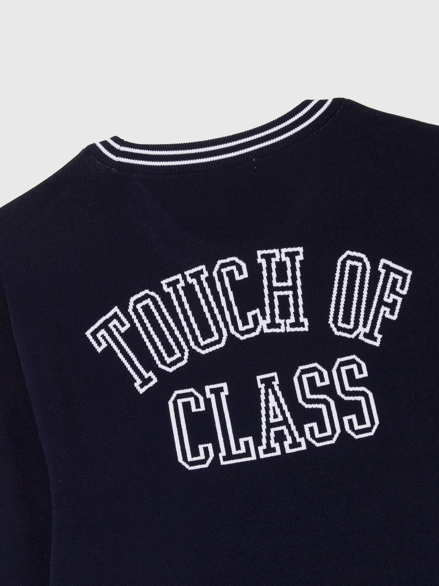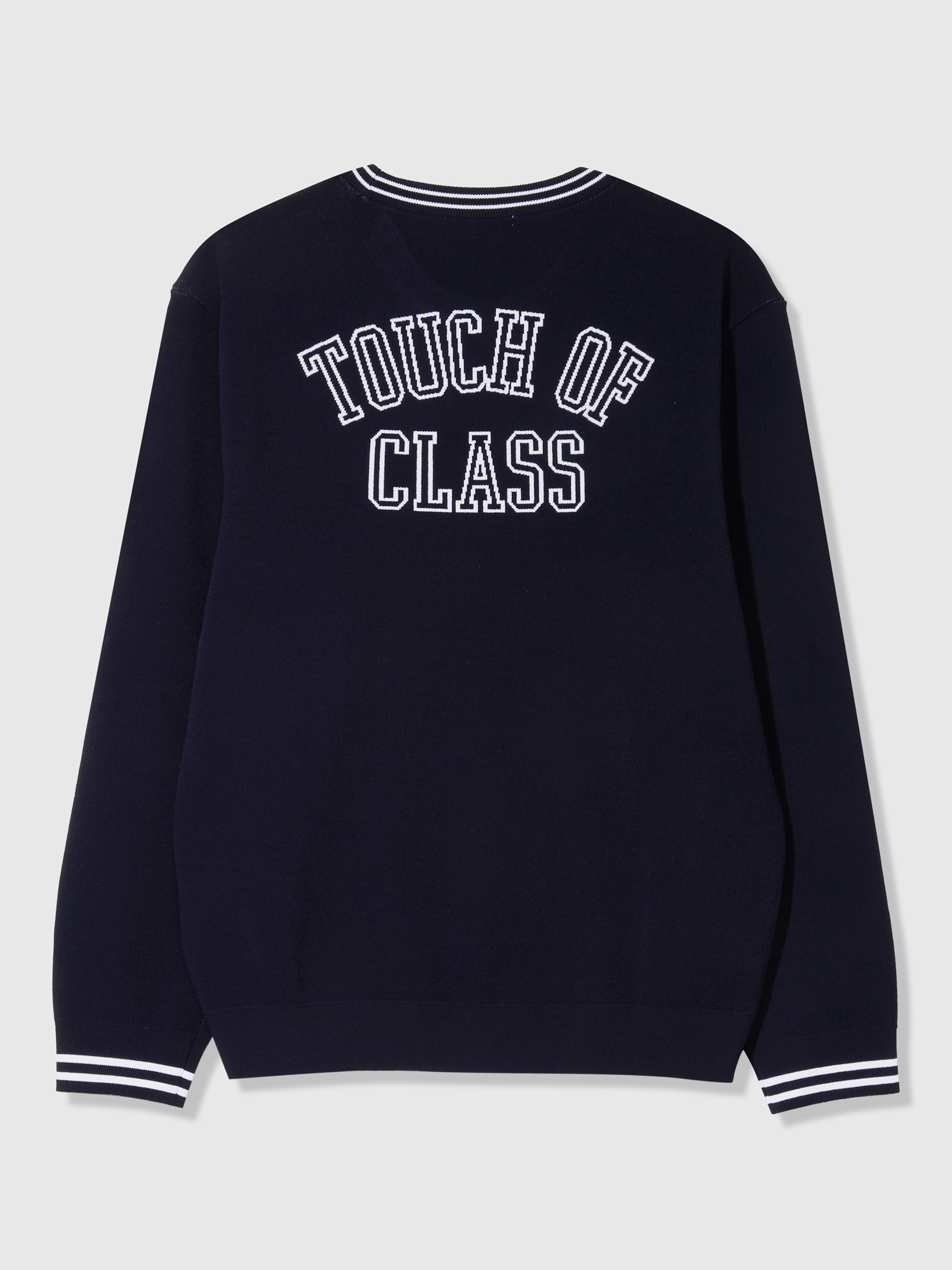 · 영하고 캐주얼한 무드의 바시티 라인 풀오버 니트