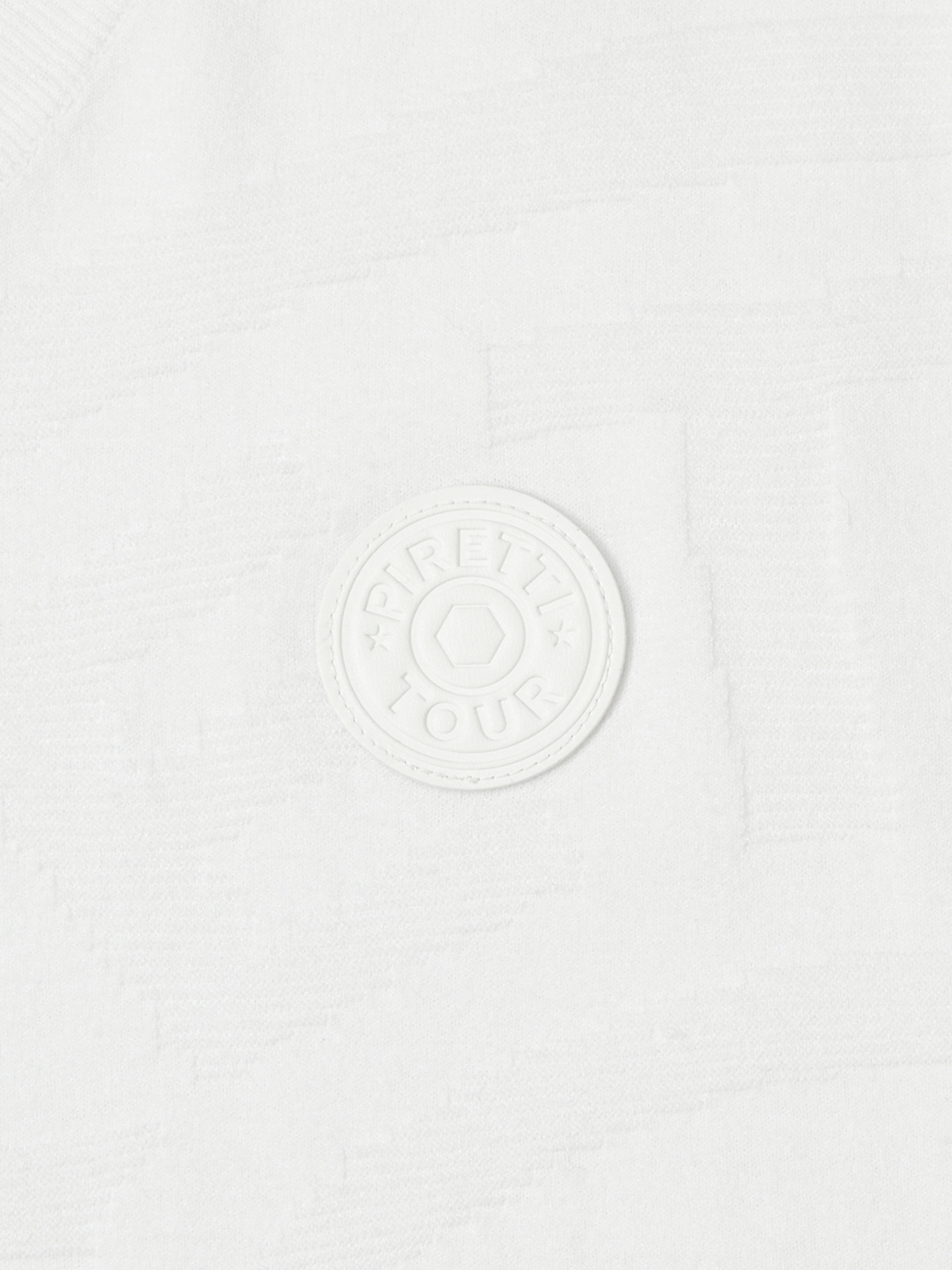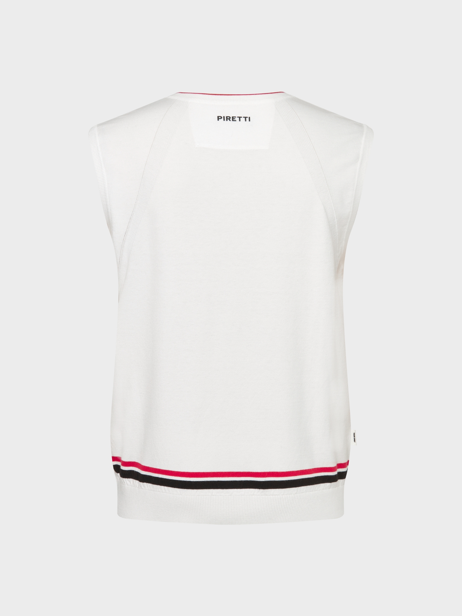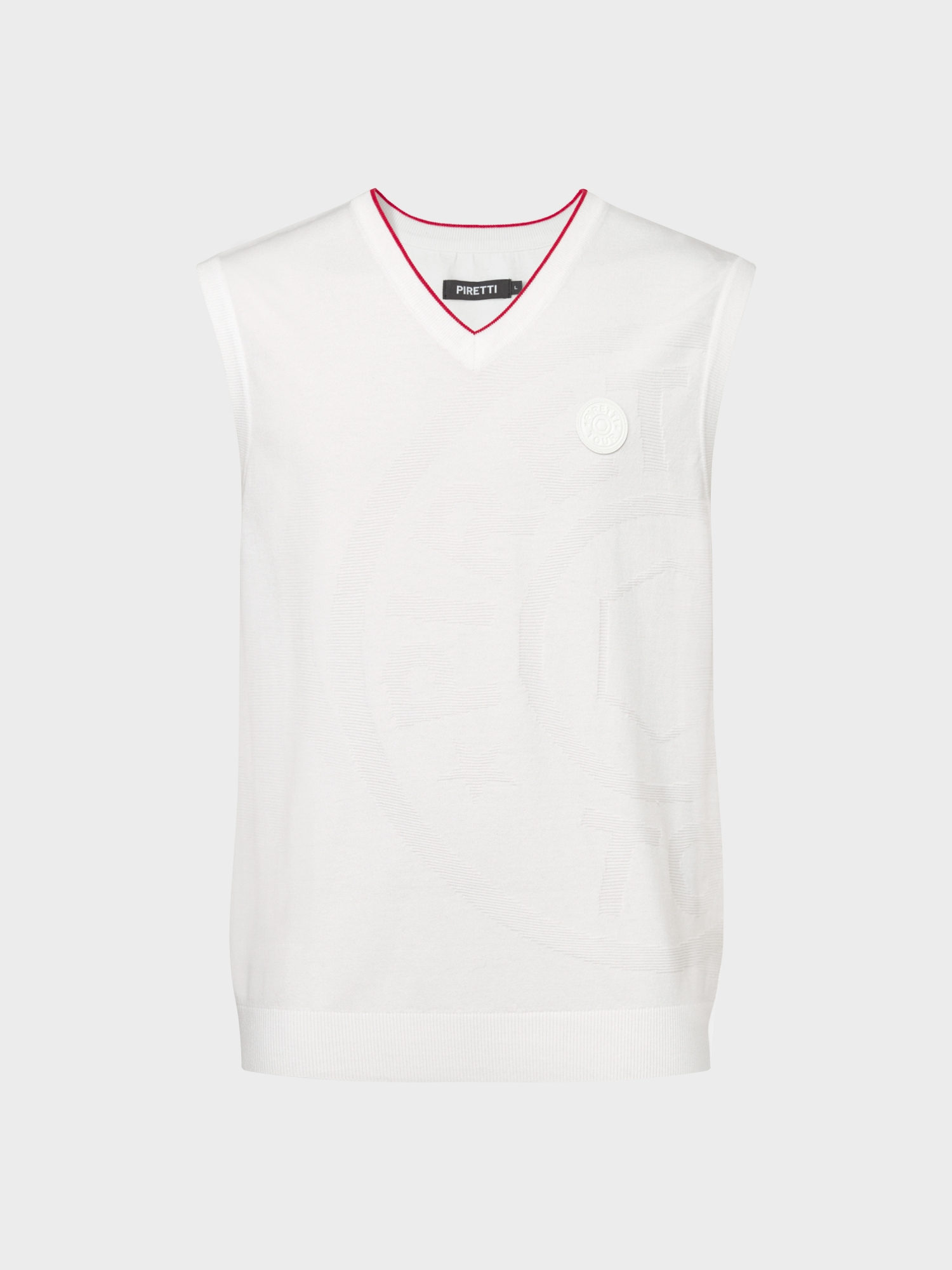 - 피레티 특유의 원형 무게추가 조직감있게 표현된 V넥 베스트.