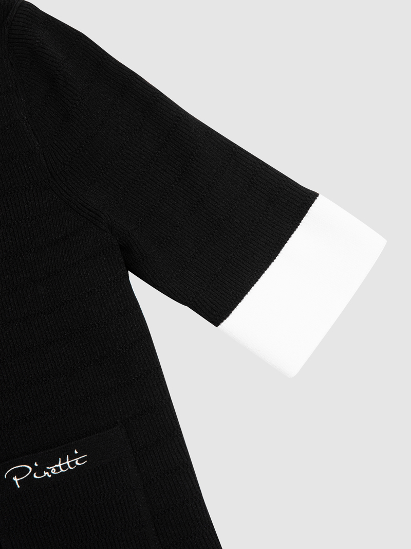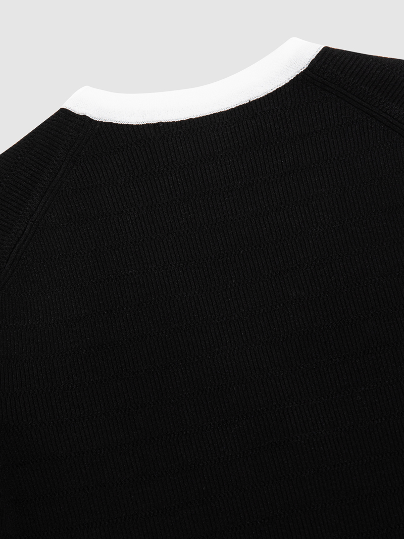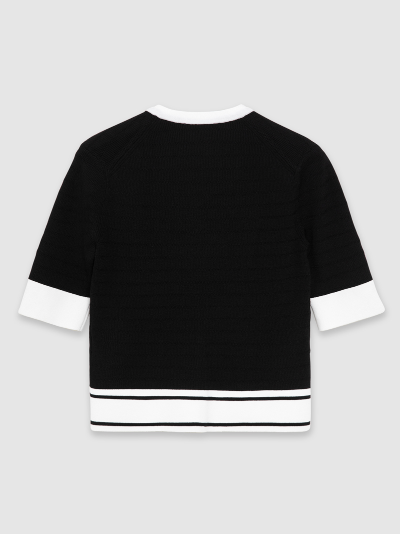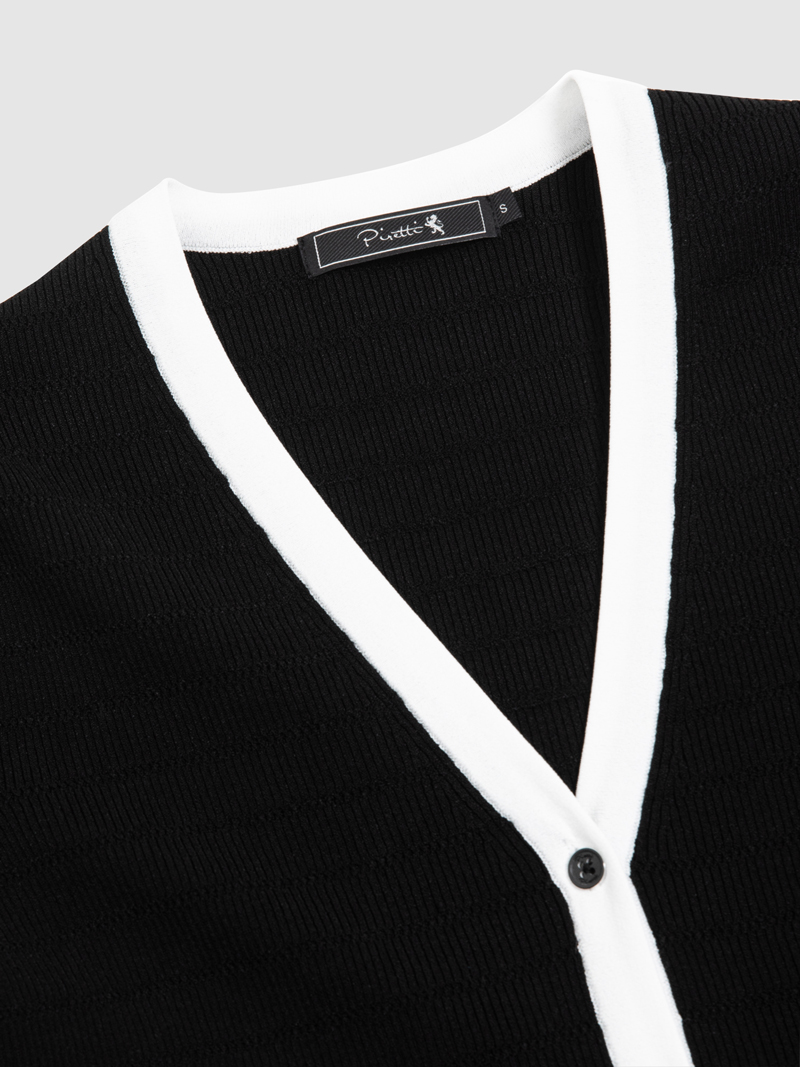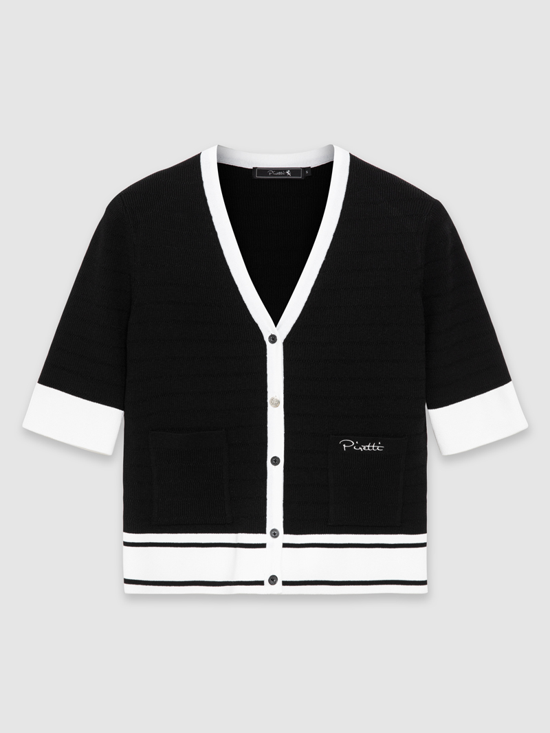 - 숏기장 반팔 가디건으로 배색된 색상이 여성스러움을 강조합니다.