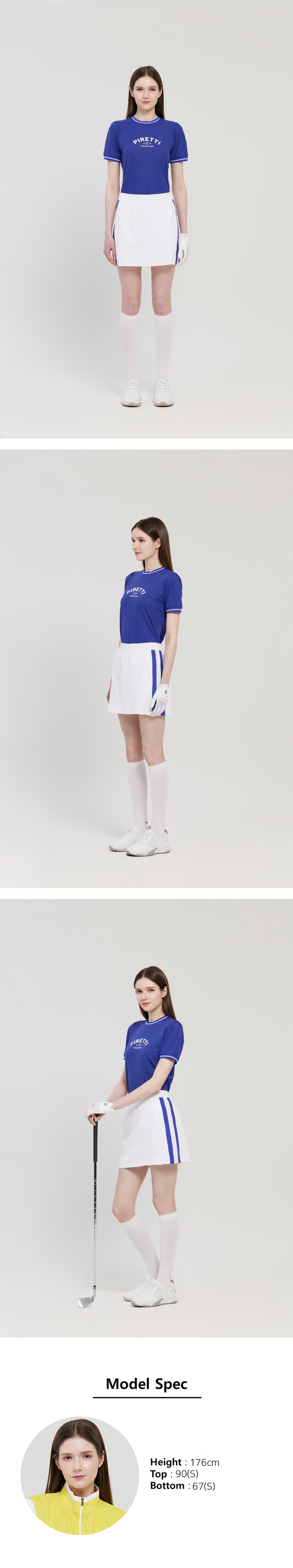 - 여성스러운 소매 디테일에 스포티하게 로고를 표현하여 라운딩 룩을 완성함