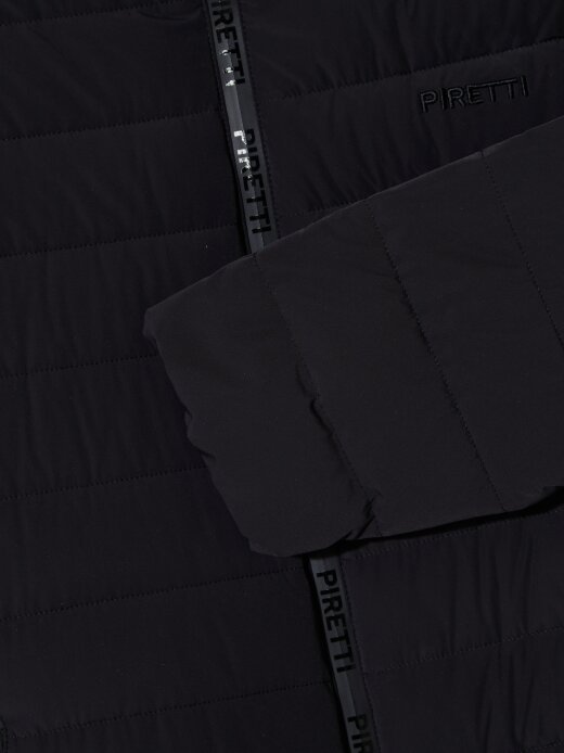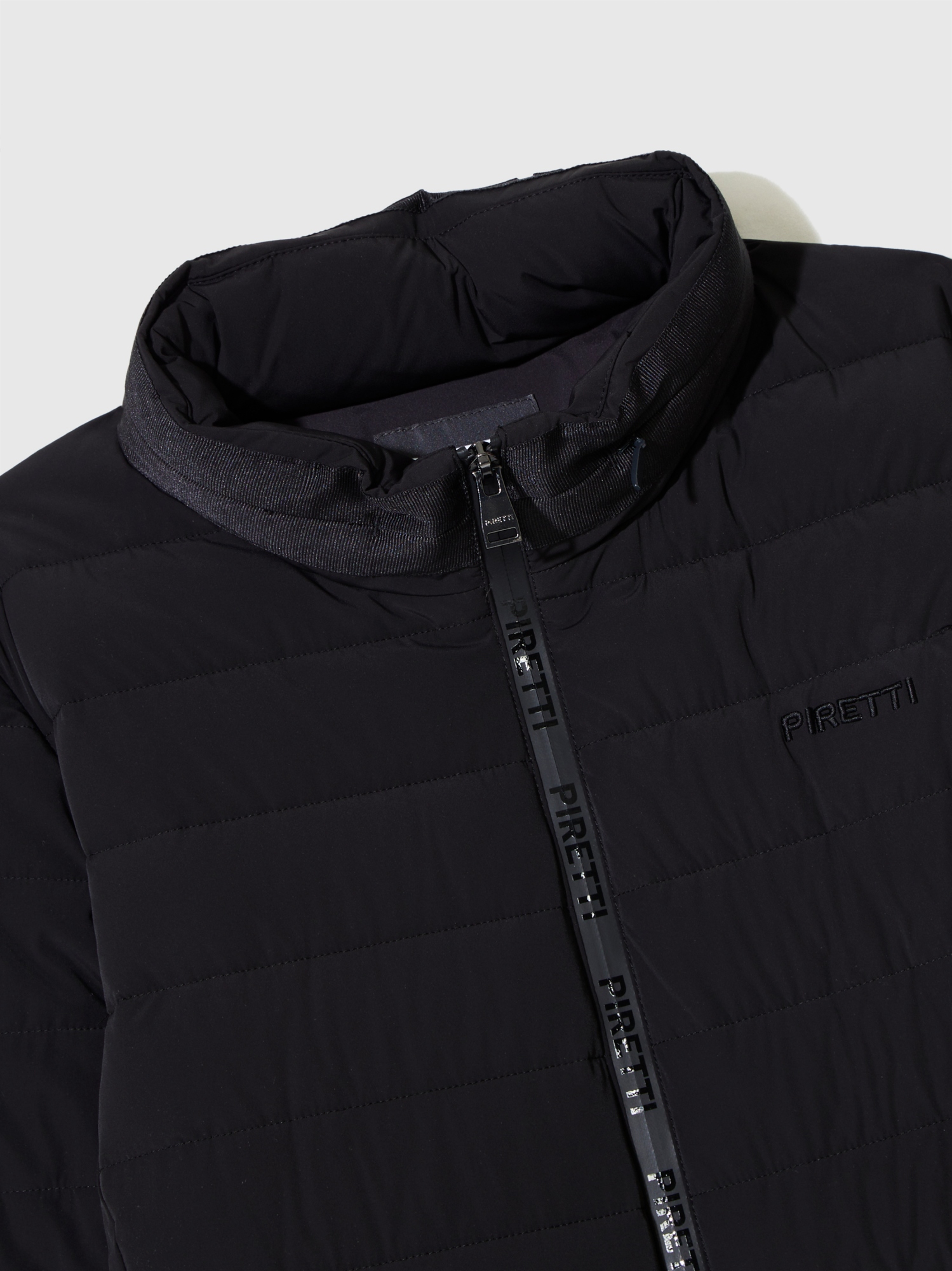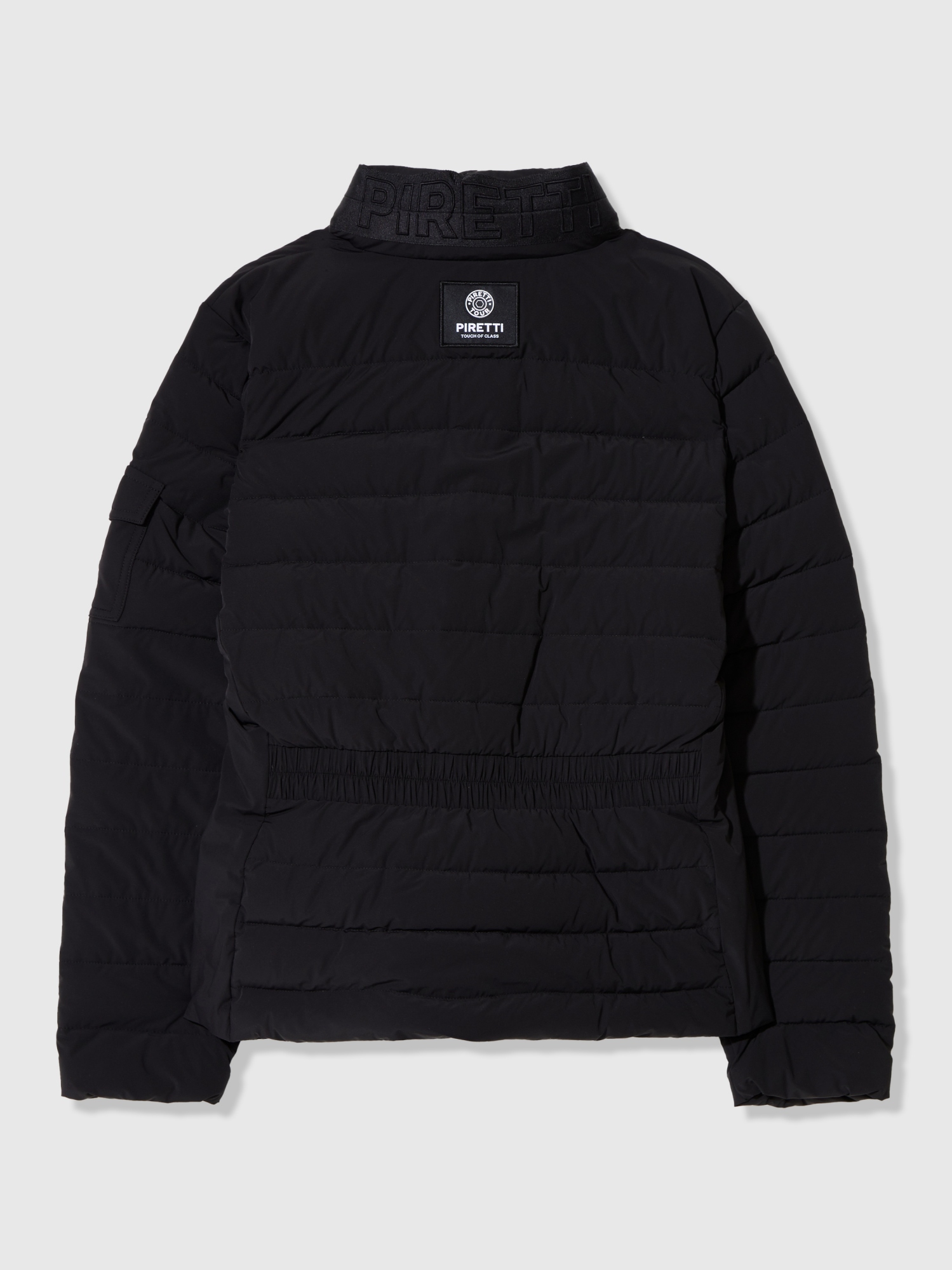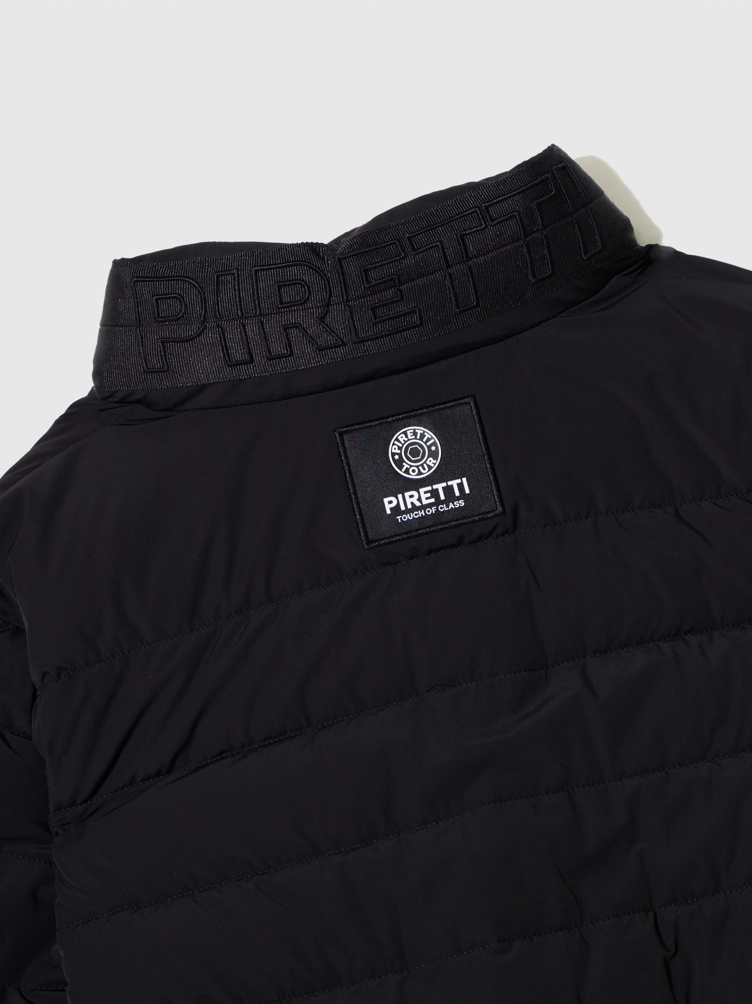 - 힘있게 서있는 스탠칼라에 PIRETTI 볼륨 로고 자수로 포인트를 줌