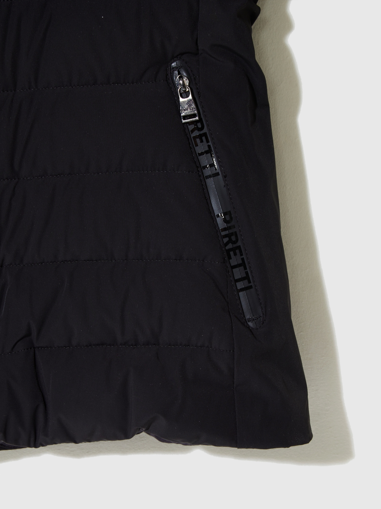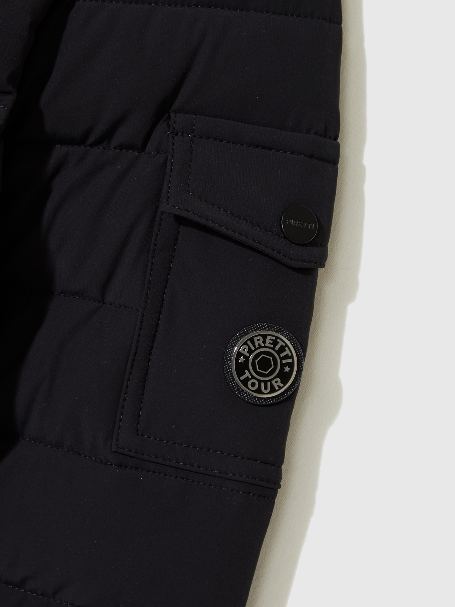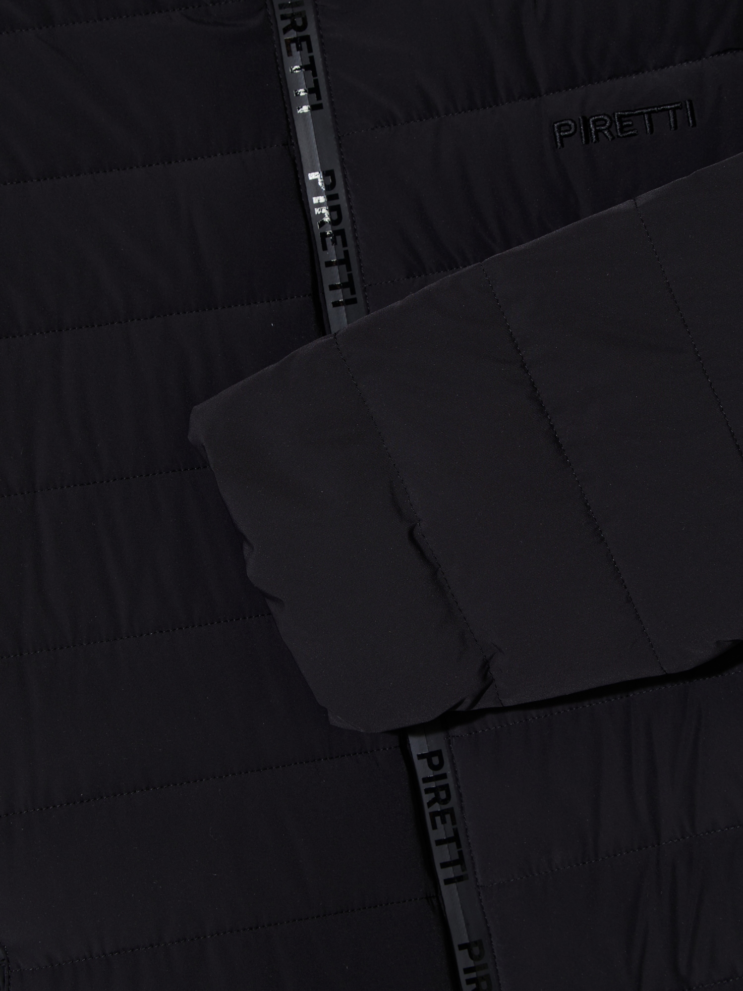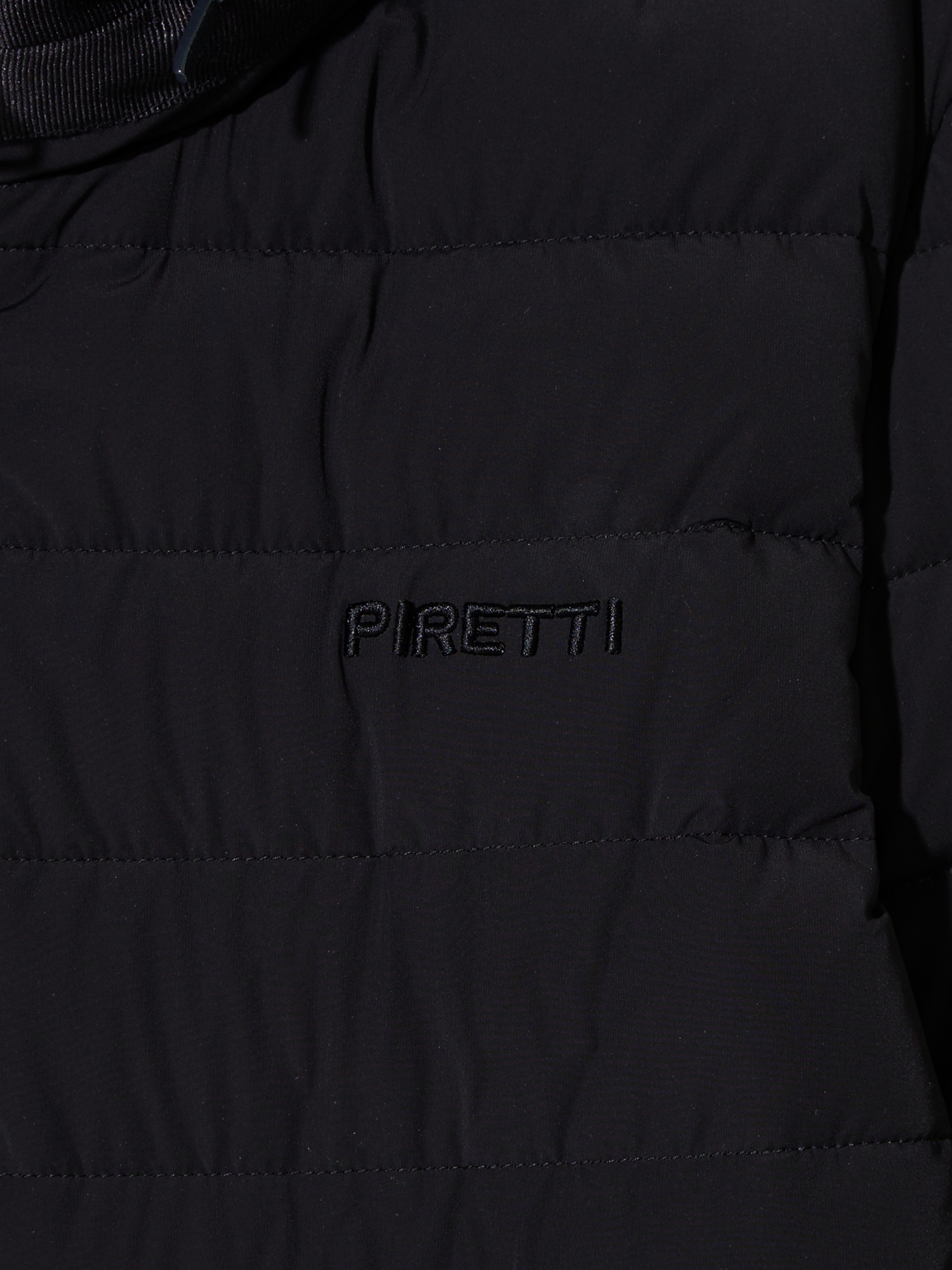 - 힘있게 서있는 스탠칼라에 PIRETTI 볼륨 로고 자수로 포인트를 줌