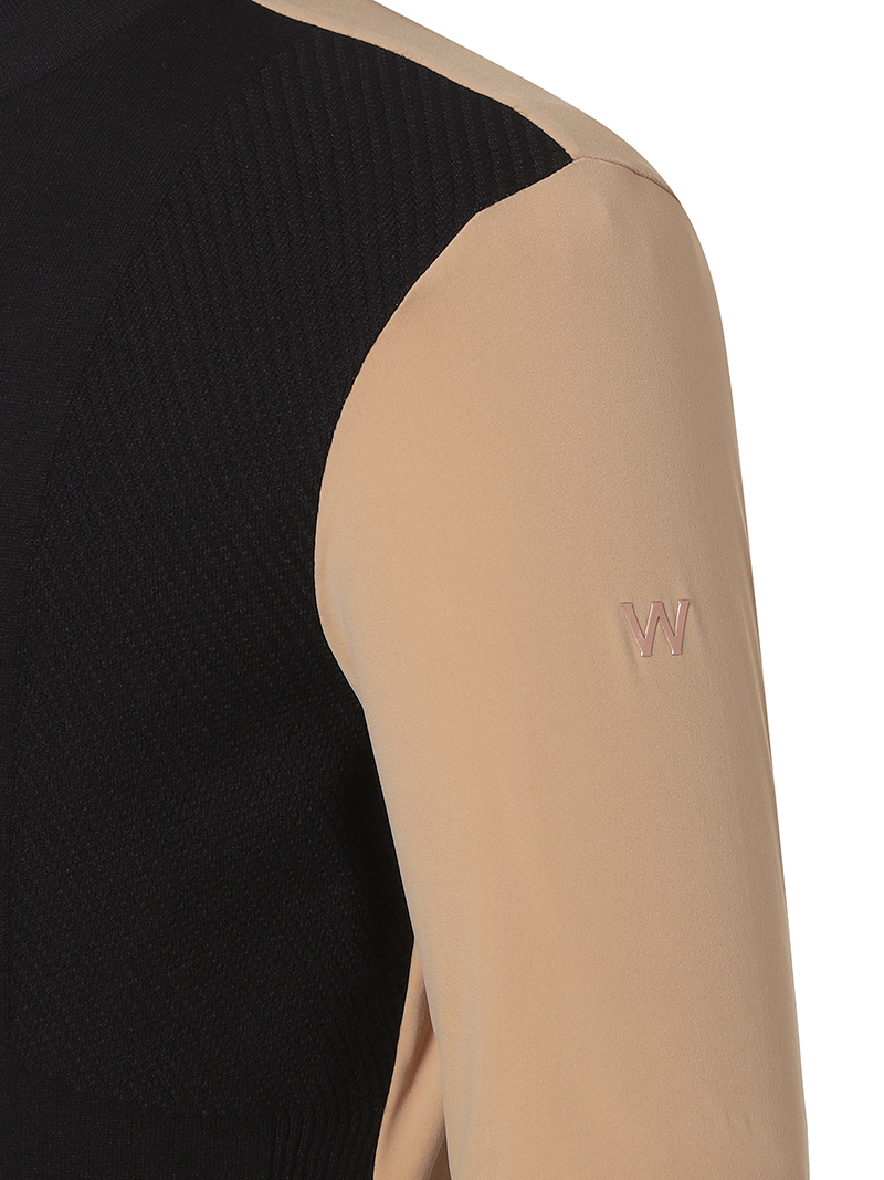 - 등, 소매는 스트레치와 터치감이 우수한 트리코트 기모 소재를 믹스한 은은한 로고 조직으로 포인트를 더한 아이템