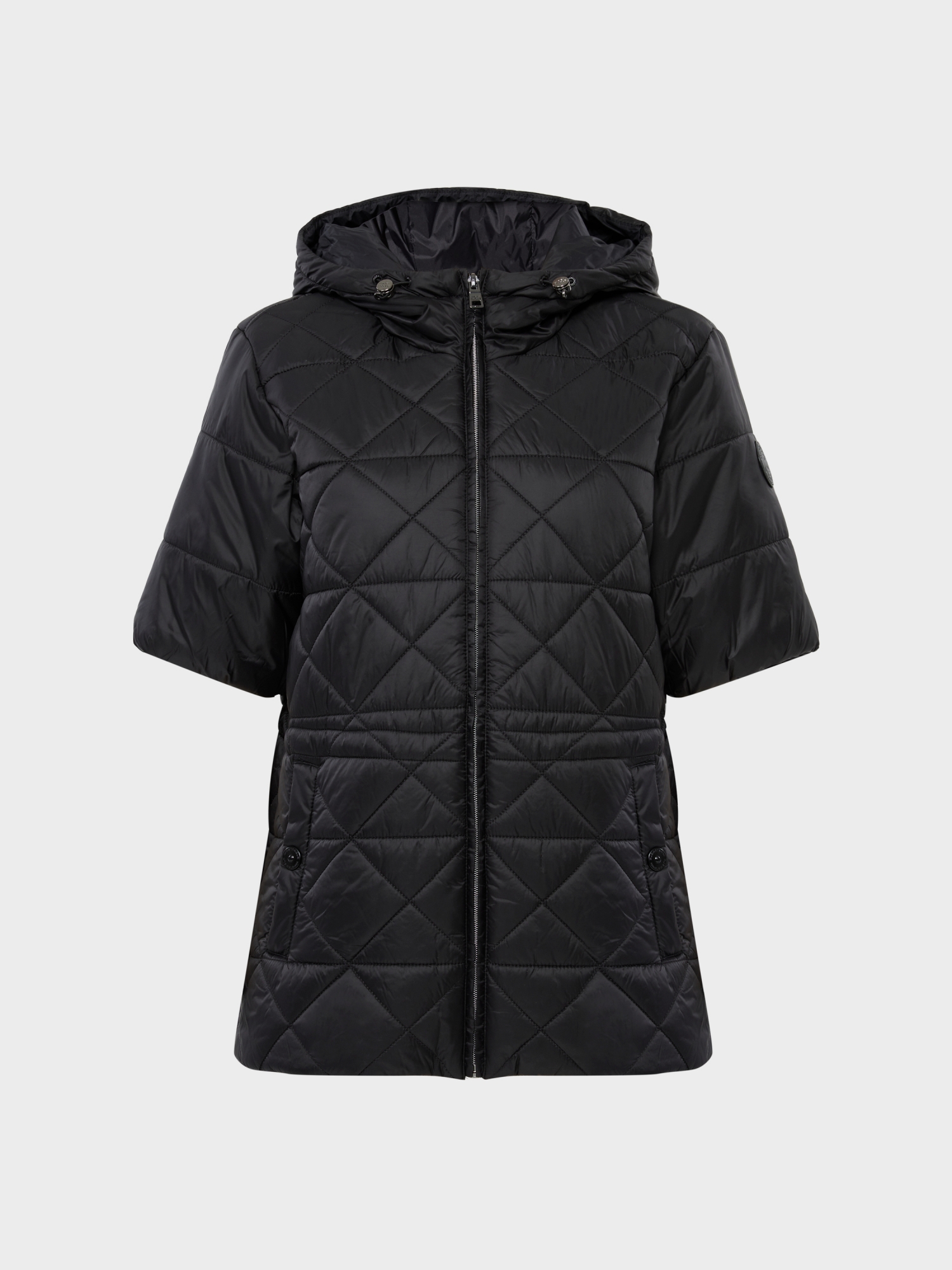 - 과하지 않으면서도 세련된 퀼팅모양으로 새롭게 선보이는 미디기장 반팔 자켓으로 허리 스트링 디테일로 여러 실루엣 연출 가능