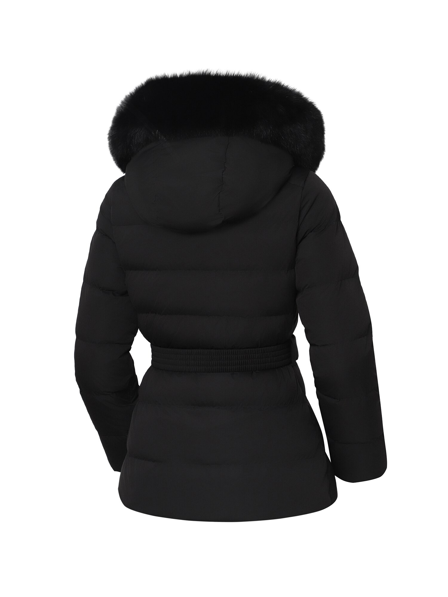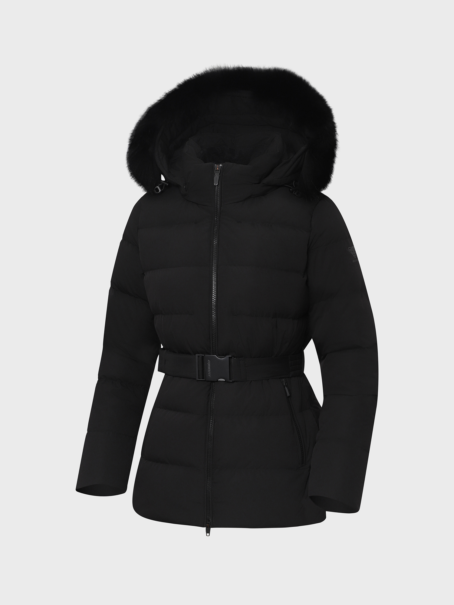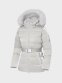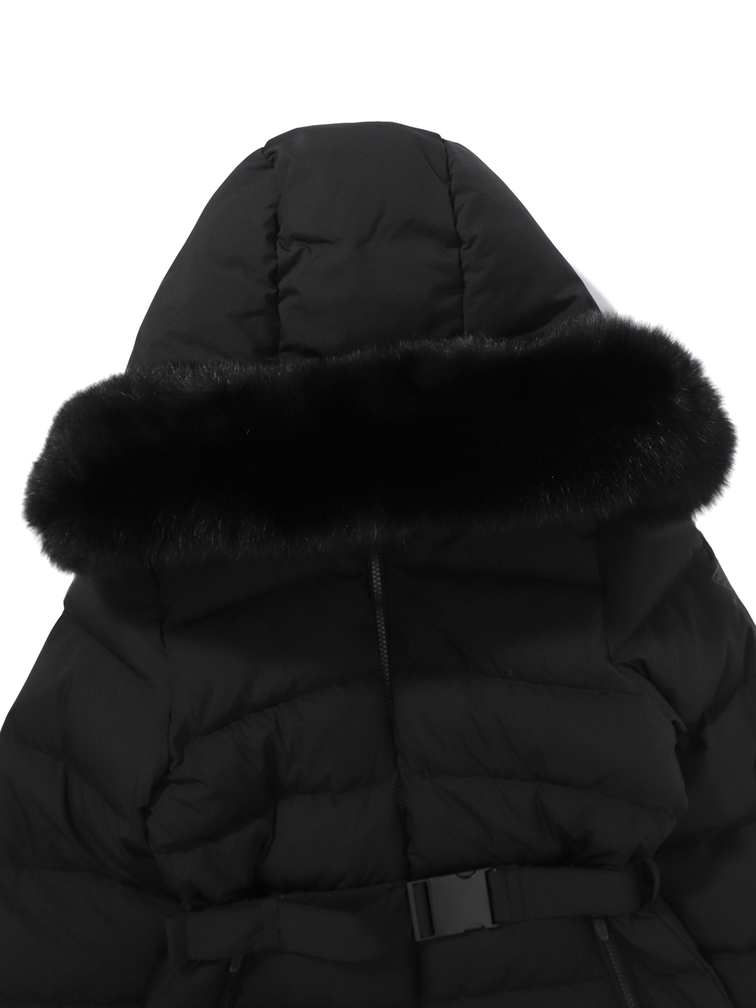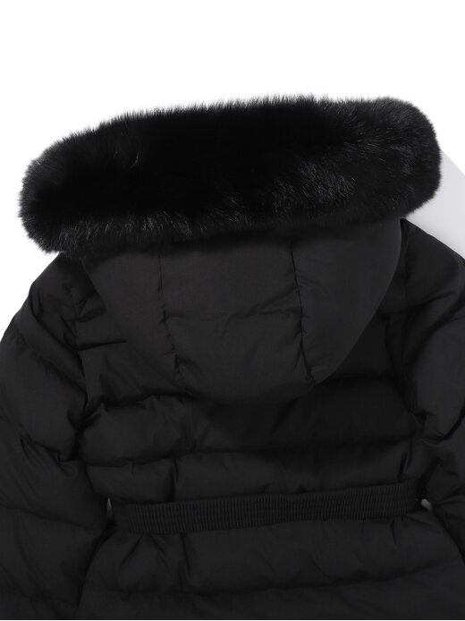 [여성스러운 실루엣의 중힙기장의 블루폭스 퍼후드형 사파리 다운]