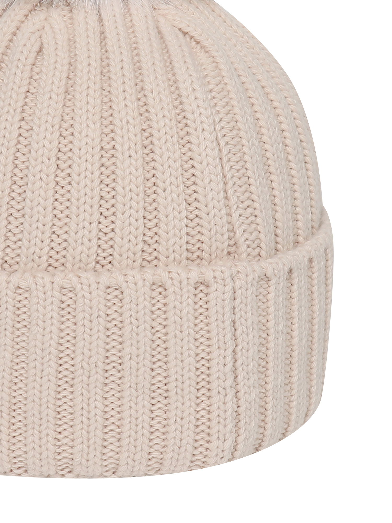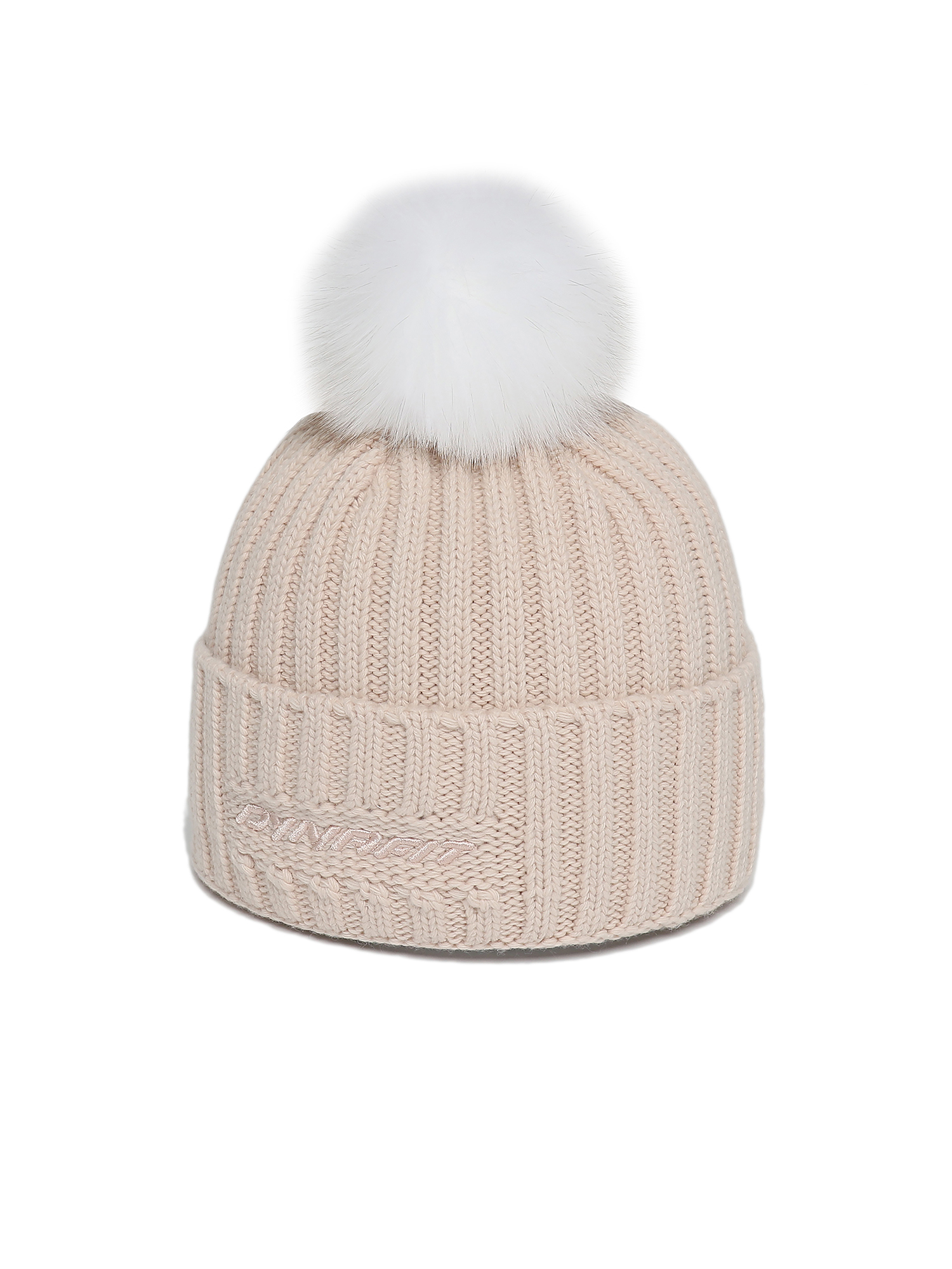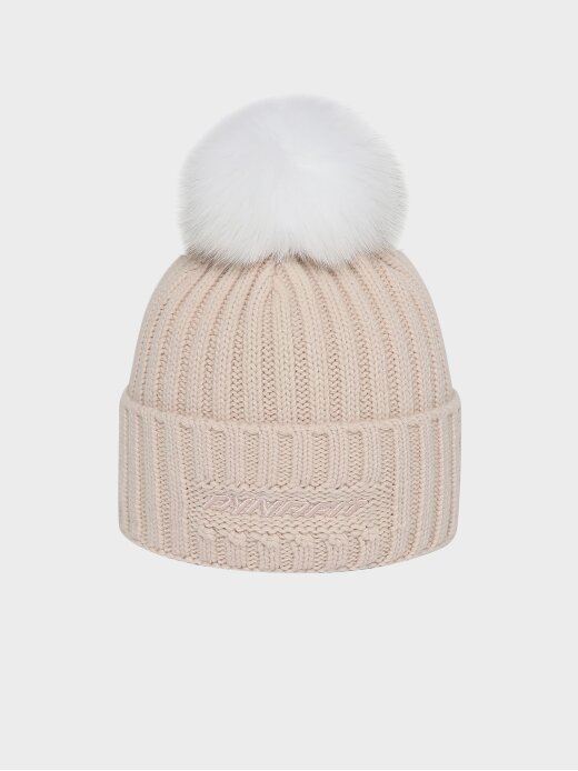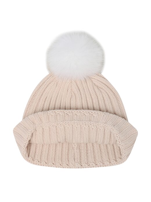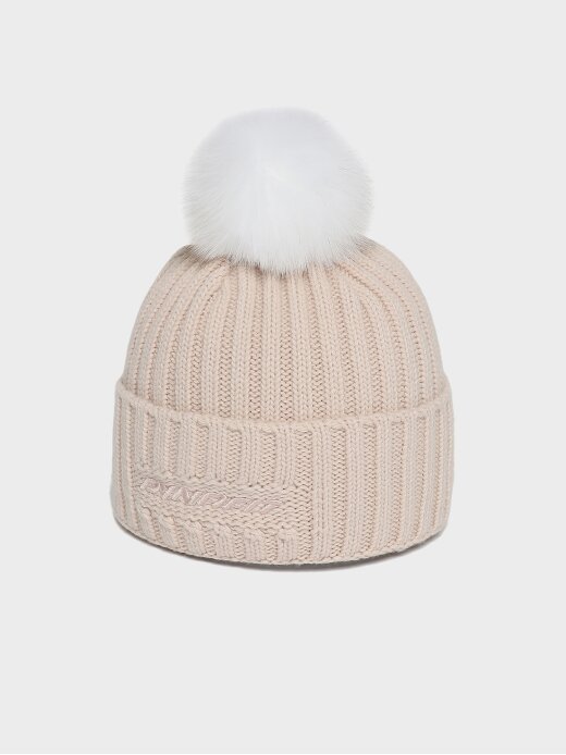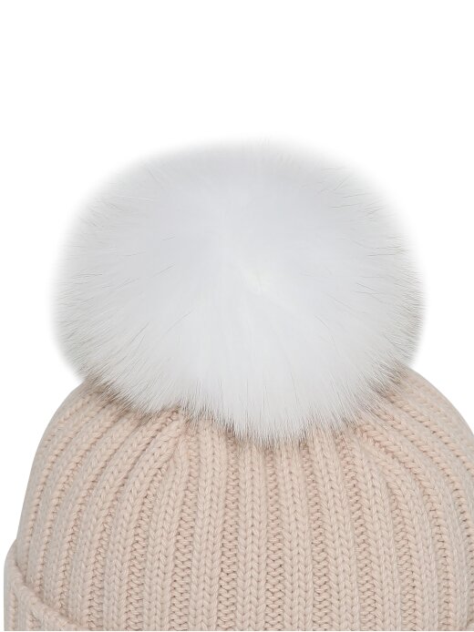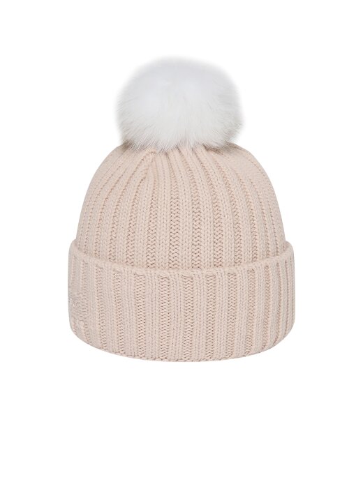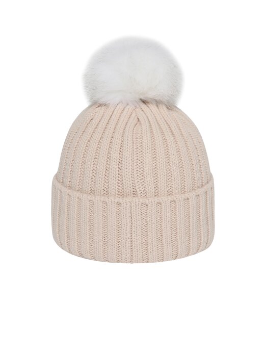 - 솔리드 컬러의 여성용 방울 비니로 원단 매칭 볼륨 자수와 폭스퍼로 포인트를 줌.