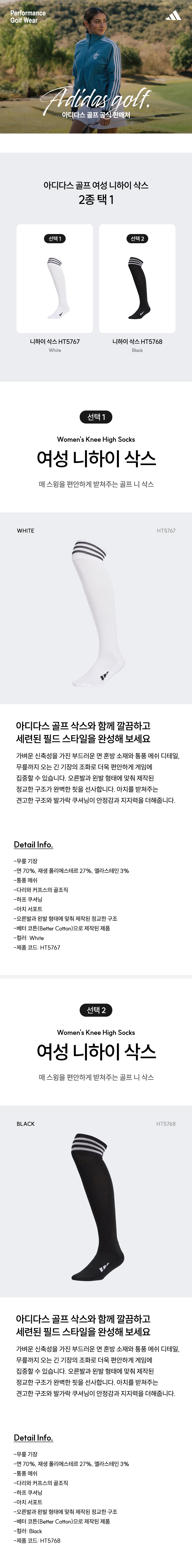 아디다스골프 양말 여성 니하이 삭스 화이트 블랙 2종 택1