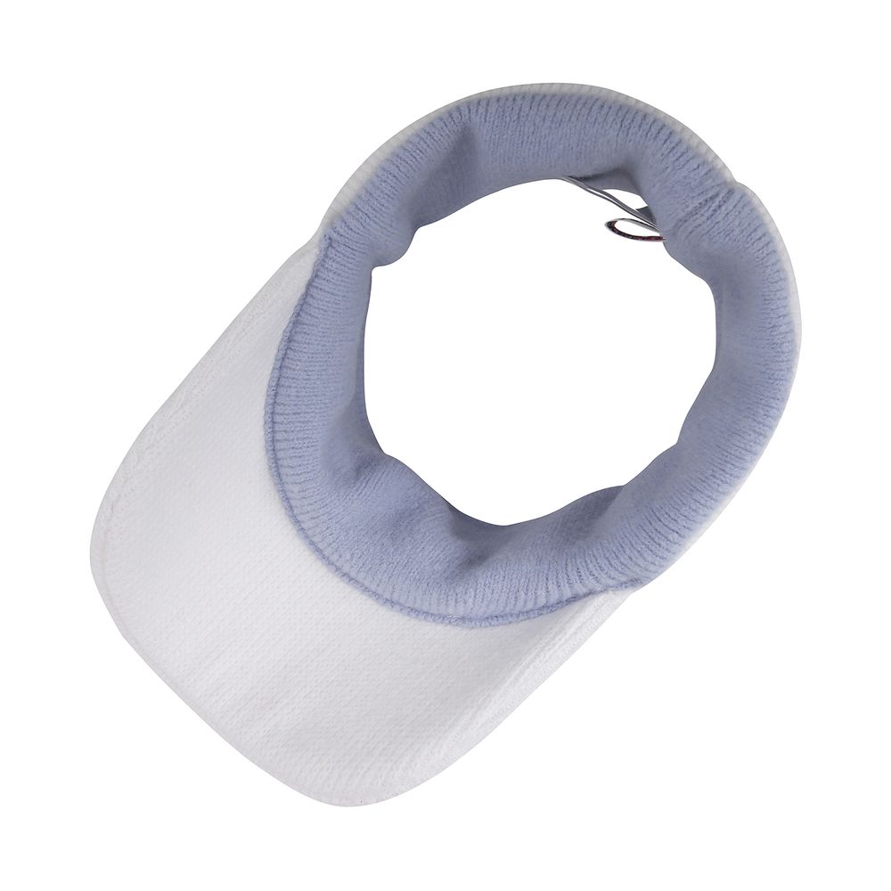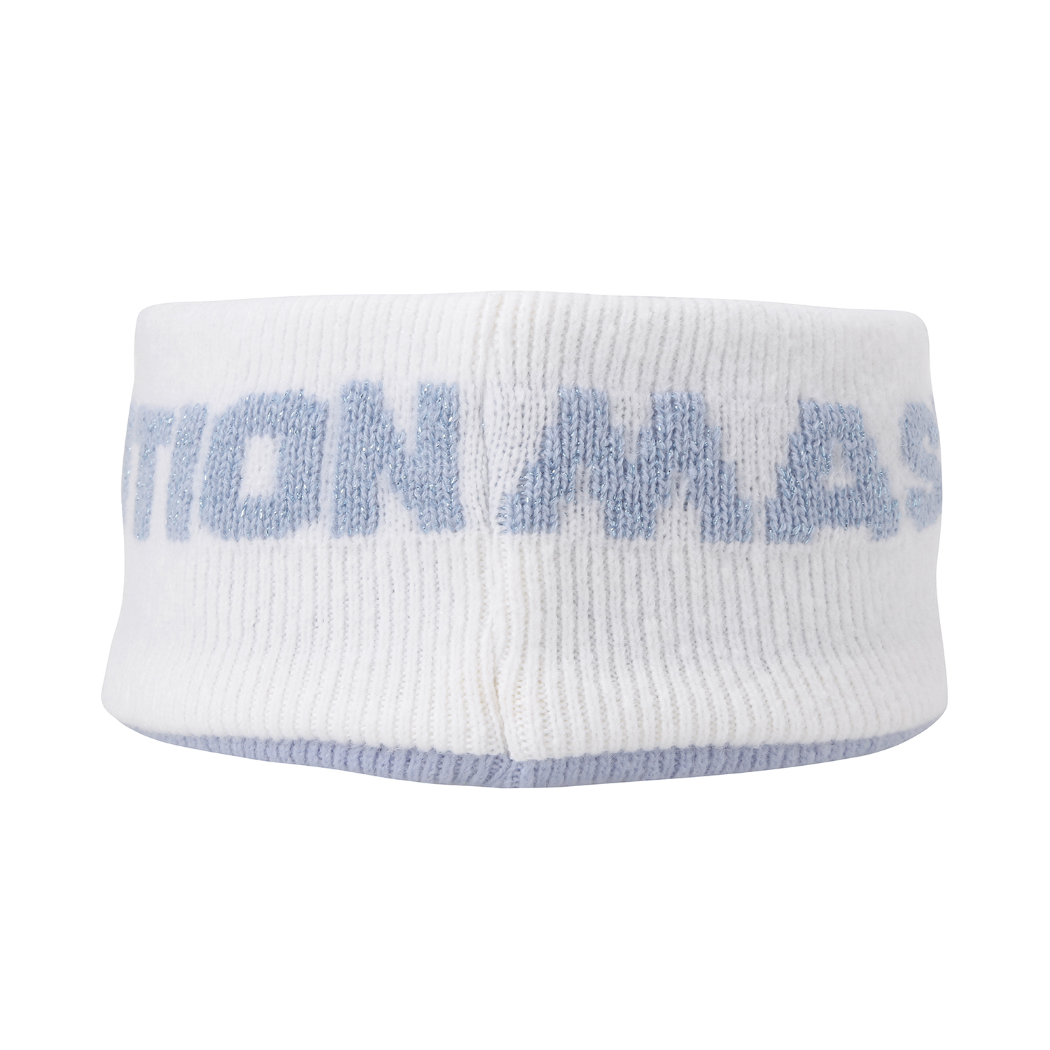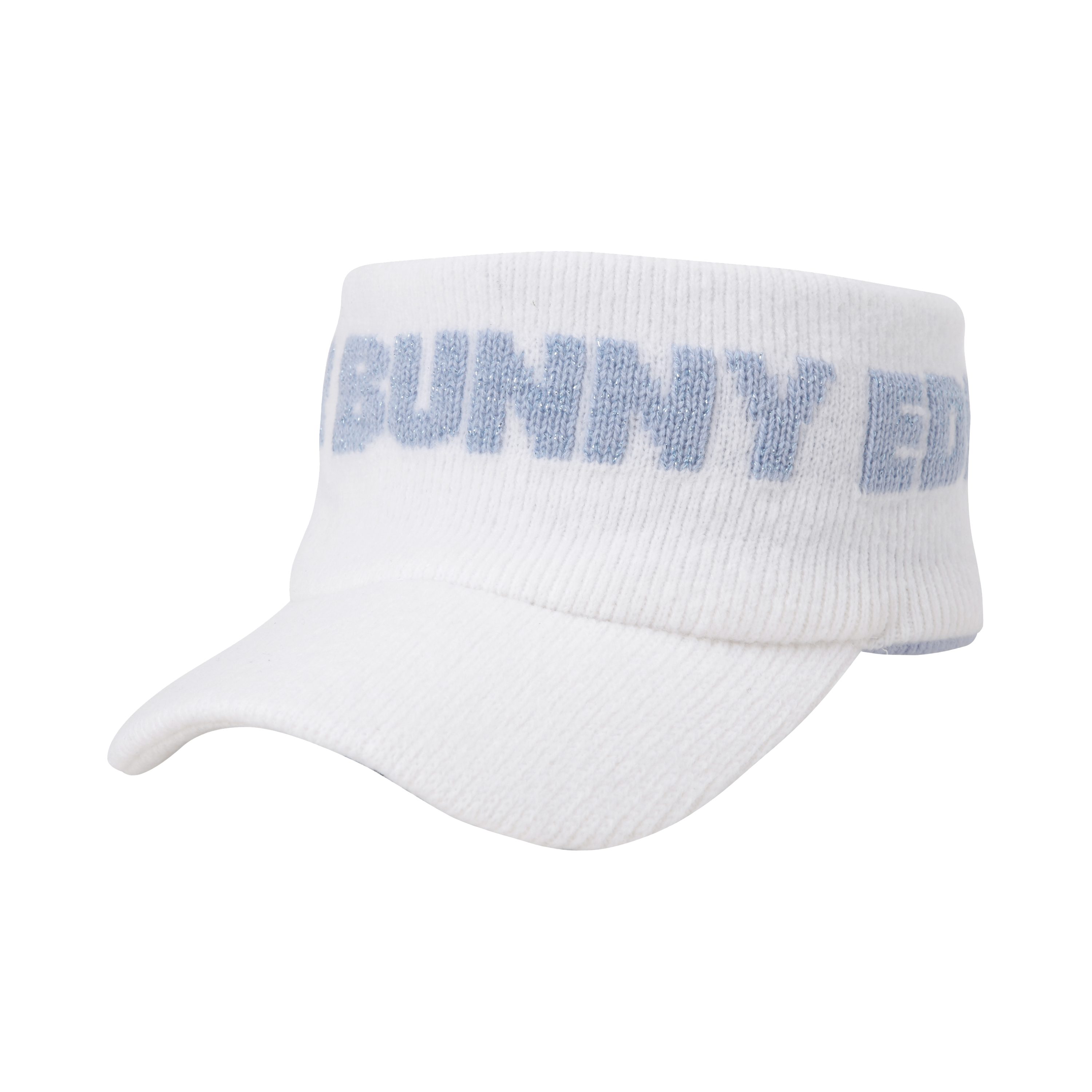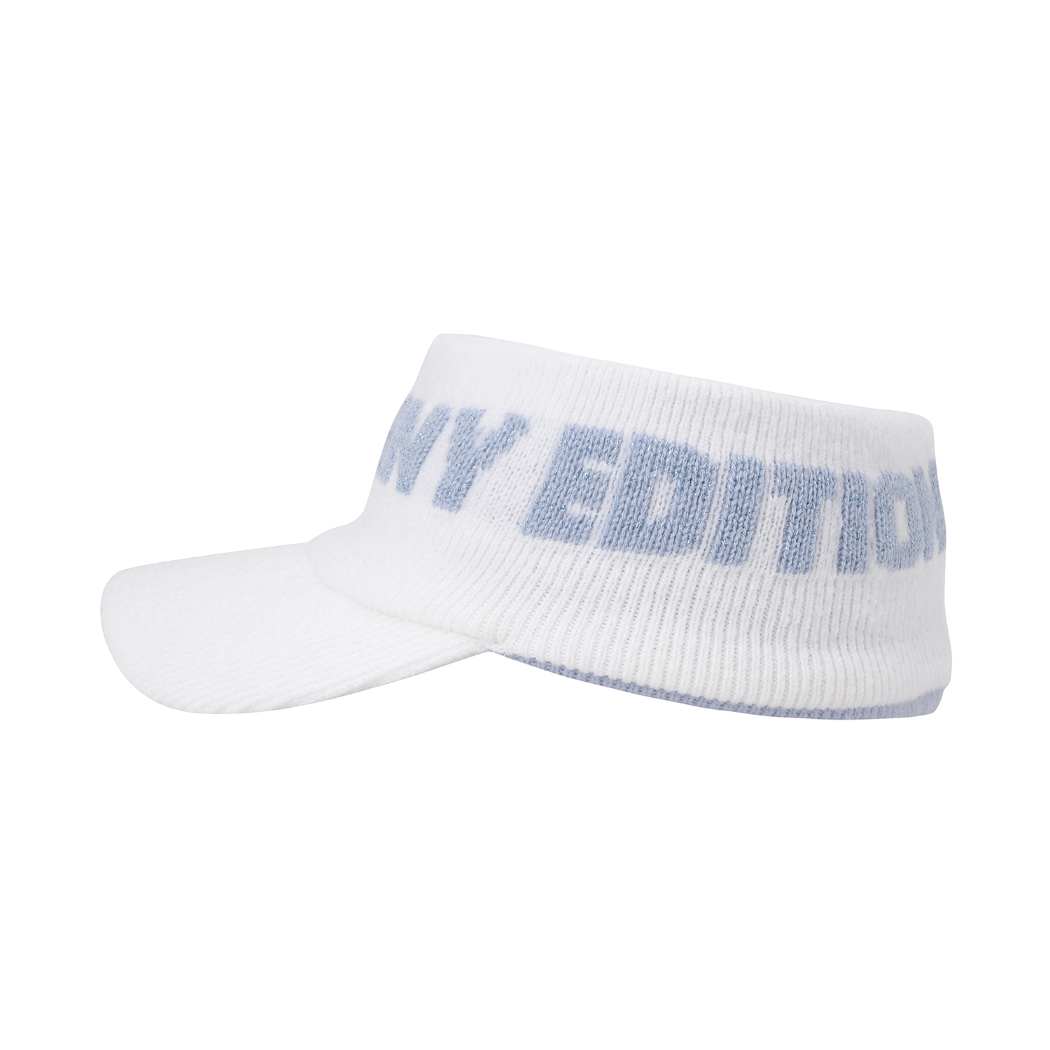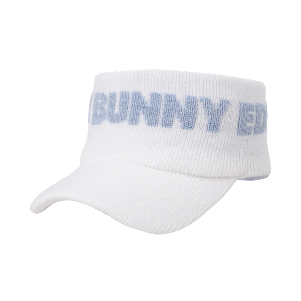* 메탈릭 로고 니트 선바이저 - 머리 전체를 감싸는 메탈릭한 로고 자카드가 특징인 니트 바이저