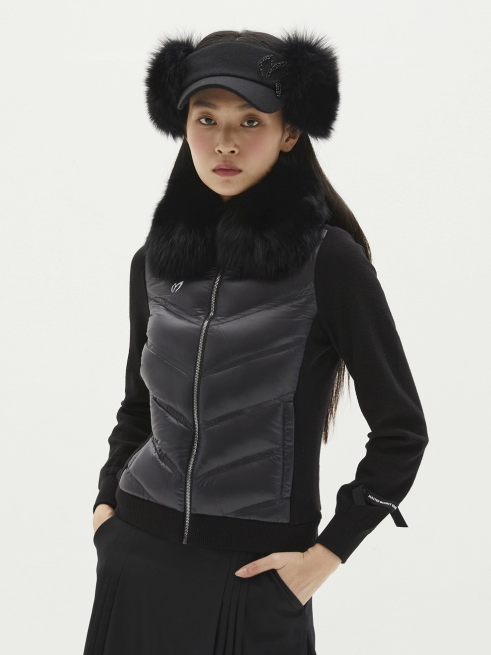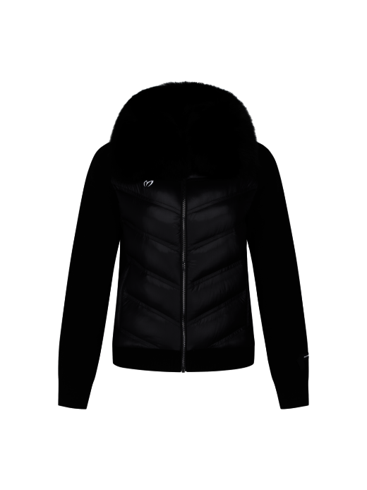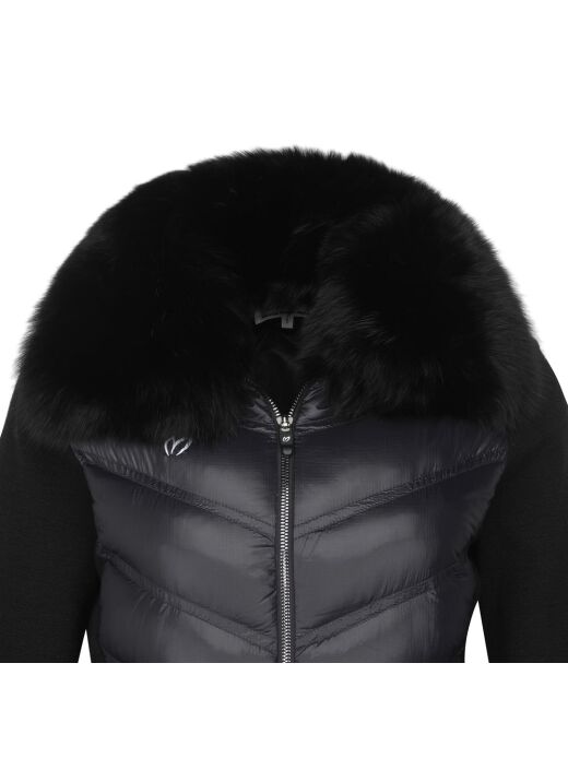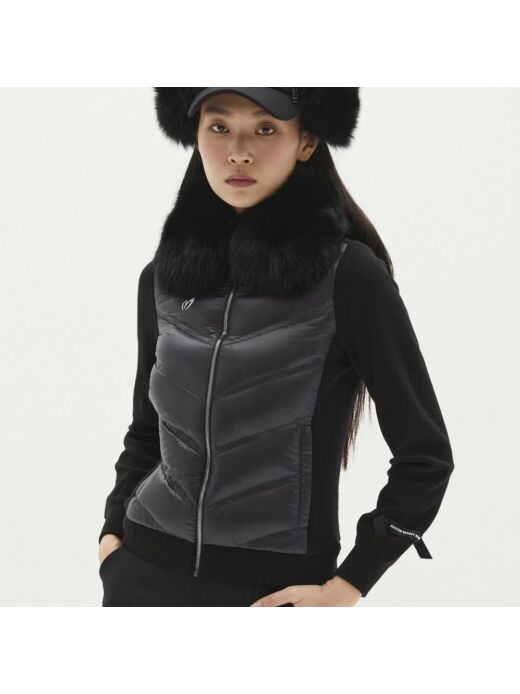 탈부착이 가능한 블루폭스스킨 후드와 폭스스킨도 탈착이 가능한 트리밍으로 장식하여 날씬한 핏감을 주는 입체라인으로 데일리 코디에도 용이한 다운 가디건신축성 있는 우븐 소재와 울혼방 소재를 믹스하여 겨울에도 보온성을 유지할수 있음*방풍안감有, WASHABLE WOOL
