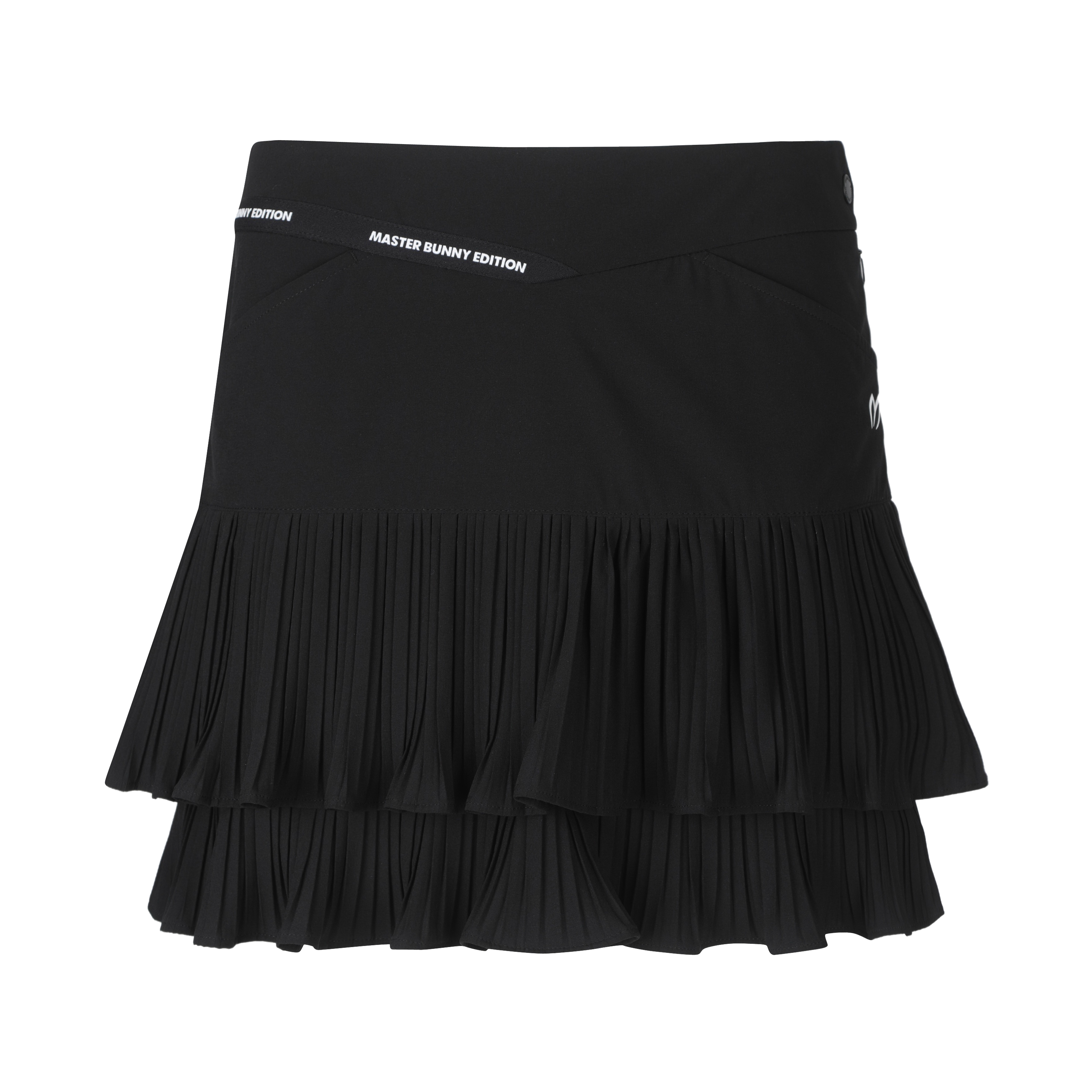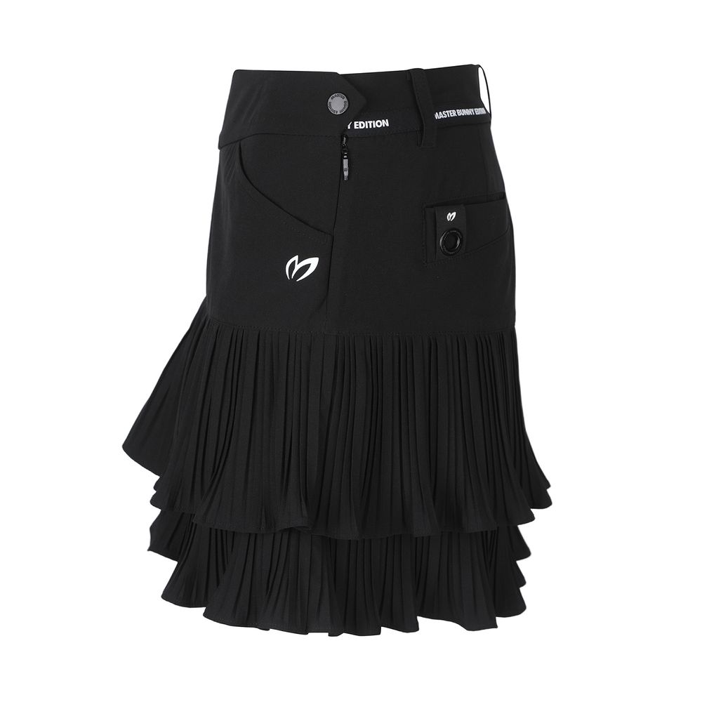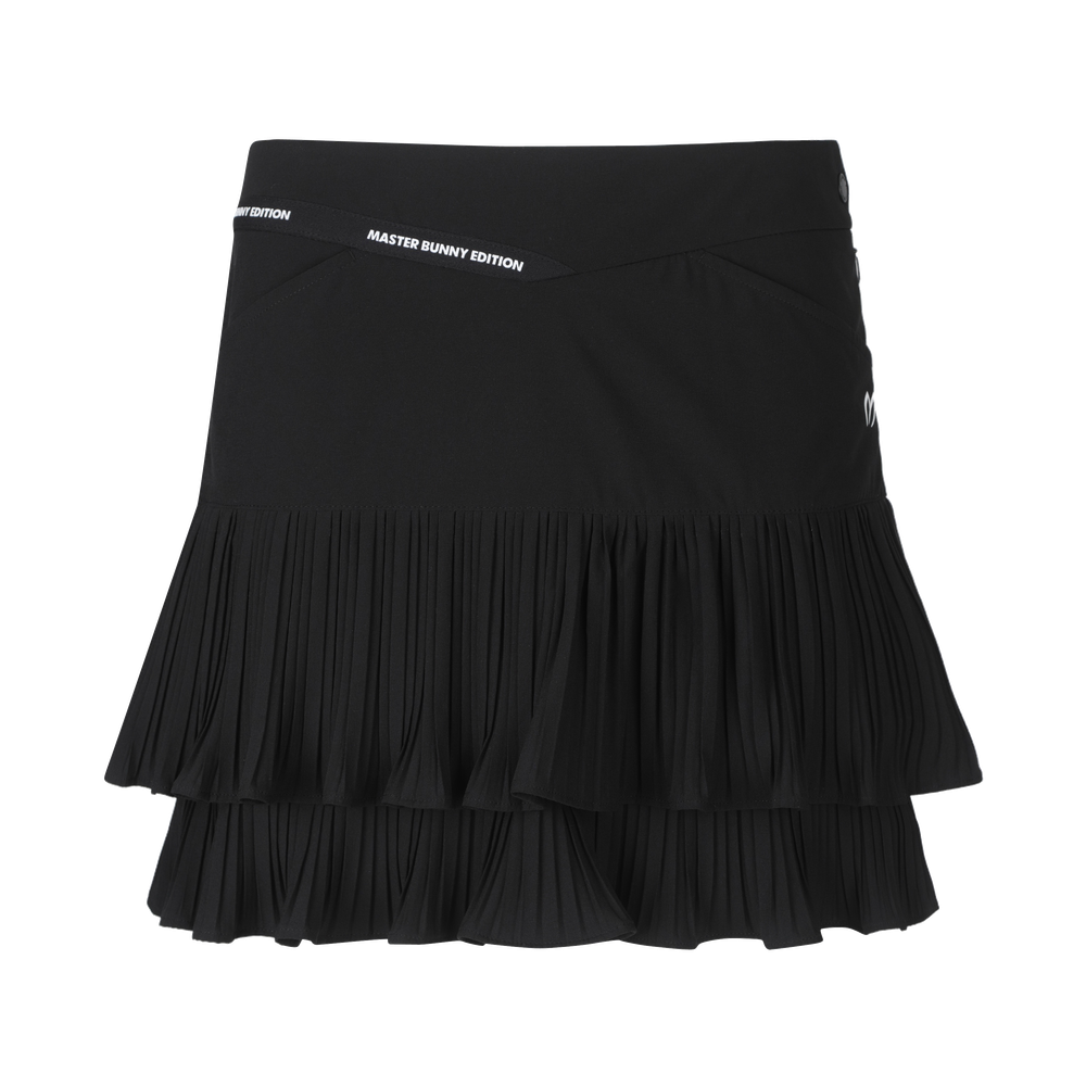 고신축 경량 폴리/스판 원단을 사용한 2단 불규칙 주름 포인트의 봄 스커트. 오비 부분에 마스터바니 로고 테잎을 배색하여 디자인 포인트로 활용.
