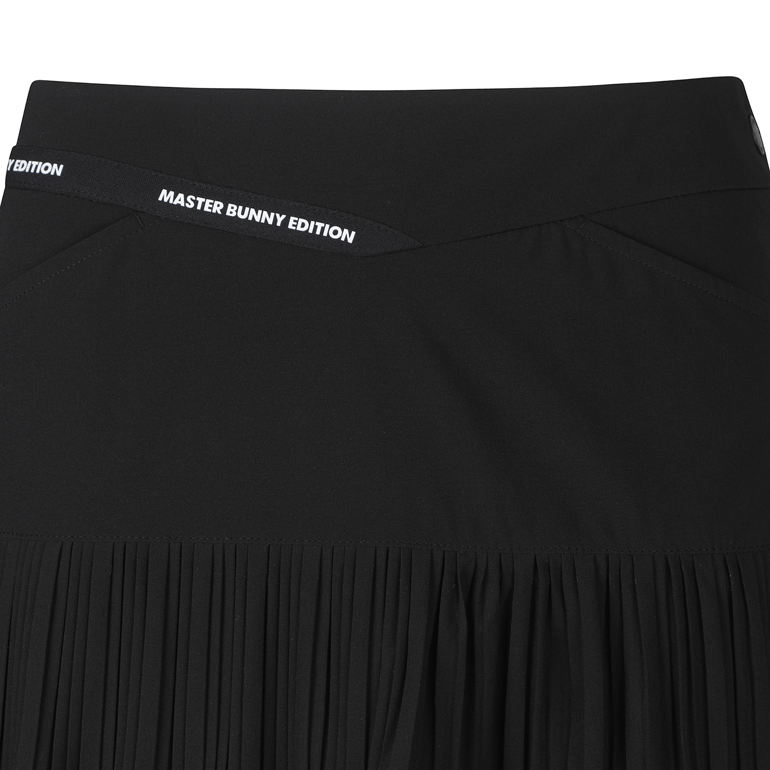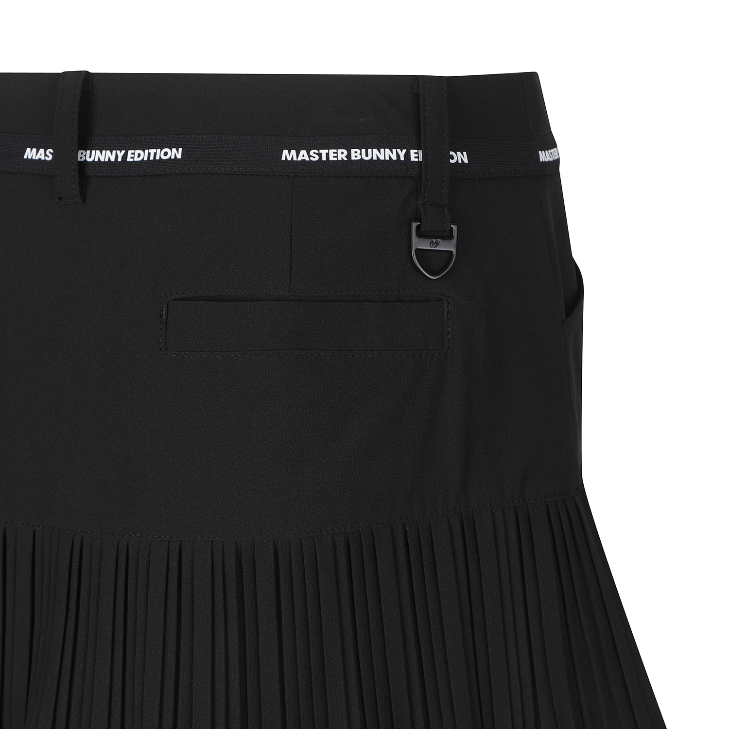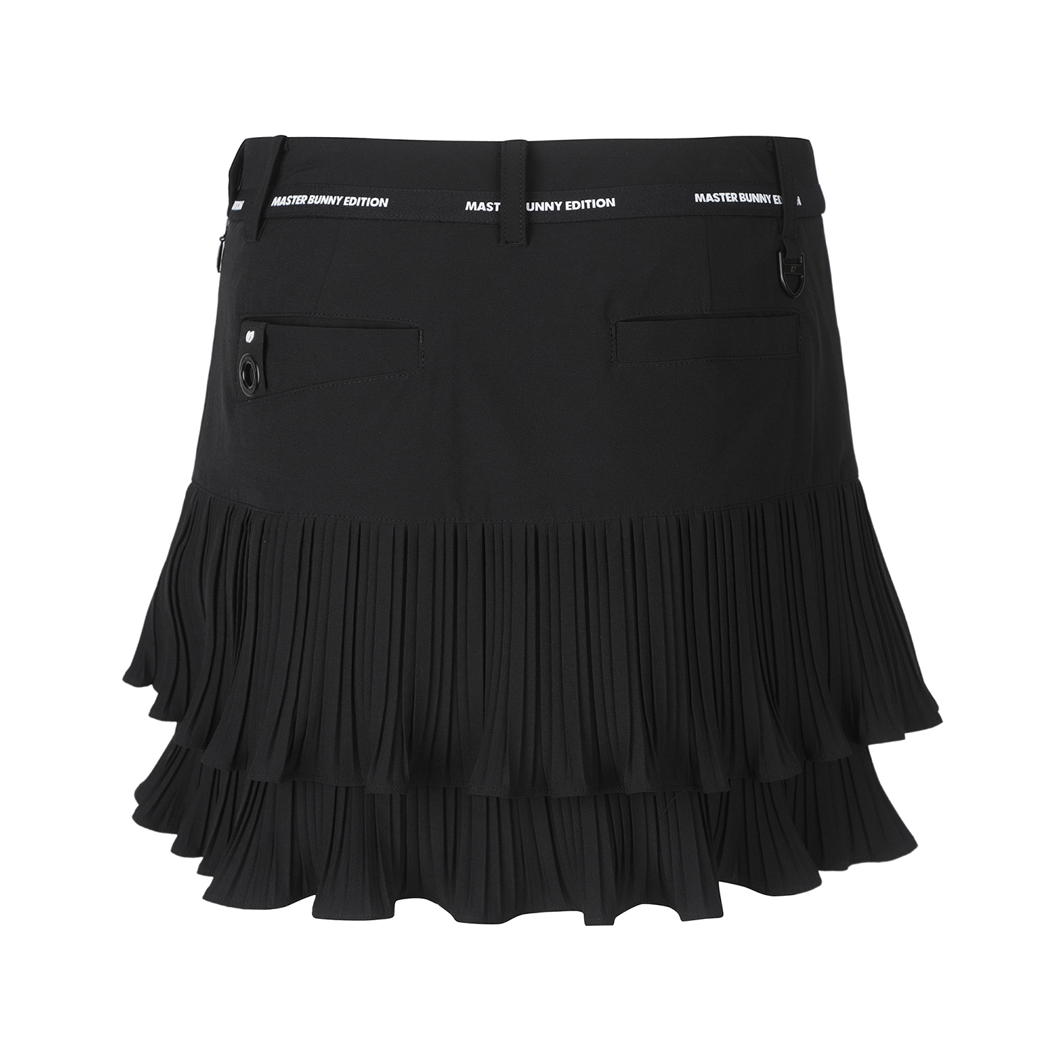 고신축 경량 폴리/스판 원단을 사용한 2단 불규칙 주름 포인트의 봄 스커트. 오비 부분에 마스터바니 로고 테잎을 배색하여 디자인 포인트로 활용.