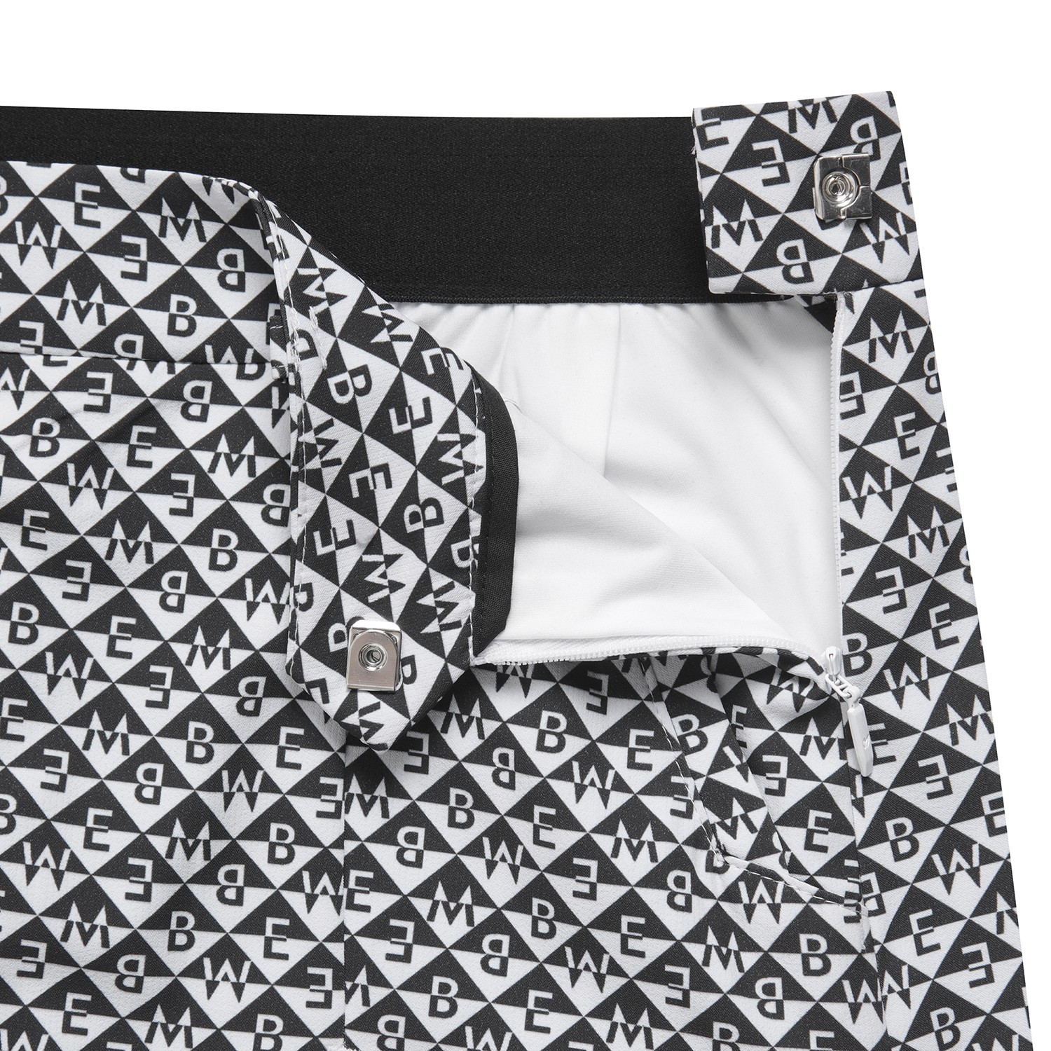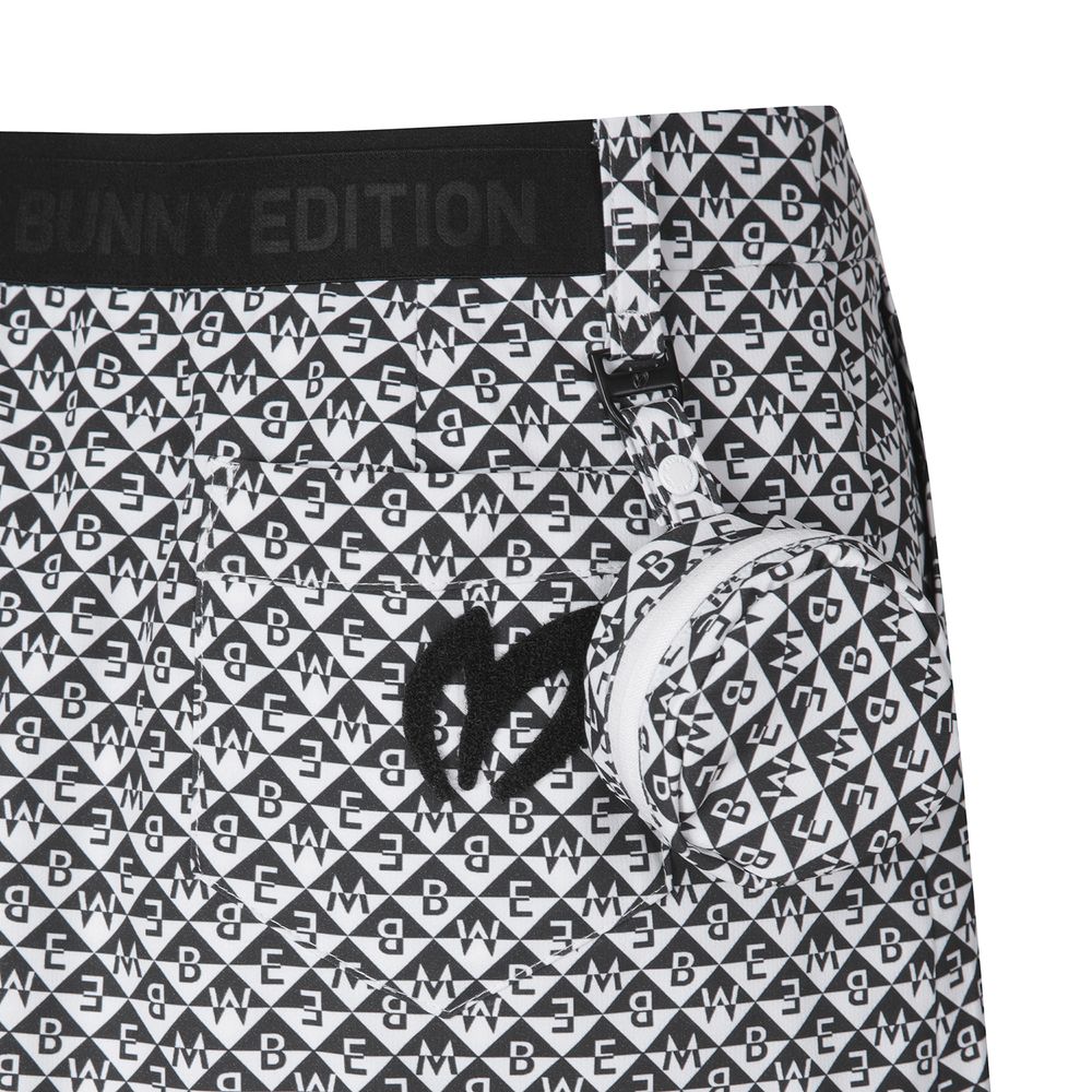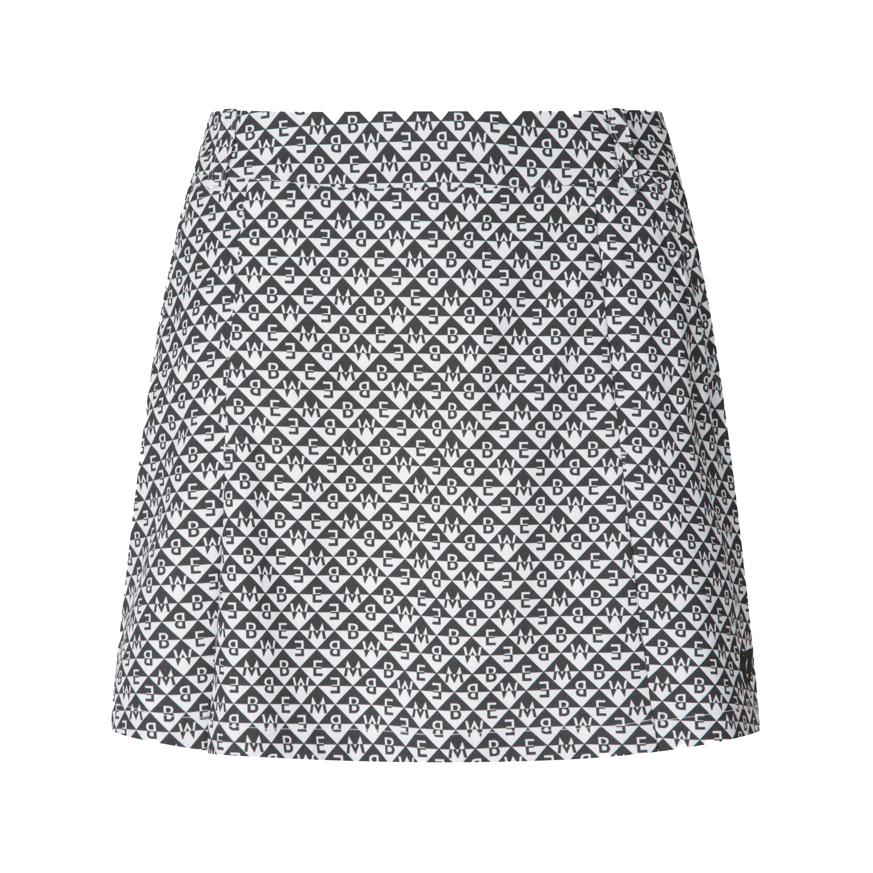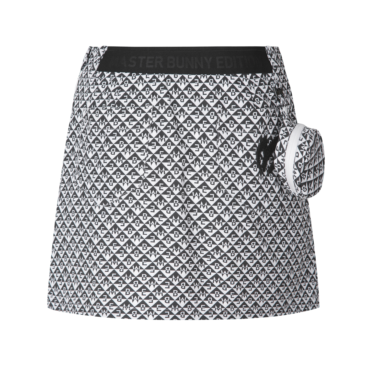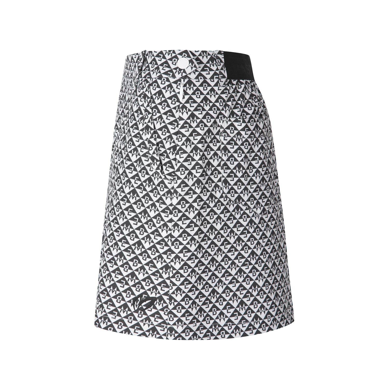 시즌 다양하게 진행되는 다이아몬드 형태의 마스터바니 로고가 프린트된 고신축 폴리/스판 원단과 터치감이 좋은 일본 수입 폴리/스판 소재가 사용된 스커트. 앞판에 대칭 형태의 주름을 디자인 포인트로 활용. 볼케이스 포함.
