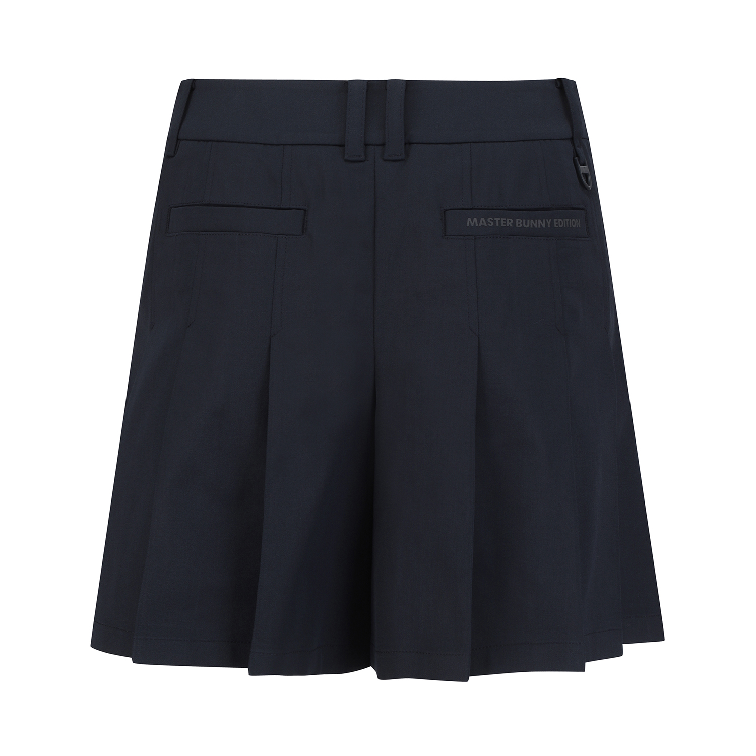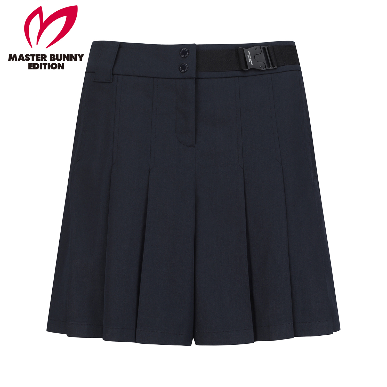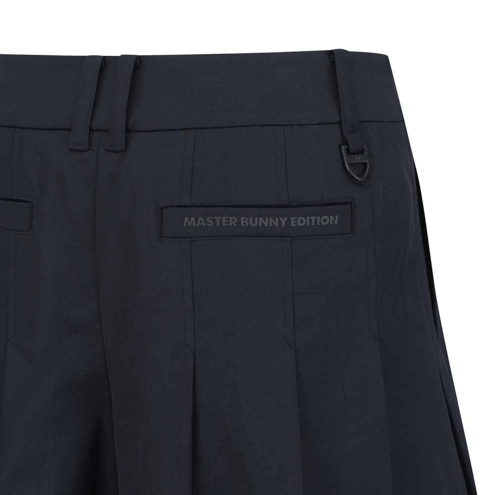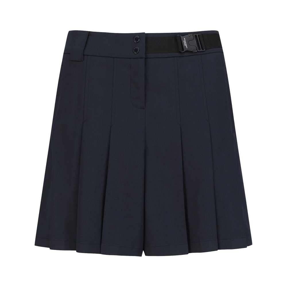 전체 플리츠로 인해 스커트처럼 보이는 5부 반바지.허리 부분 로고 버클 장식으로 포인트를 줌.폴리, 면, 린넨이 섞인 일본 수입 소재를 사용해 쾌적한 착용감을 줍니다.