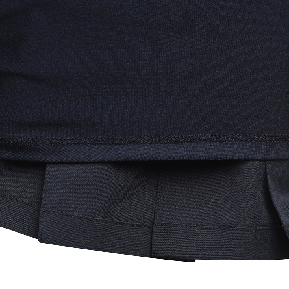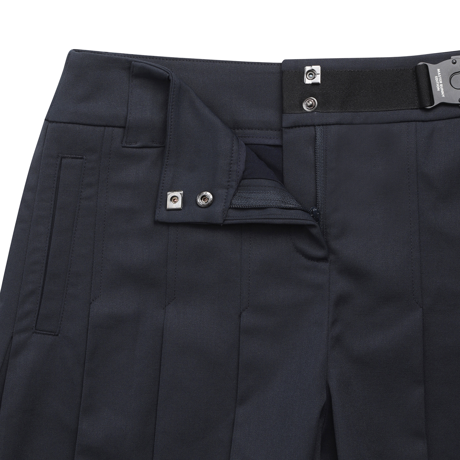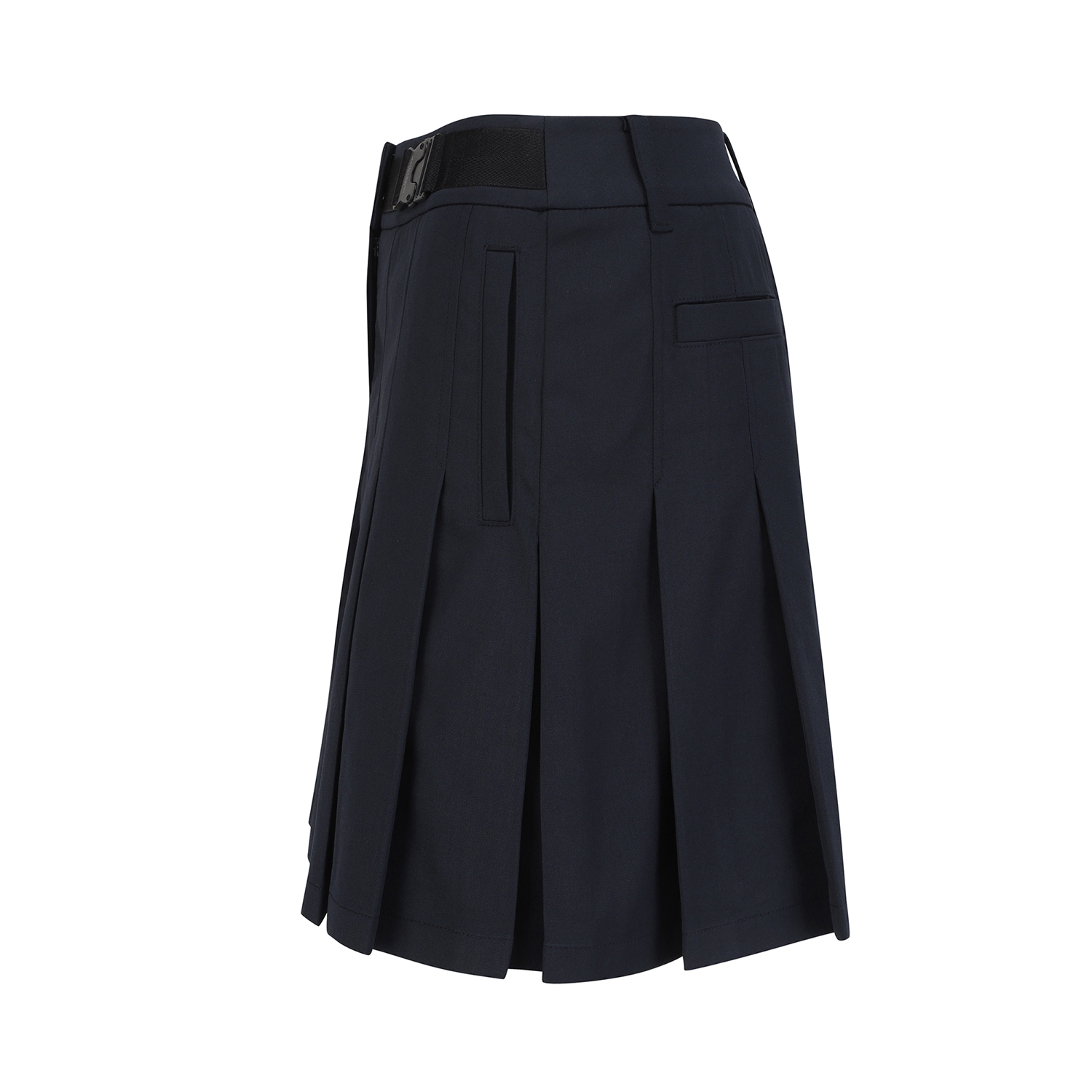 전체 플리츠로 인해 스커트처럼 보이는 5부 반바지.허리 부분 로고 버클 장식으로 포인트를 줌.폴리, 면, 린넨이 섞인 일본 수입 소재를 사용해 쾌적한 착용감을 줍니다.