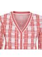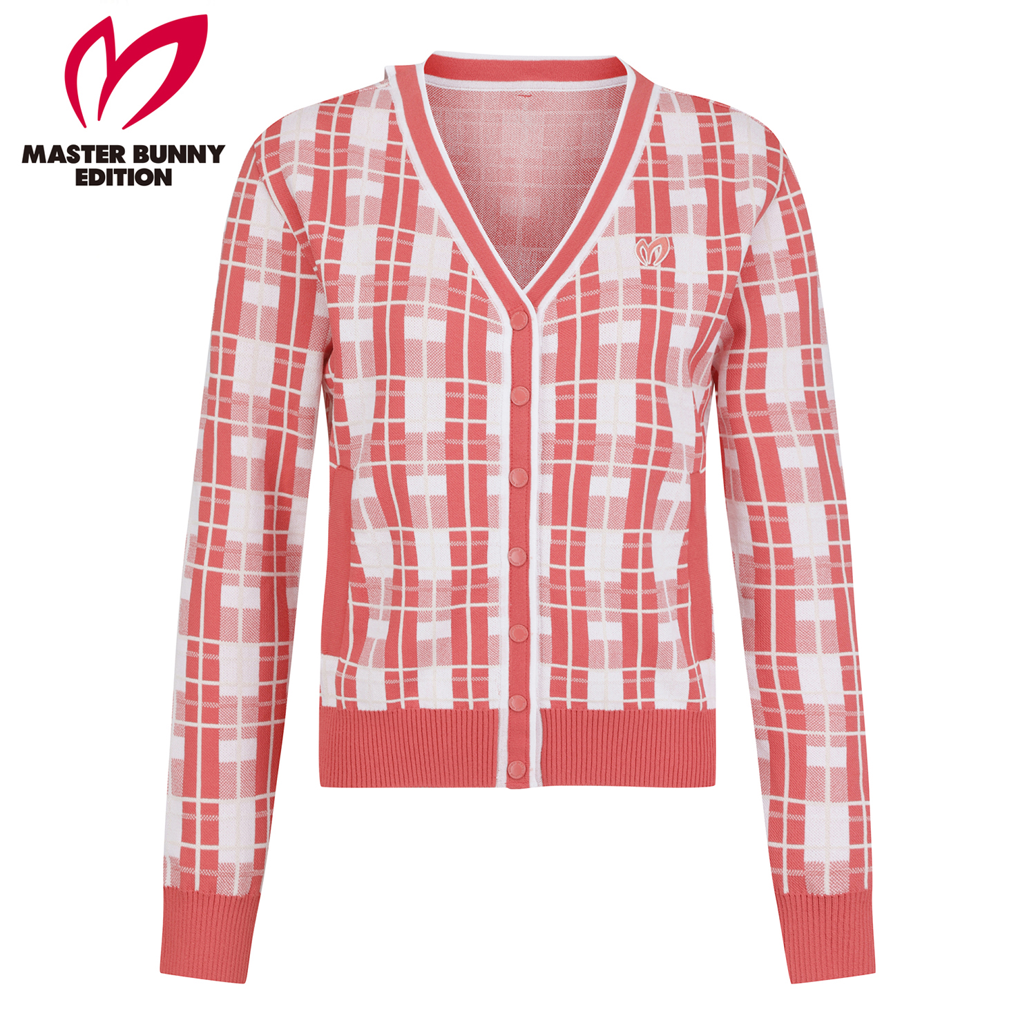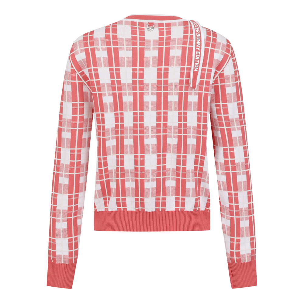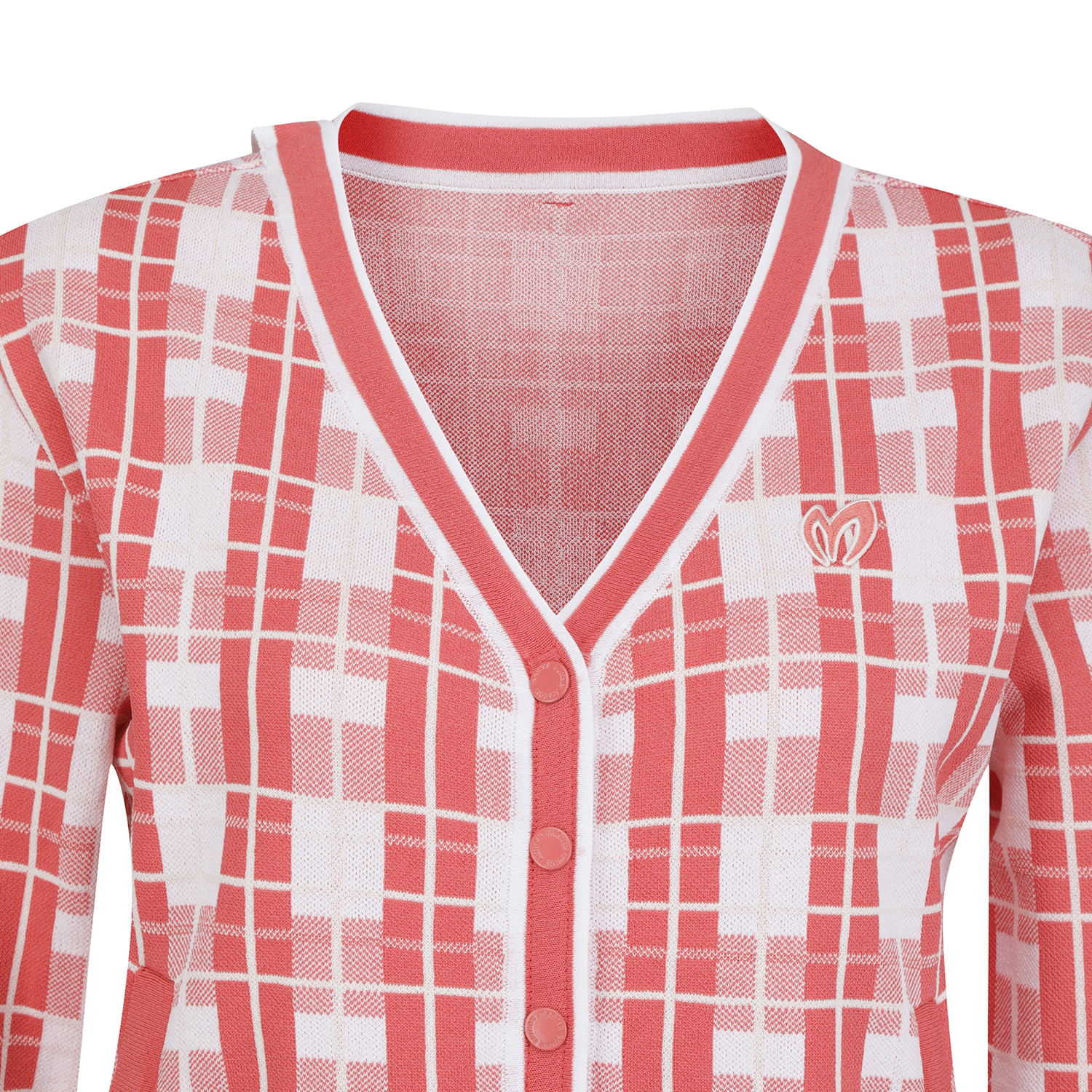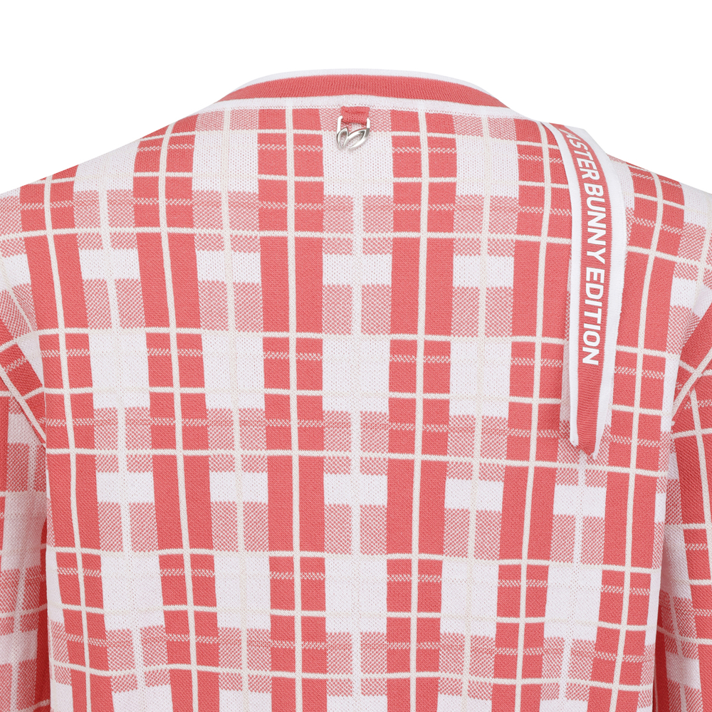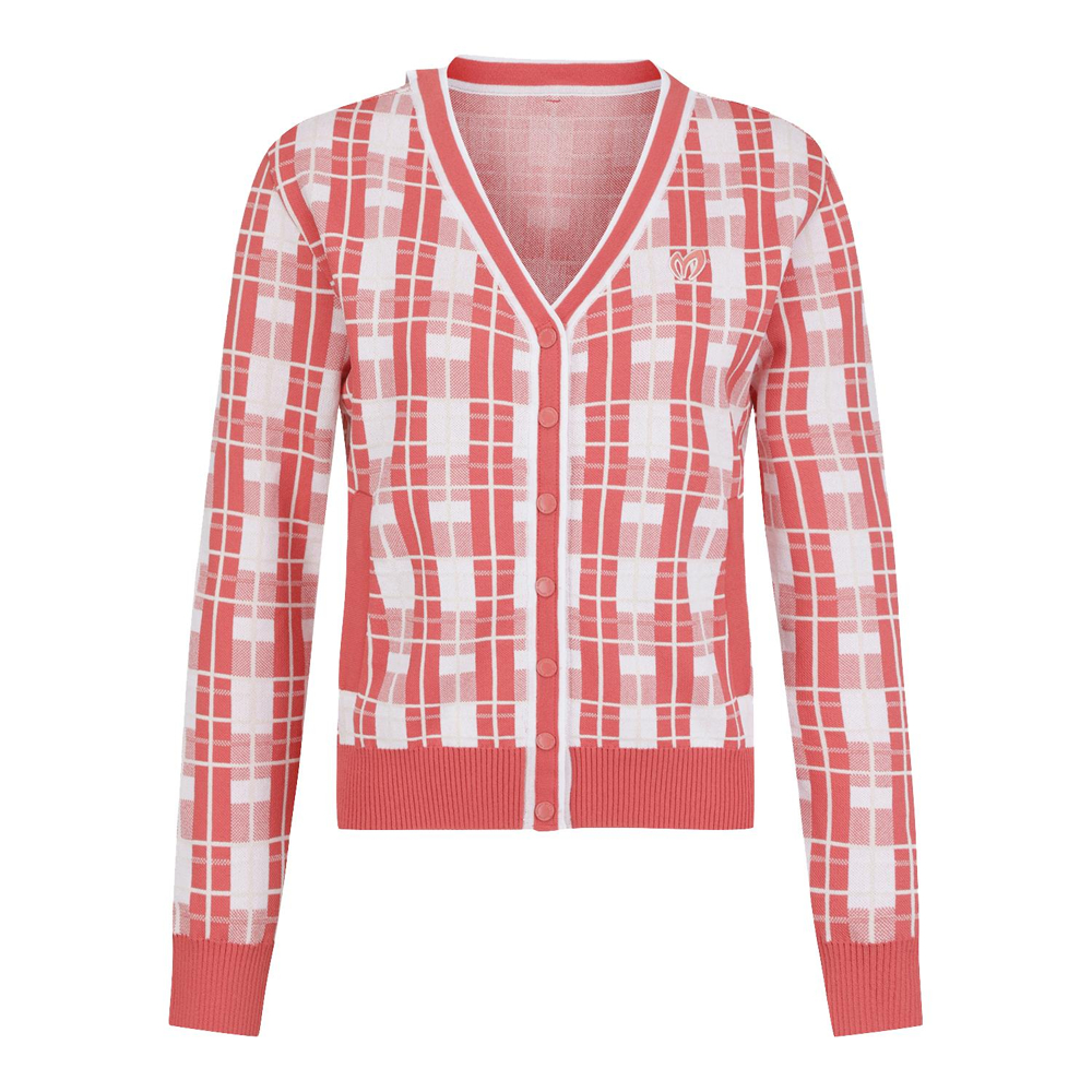 경쾌한 체크 패턴이 돋보이는 가디건네크라인과 연결되는 로고 프린트 테이프가 특징. 간절기 포인트 아이템으로 활용하기 좋습니다.