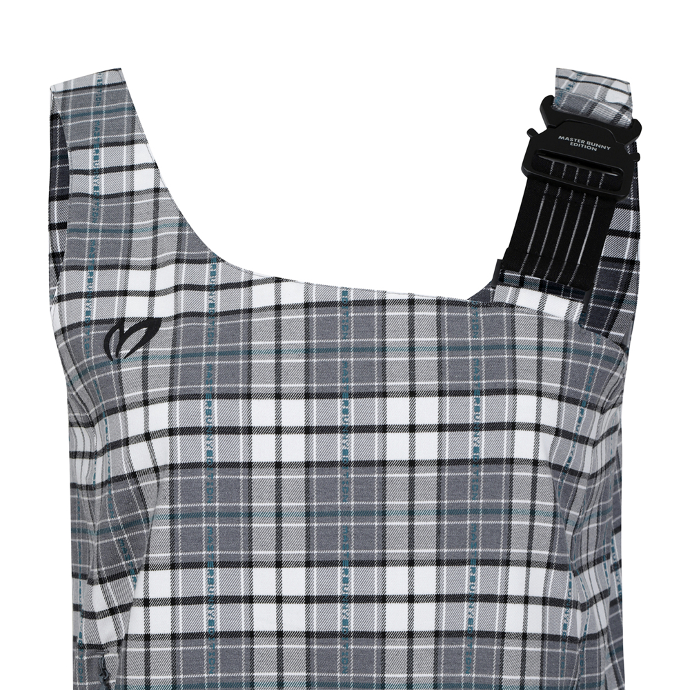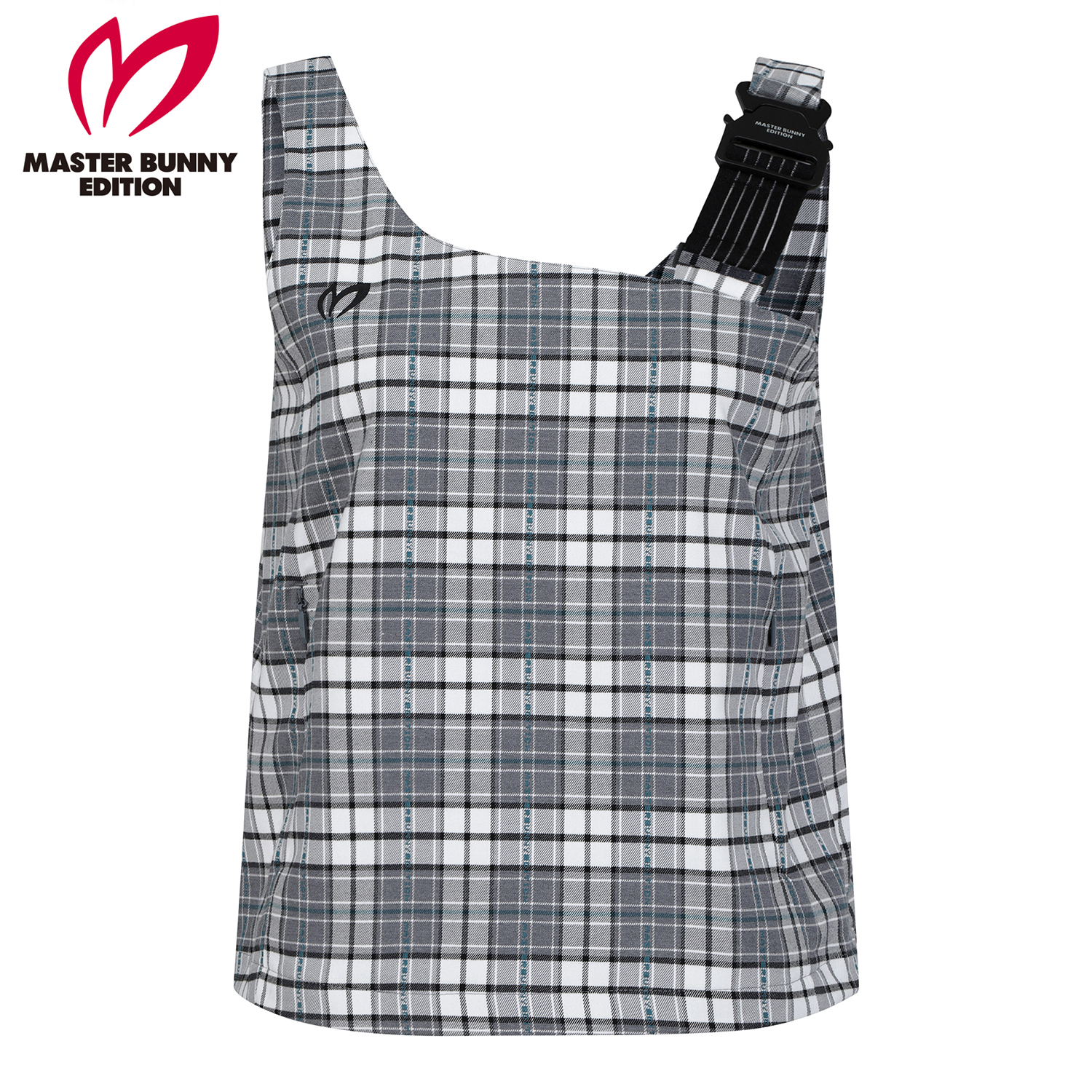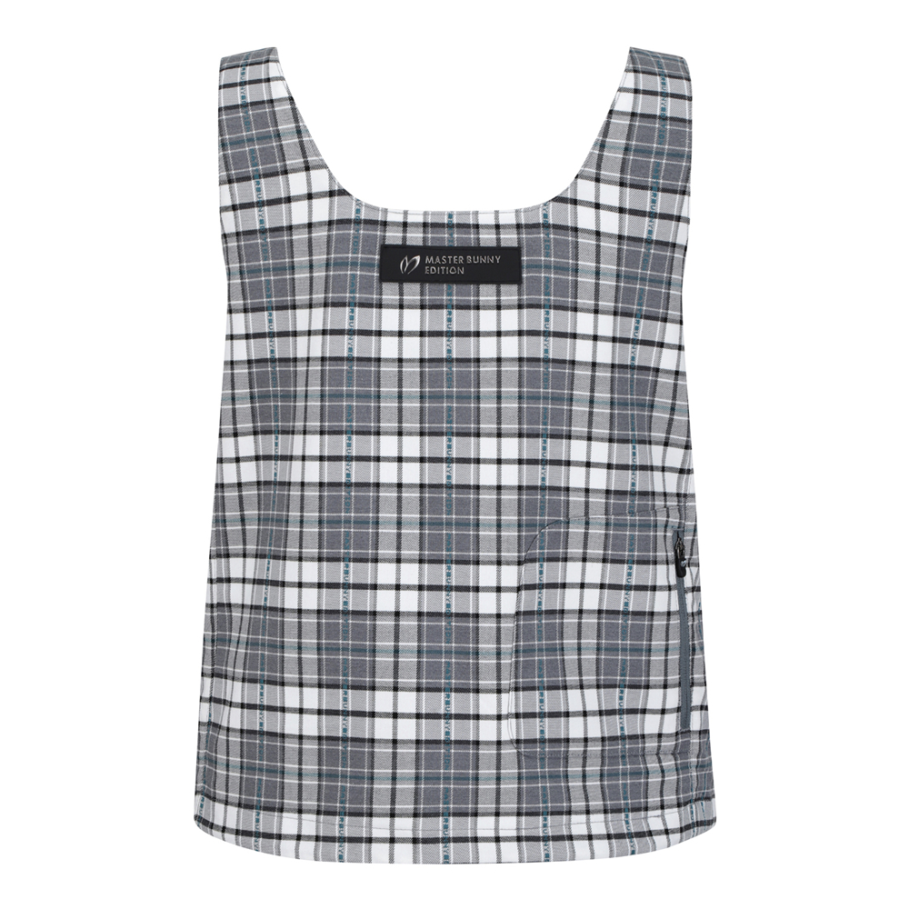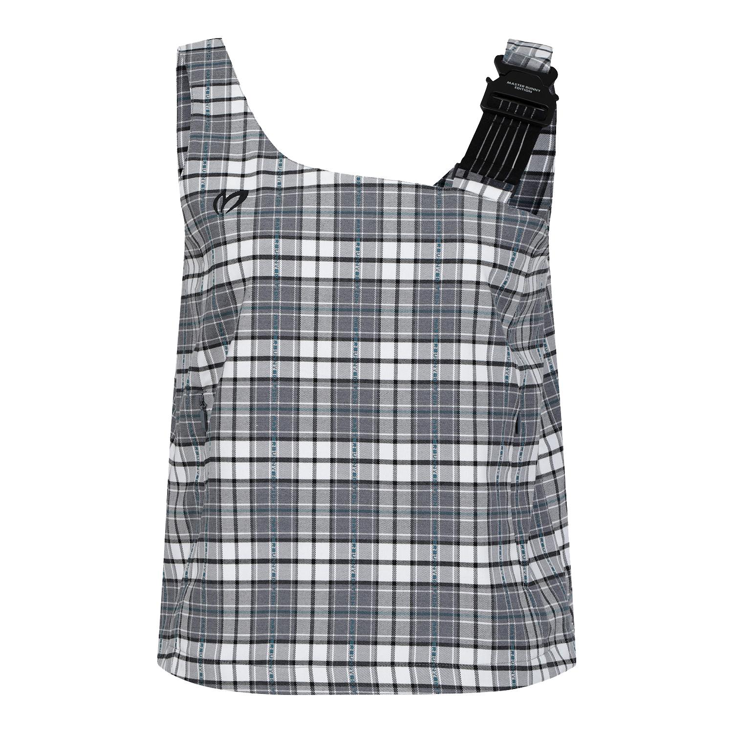 마스터바니 로고를 넣은 체크원단을 사용한변형 뷔스티에 베스트로 421D1PC191와 세트 착용에 용이언발란스한 어깨 비죠장식으로 포인트를 준 베스트.신축성이 좋은 체크패턴의 면혼방 소재.
