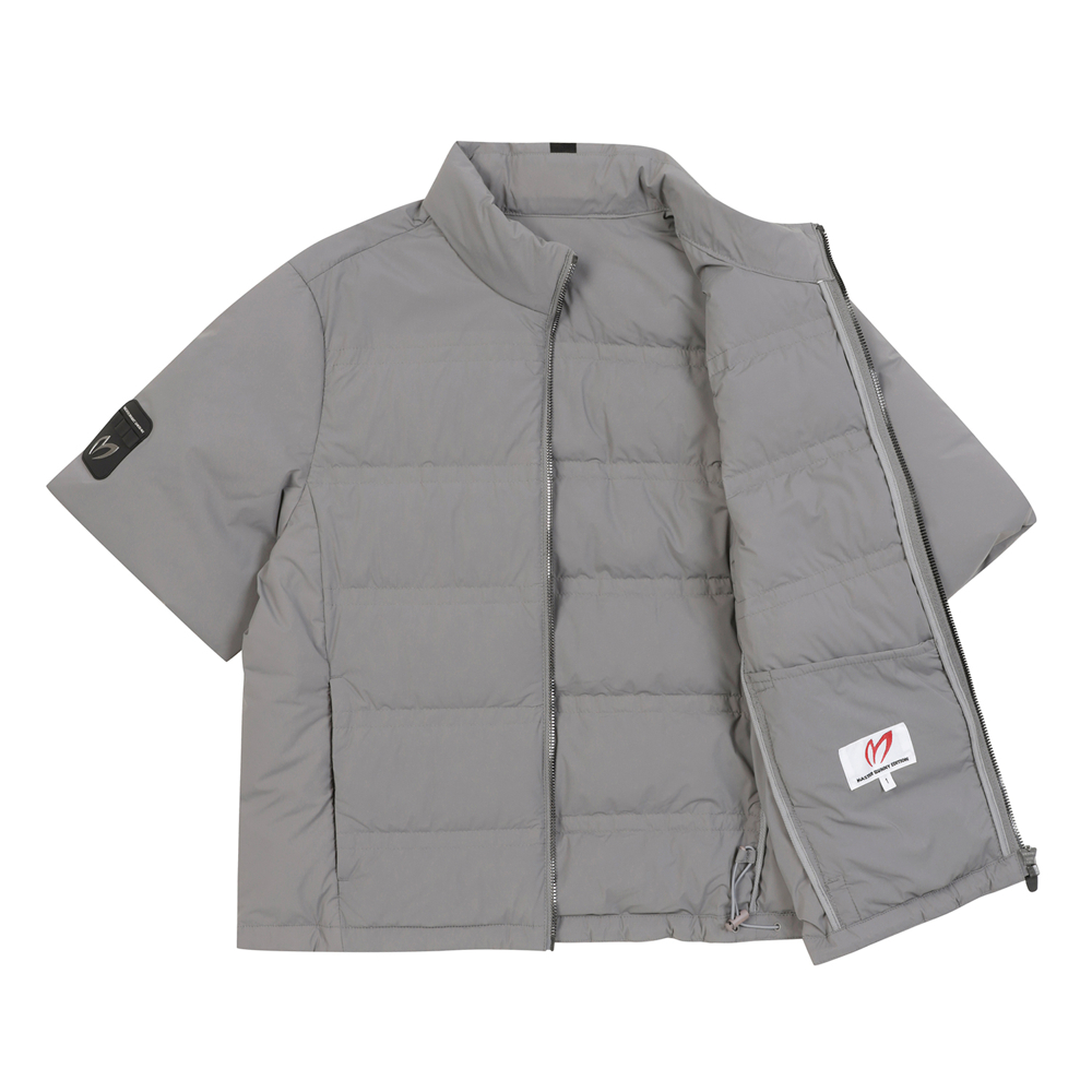 경량소재의 스트레치원단을 사용한 다운 반팔 점퍼로,봄 아침 라운딩 시 가볍게 착용하기 좋은 간절 다운 점퍼발수처리로 생활 오염을 방지해 주며 신축성이 좋고 다운프루프 기능이 있는 나일론 스판 소재를 활용.