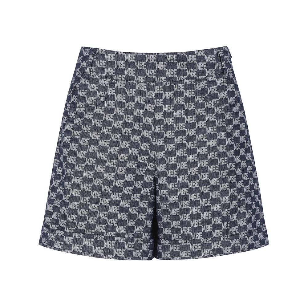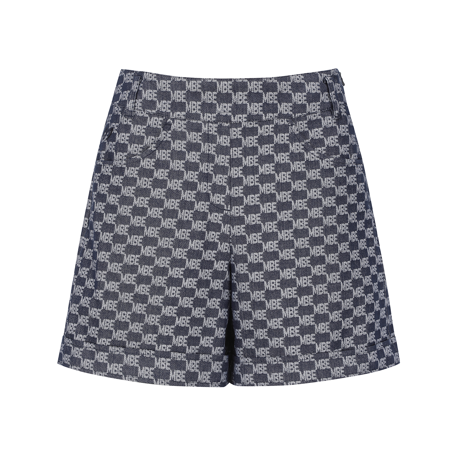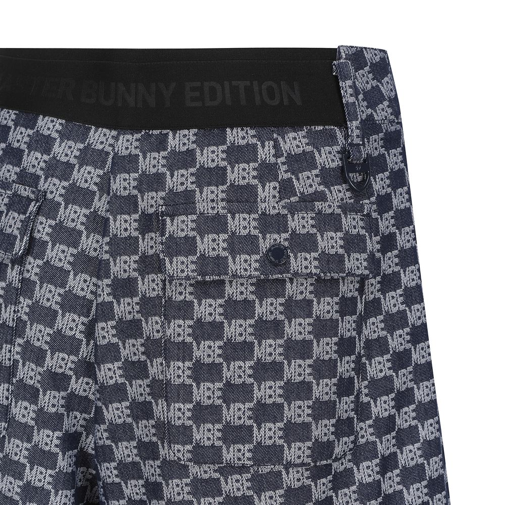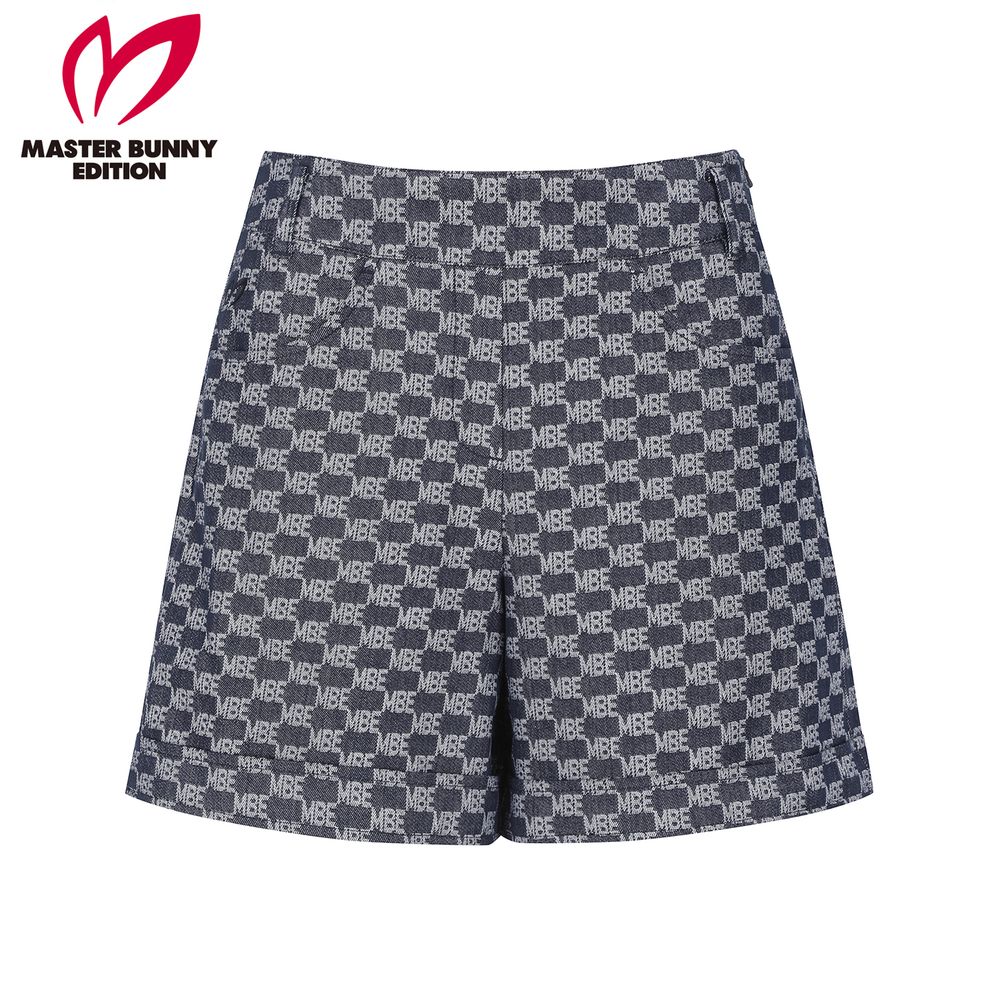 *전판 자가드 패턴 데님라이크 하이웨스트 A라인 반바지.전판 로고 자가드 데님라이크 소재를 사용한 S/PANTS오비 밴드 사용하여 활동성 높임. 421E1JV391 스타일과 셋업으로 코디 착장에 유용