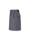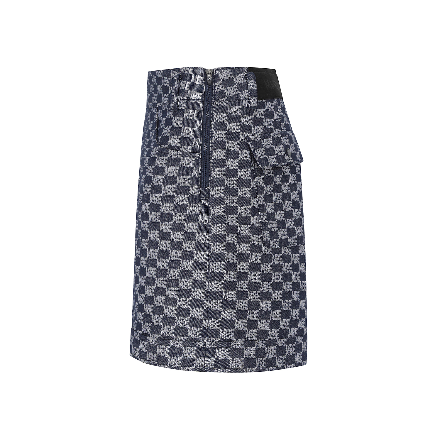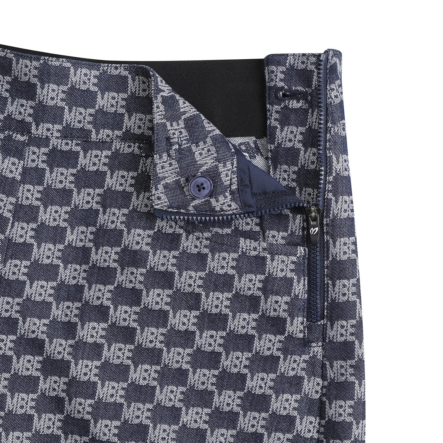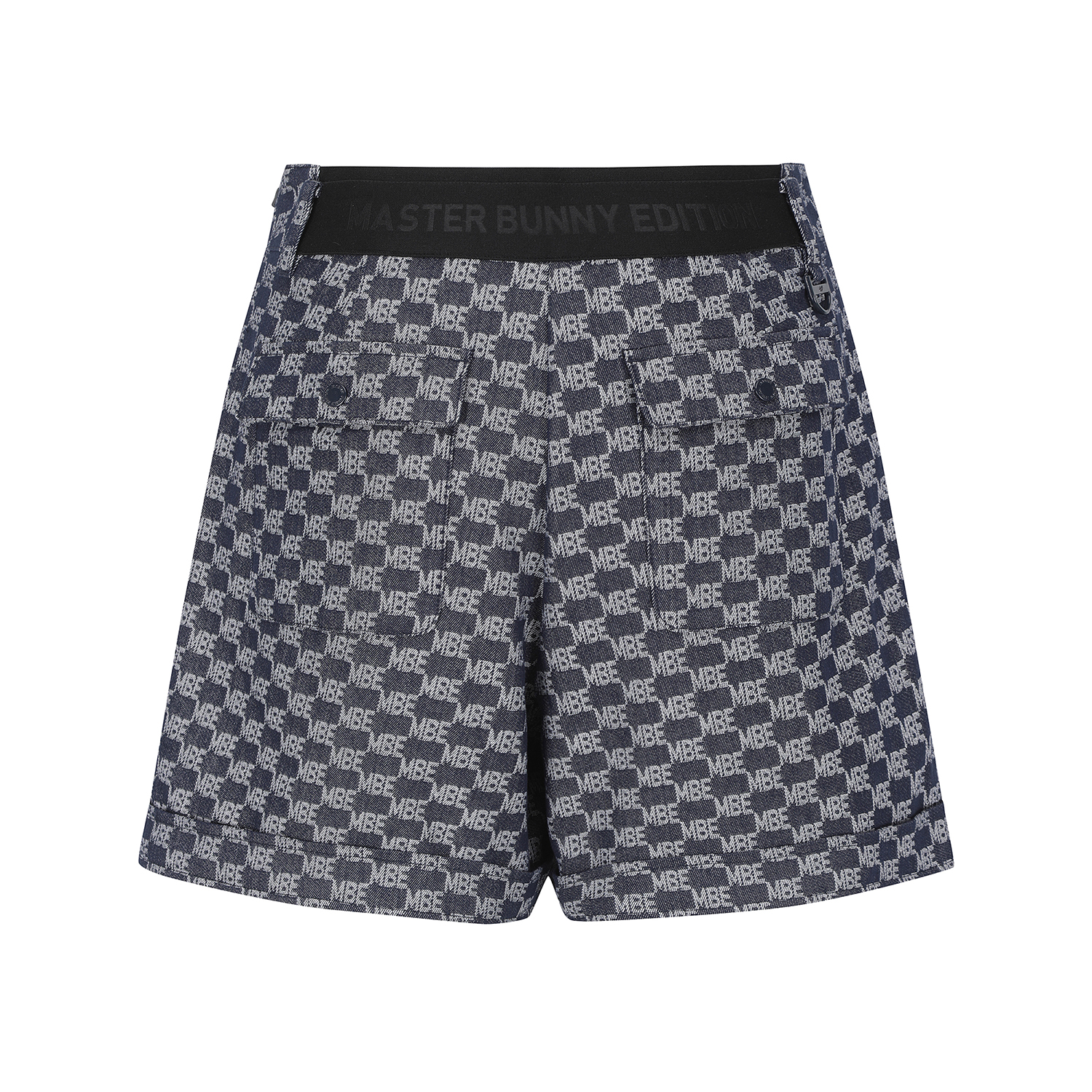 *전판 자가드 패턴 데님라이크 하이웨스트 A라인 반바지.전판 로고 자가드 데님라이크 소재를 사용한 S/PANTS오비 밴드 사용하여 활동성 높임. 421E1JV391 스타일과 셋업으로 코디 착장에 유용