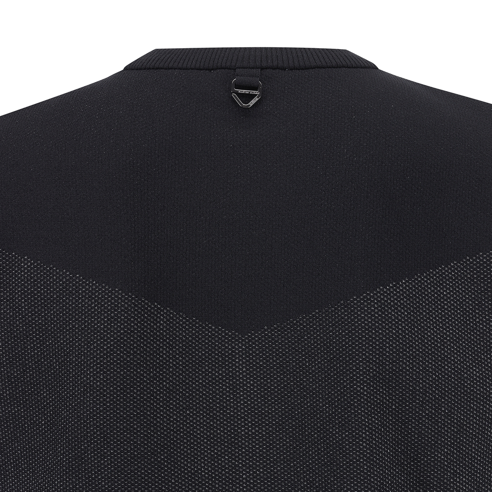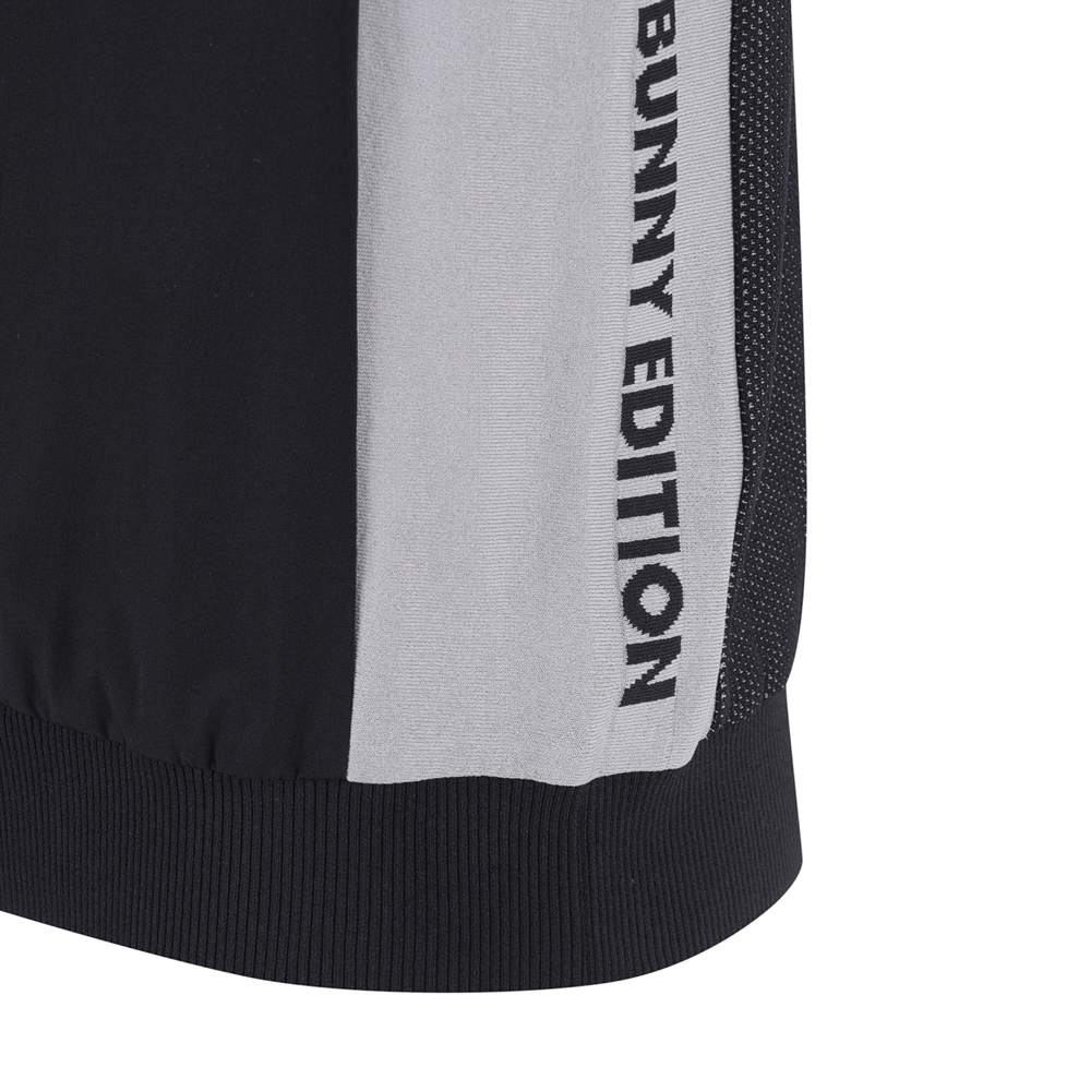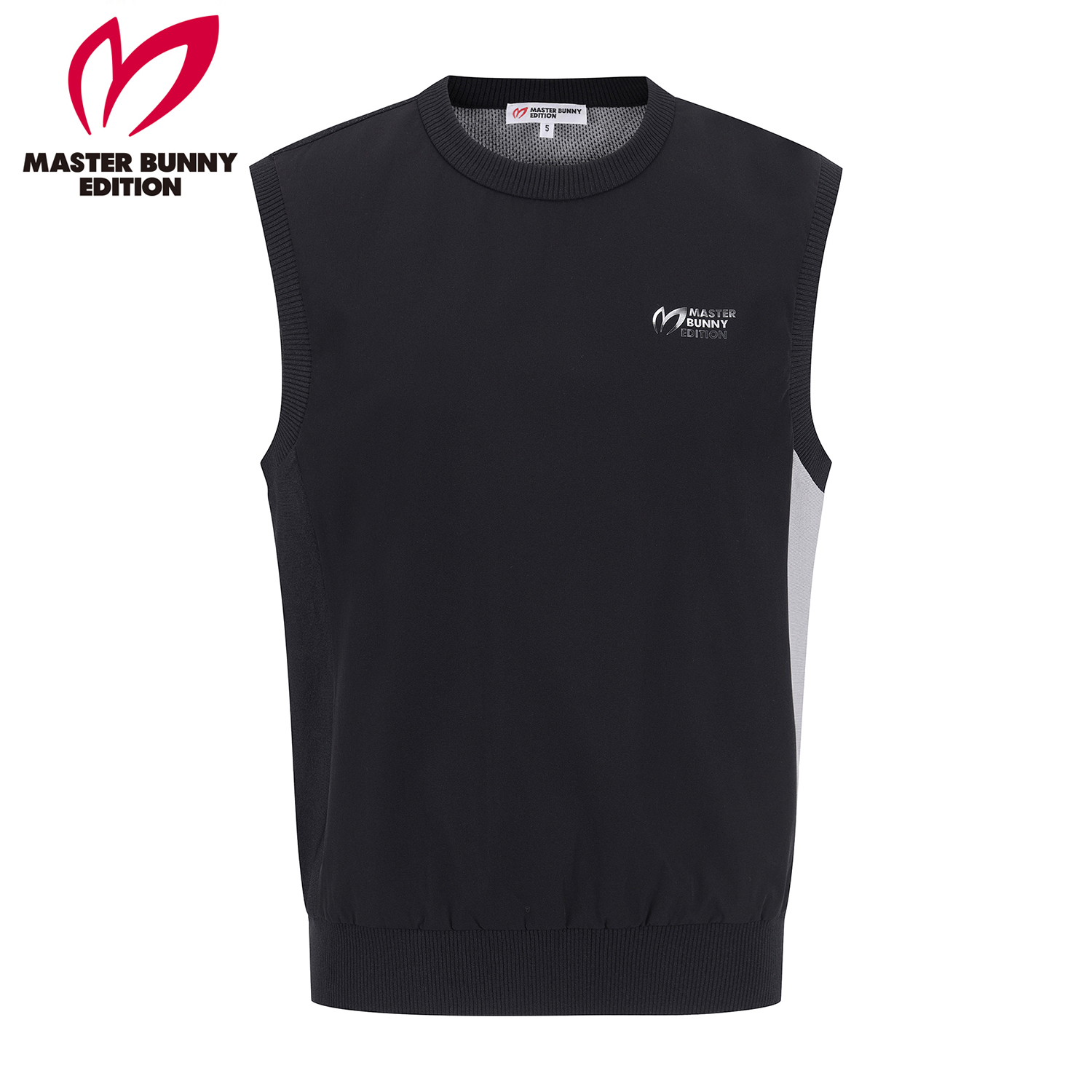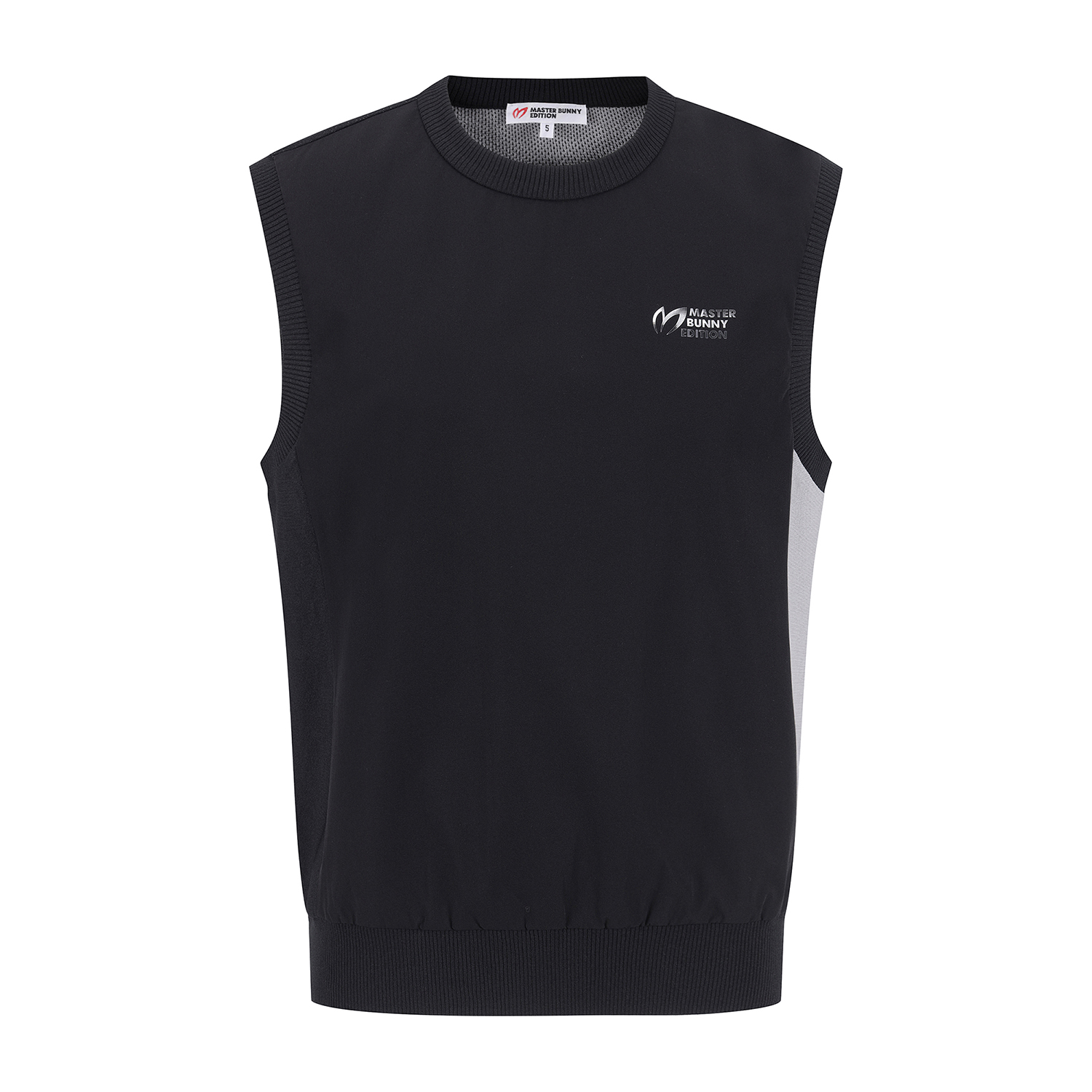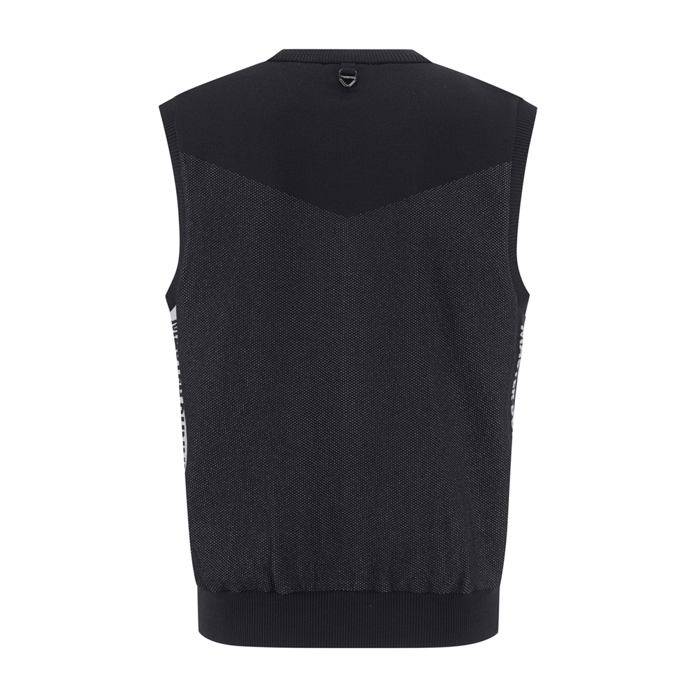 *투톤조직 라운드 베스트 스웨터투톤 조직감으로 편직한 니트에 경량 우븐 원단을 믹스한 제품.사이바 로고와 앞쪽 가슴 레터링으로 포인트를 준 제품.