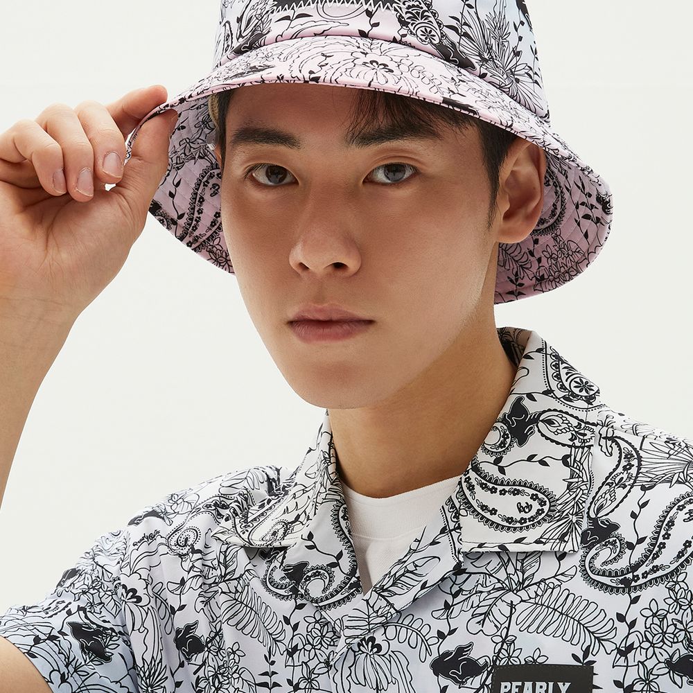 페이즐리 패턴 UNI 버킷햇. 탈부착 로고 프린트 턱끈 포함.?SET → 521D1TR182, 521D1PS182