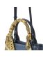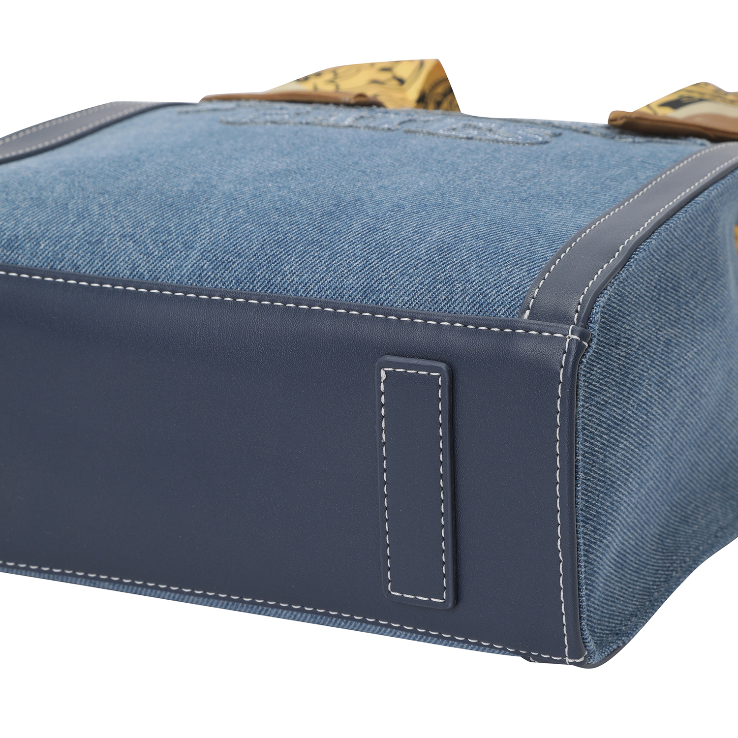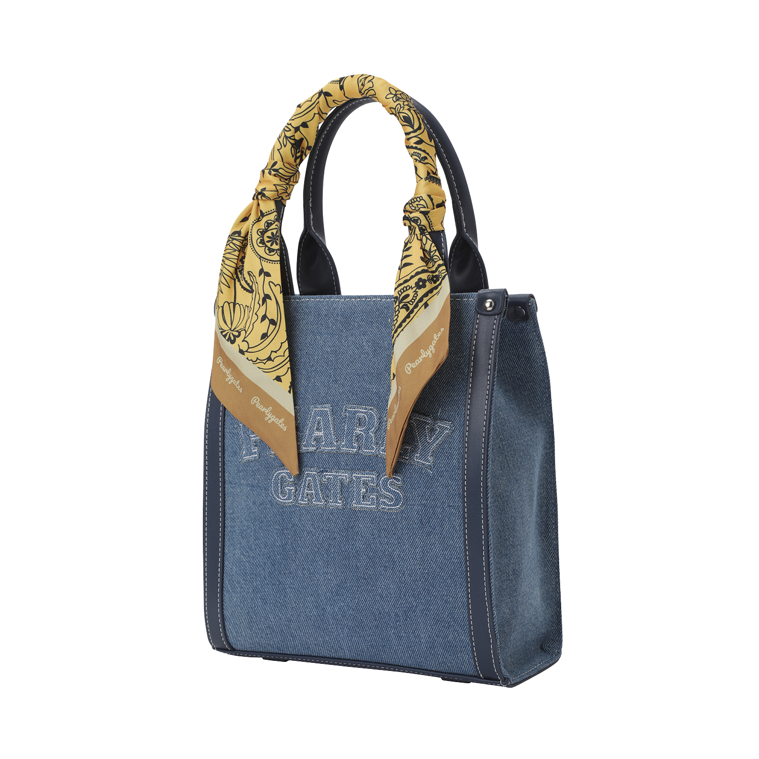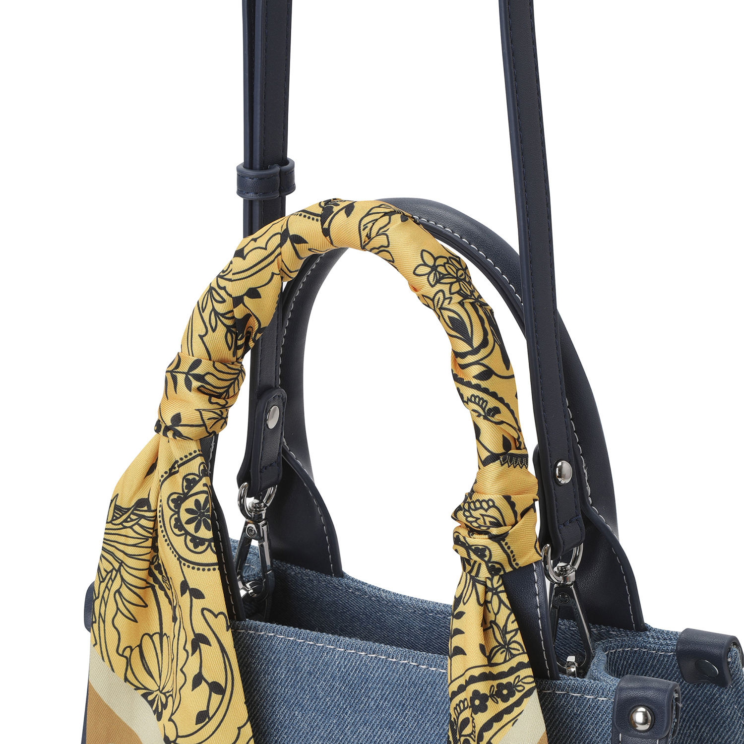 페이즐리 패턴 실크 스카프가 포인트인 데님 토트백. 어깨끈 포함.