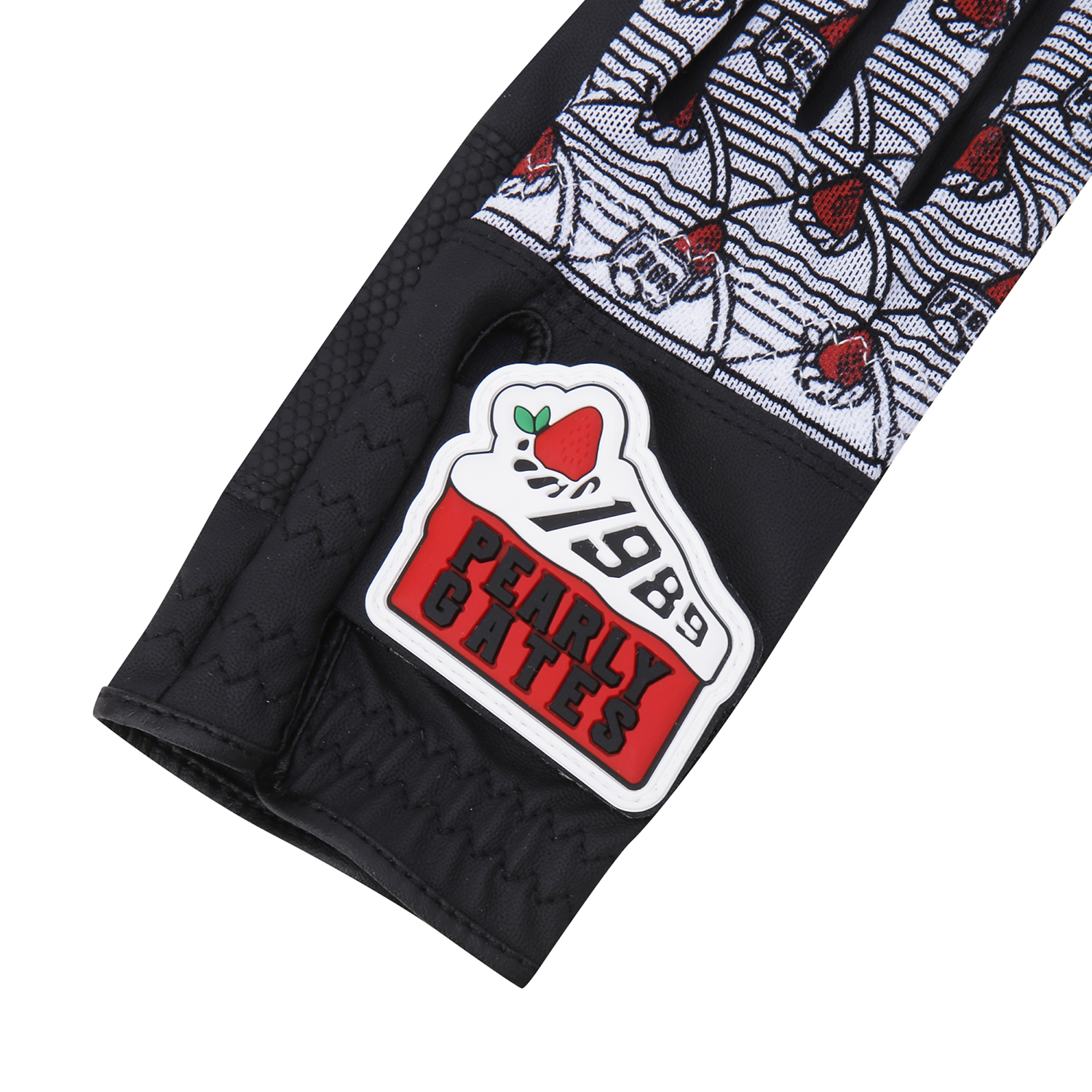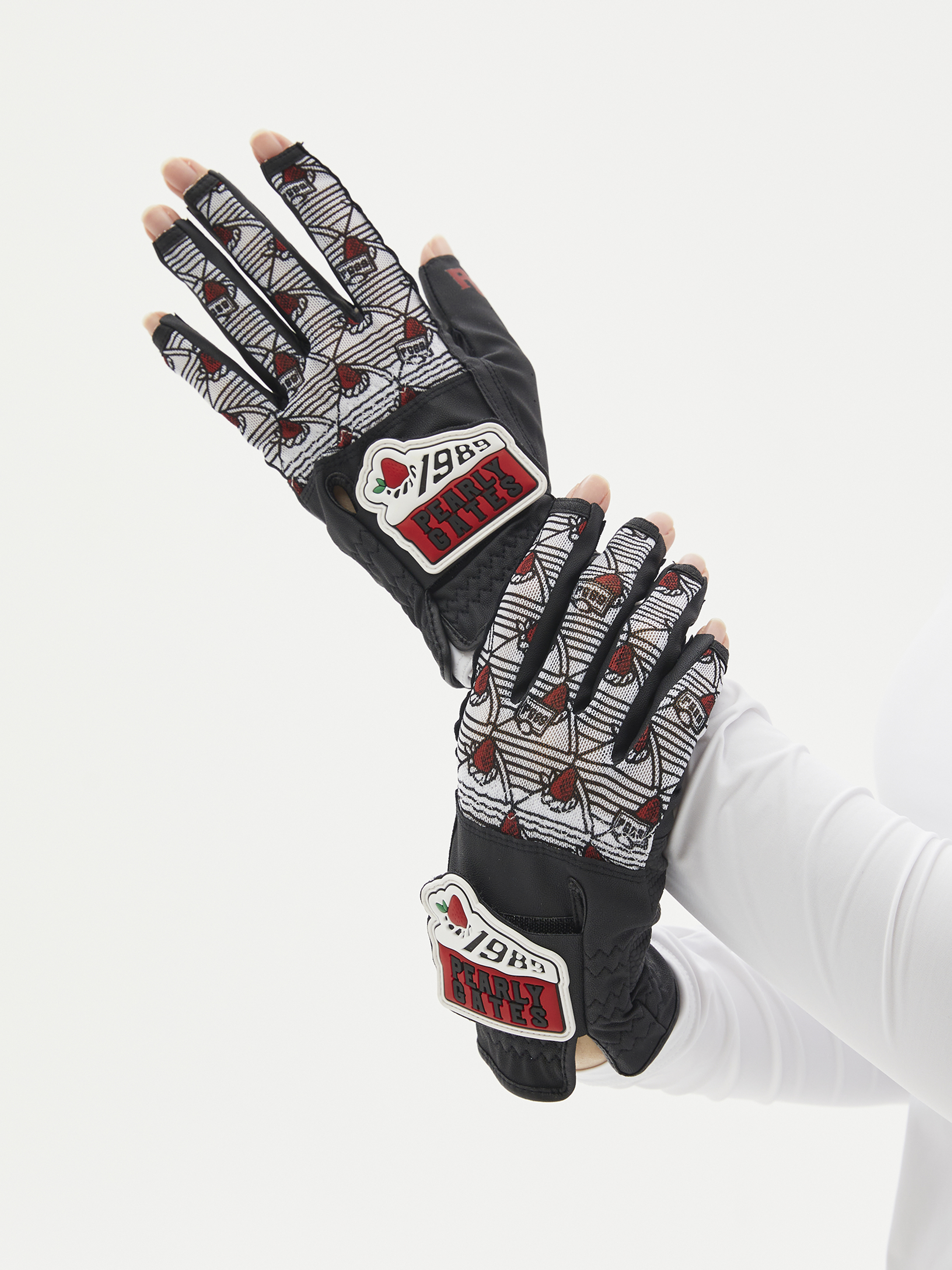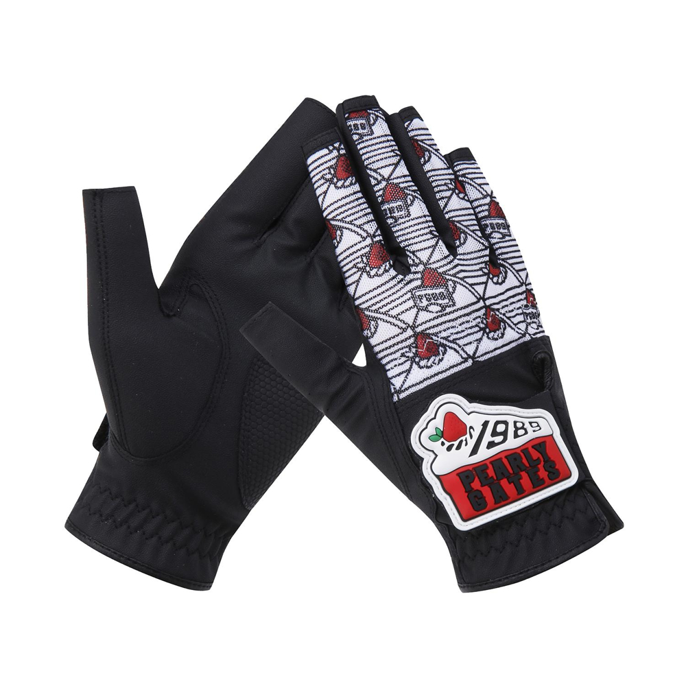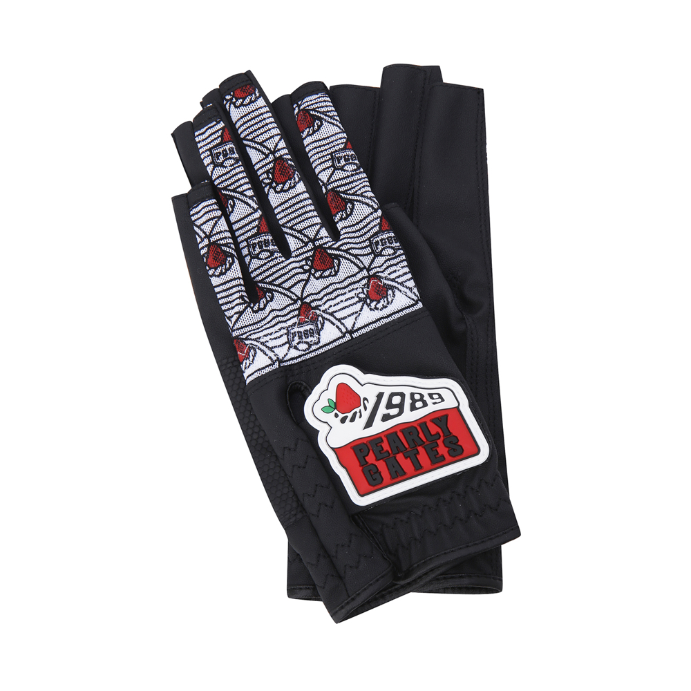 CHEERS 테마 패턴 여성 네일컷 양손 장갑.손등 메쉬 & 부분 합피 소재 적용.케이크 로고 와펜 디테일.