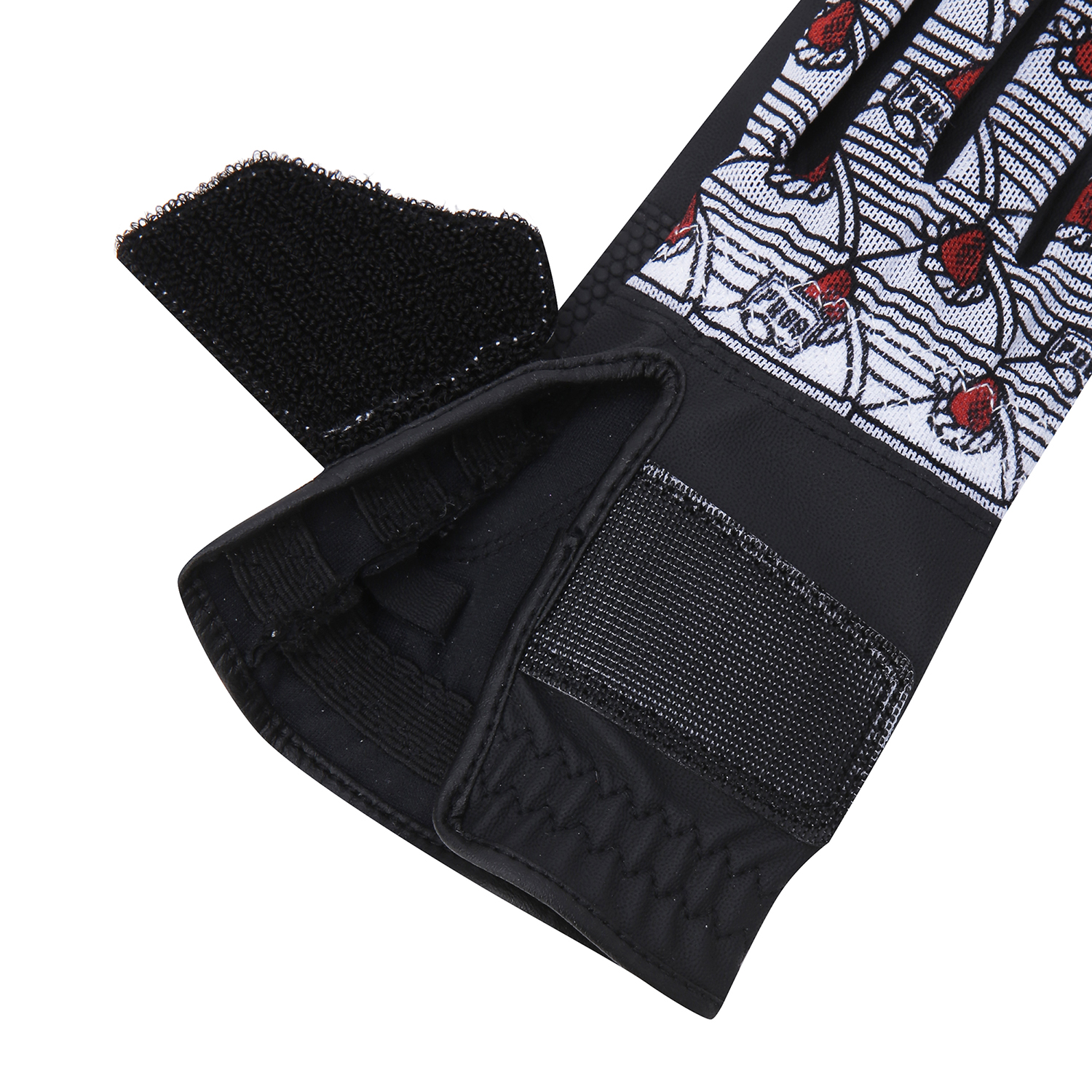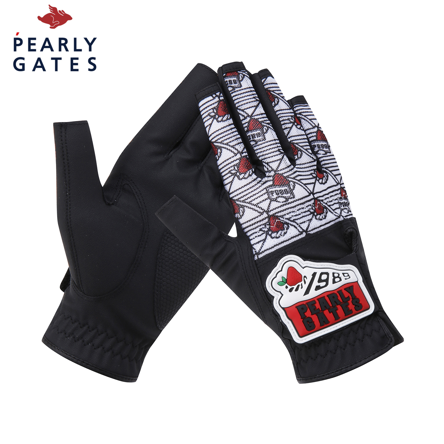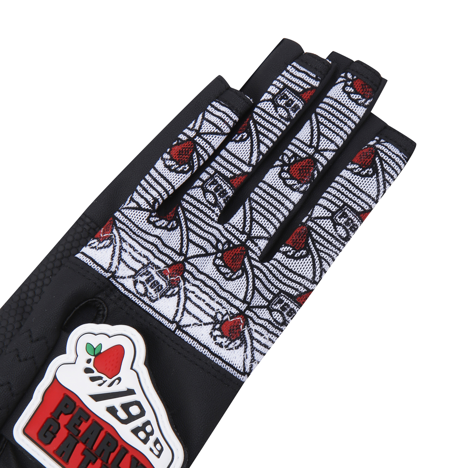 CHEERS 테마 패턴 여성 네일컷 양손 장갑.손등 메쉬 & 부분 합피 소재 적용.케이크 로고 와펜 디테일.