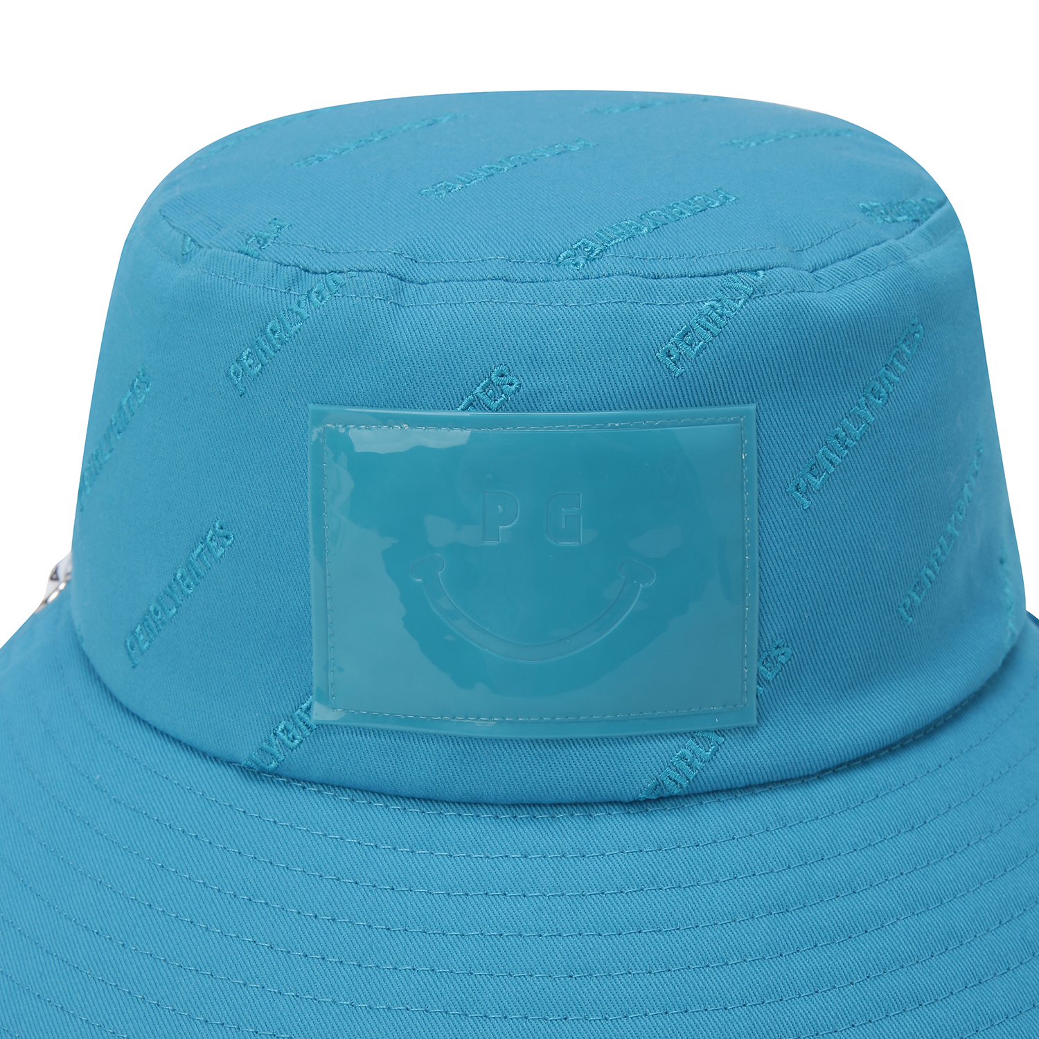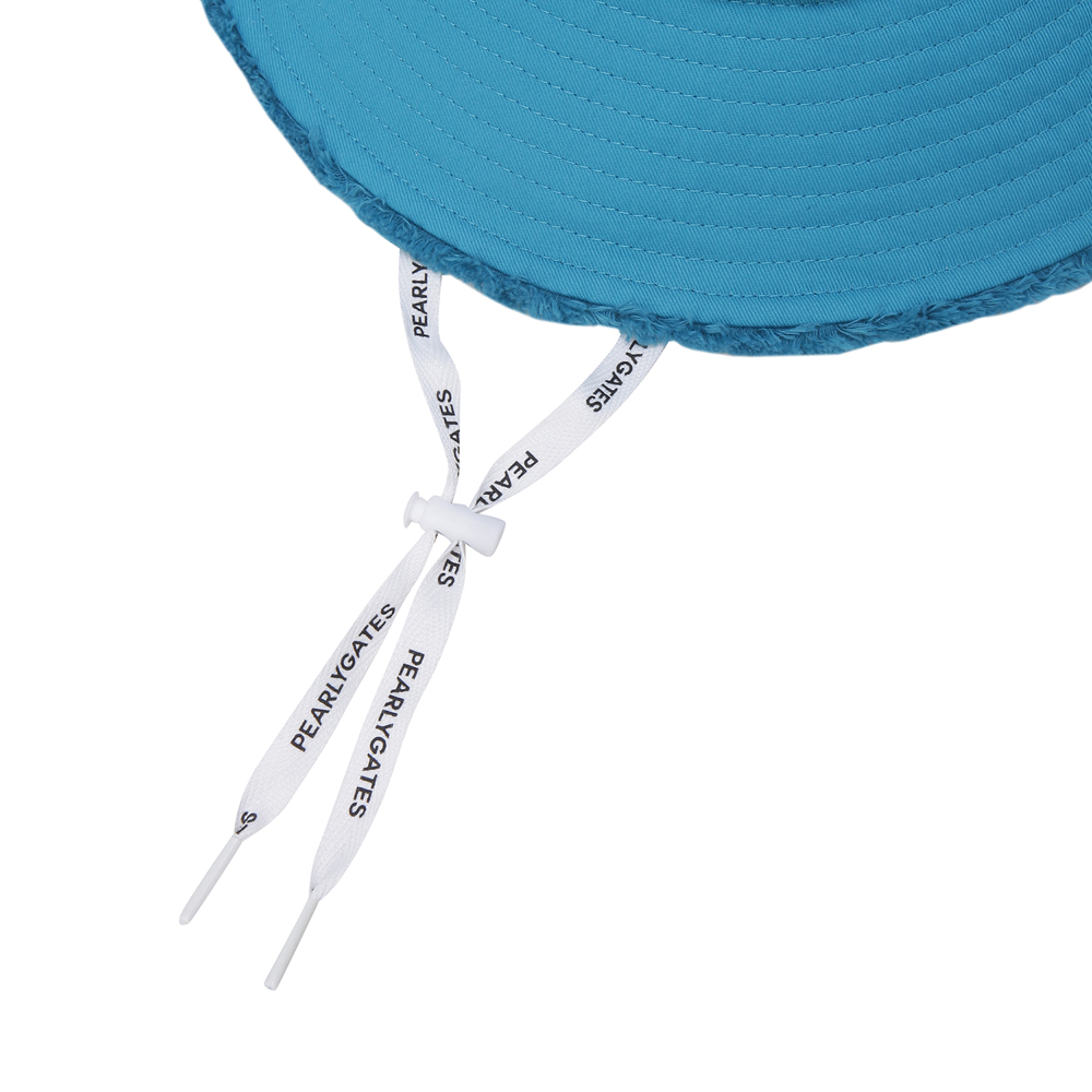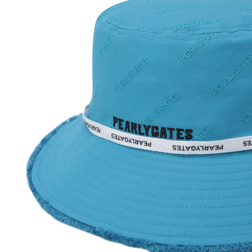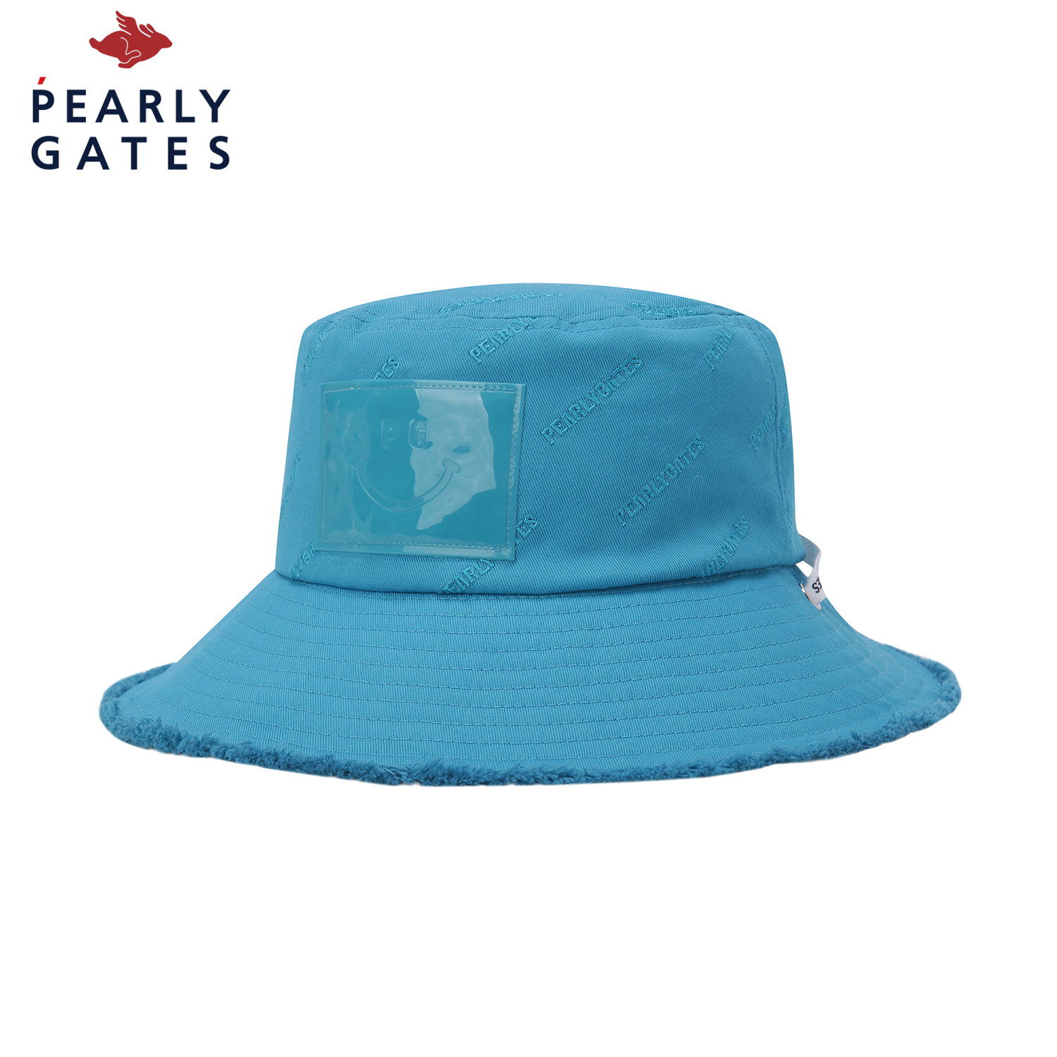 AQUA JUNGLE 테마 젤리 스마일 와펜 포인트 여성 버킷햇.전판 로고 자수 디테일 적용.로고 프린트 턱끈 포함.