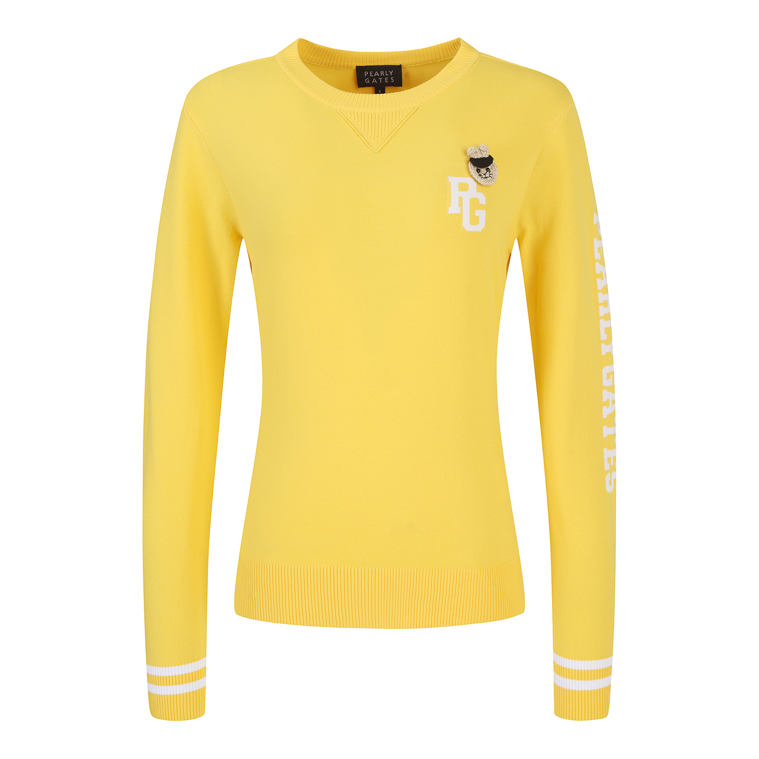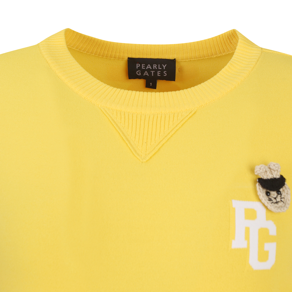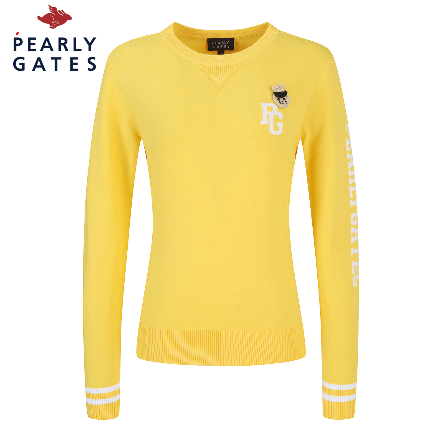 신축성 좋은 레이온 혼방 소재로 솔리드 컬러에 소매 로고 포인트를 준 라운드넥. 니트 풀오버 가슴에 탈착 가능한 토끼 브로치와 네크에 삼각무를 덧대어 캐쥬얼한 무드를 살림
