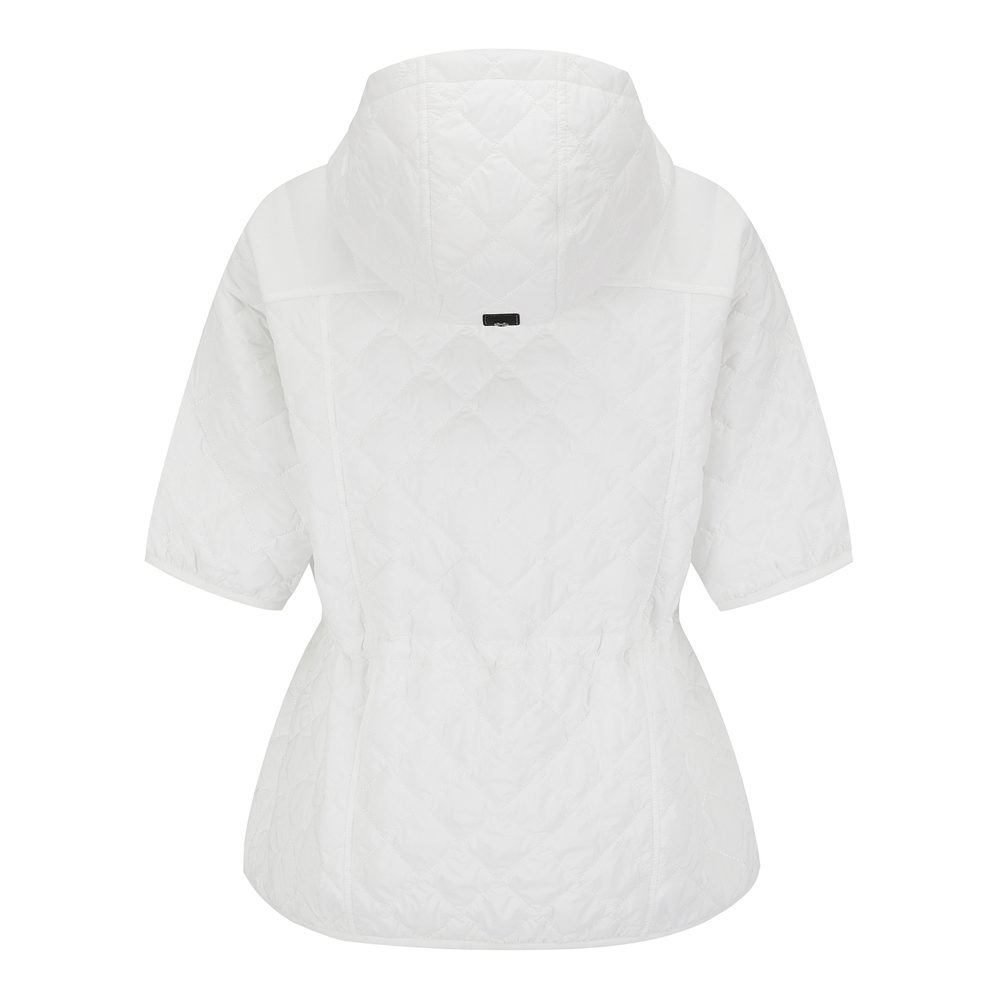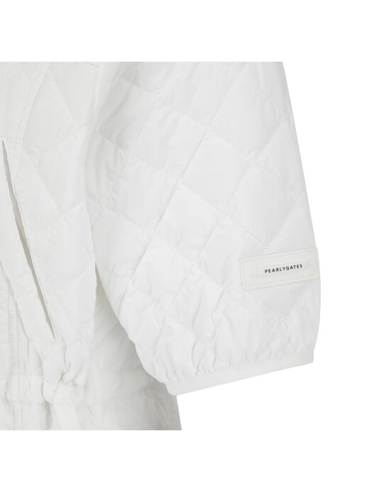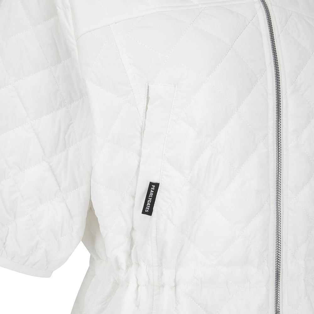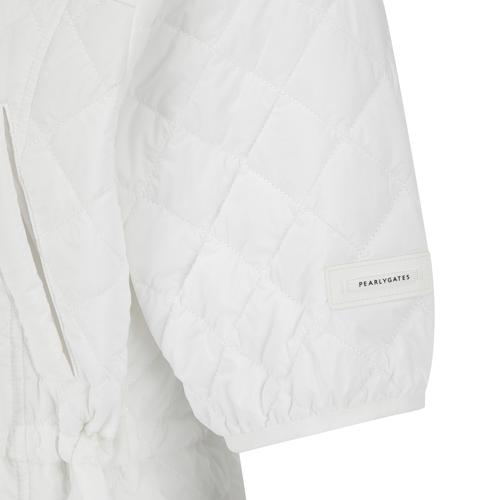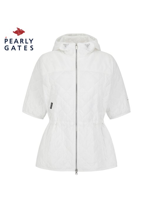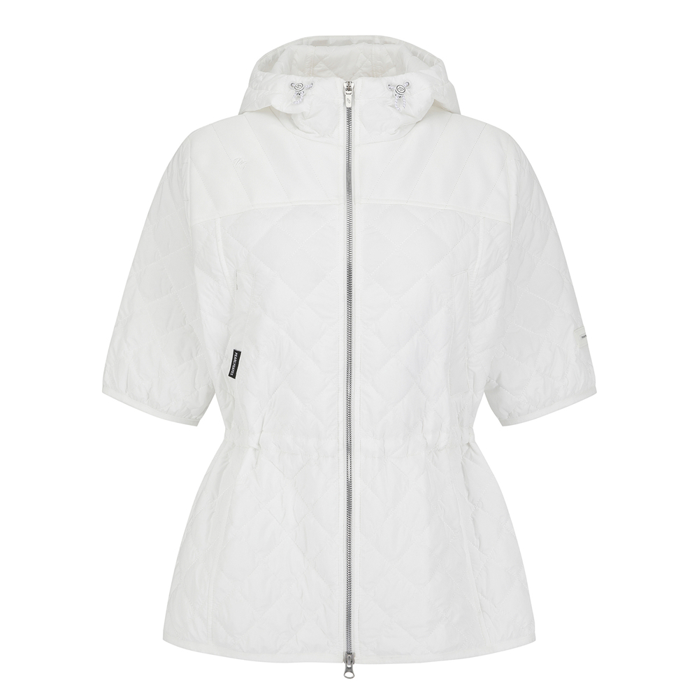 퀼팅 반소매 후드 점퍼.팔꿈치를 조금 덮는 반소매 기장의 허리를 조일 수 있는 후드 퀼팅 점퍼.어깨부분은 져지원단을 사용하여 움직임이 편하고, 후드 고정 스냅이 달려있어 스윙 시에도 방해받지 않음.허리를 조여서 패딩이지만 날씬하게 체형커버가 가능함.팔꿈치에 딱 걸리지 않아 착용시 팔 움직이기 편안함.테마: I♡PG