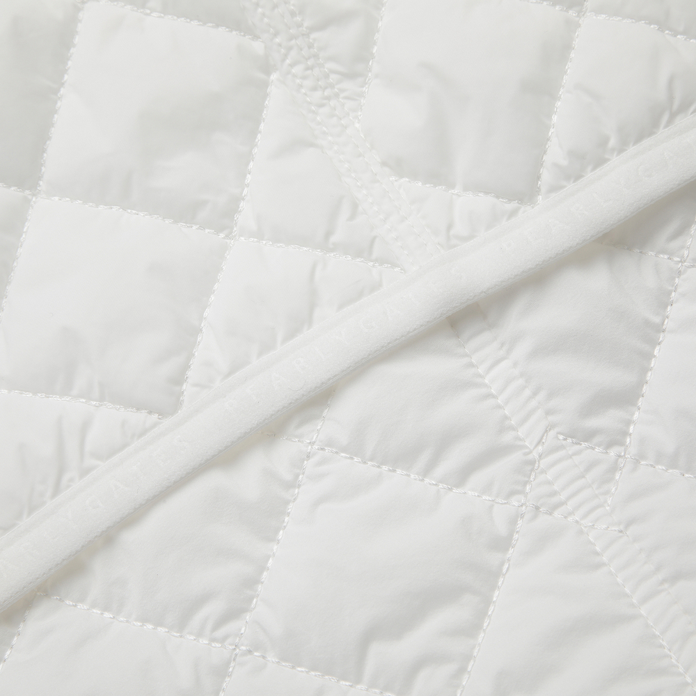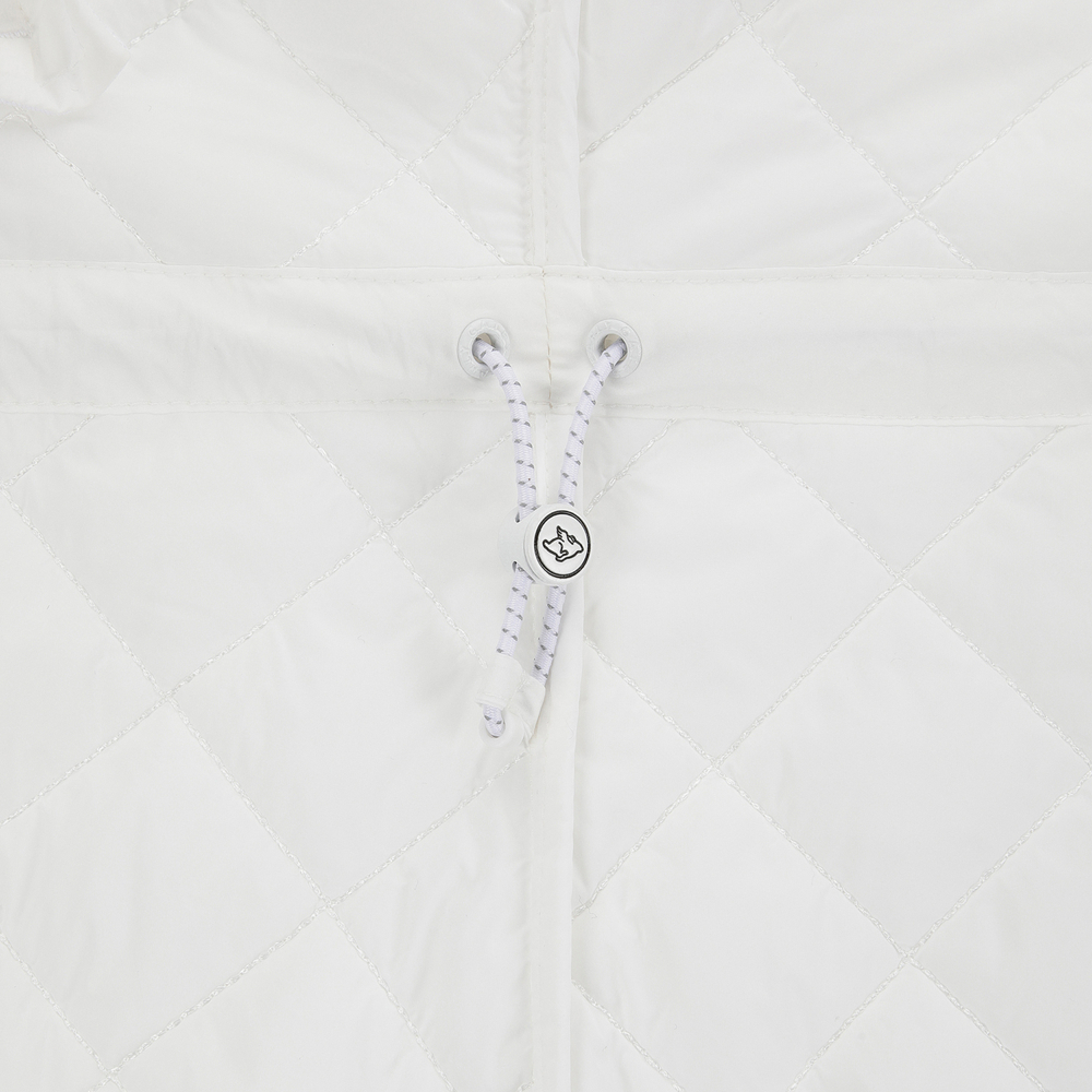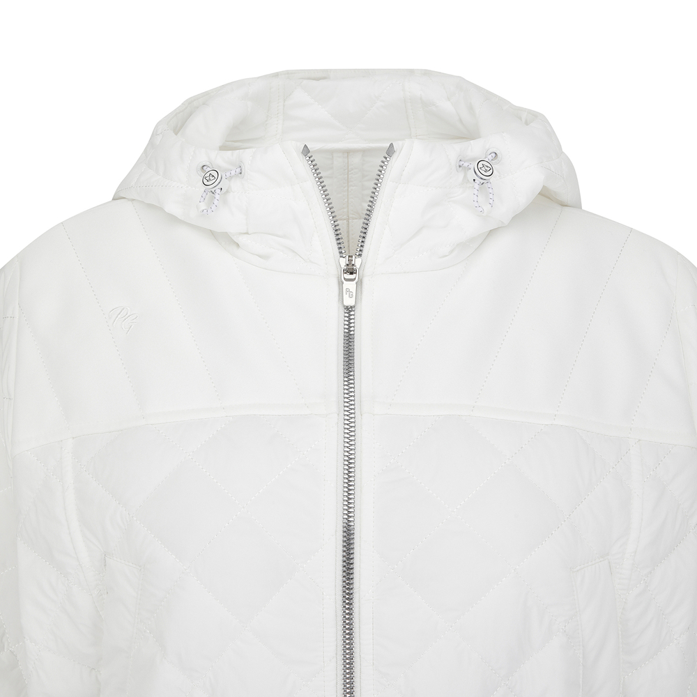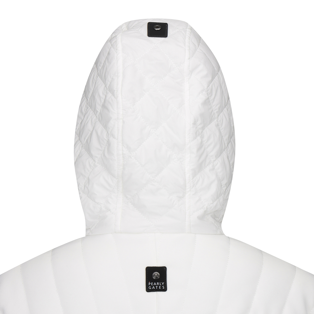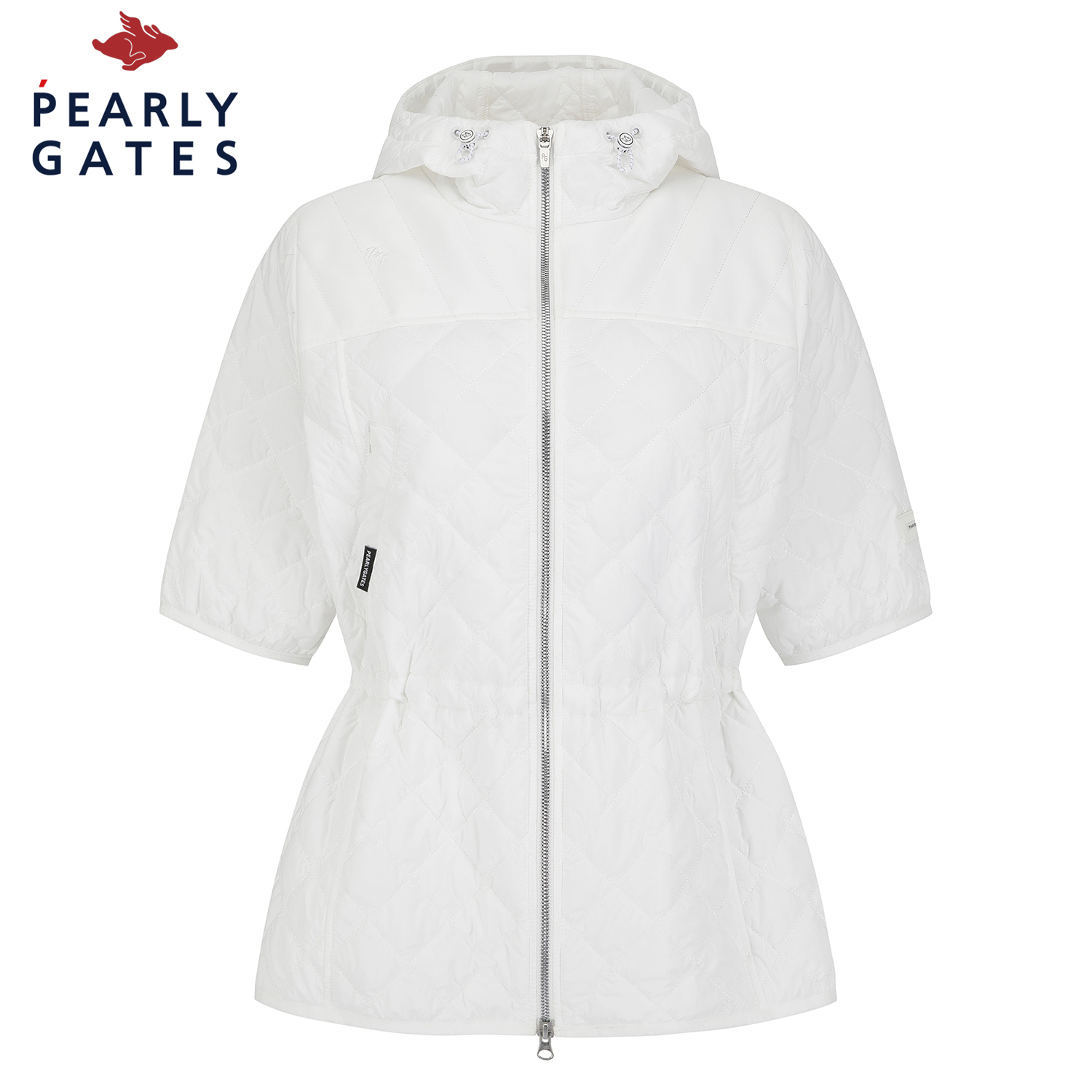 퀼팅 반소매 후드 점퍼.팔꿈치를 조금 덮는 반소매 기장의 허리를 조일 수 있는 후드 퀼팅 점퍼.어깨부분은 져지원단을 사용하여 움직임이 편하고, 후드 고정 스냅이 달려있어 스윙 시에도 방해받지 않음.허리를 조여서 패딩이지만 날씬하게 체형커버가 가능함.팔꿈치에 딱 걸리지 않아 착용시 팔 움직이기 편안함.테마: I♡PG